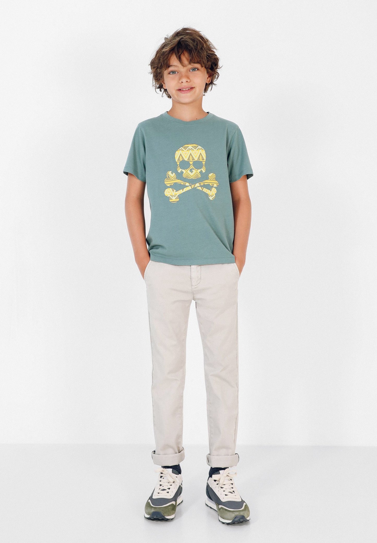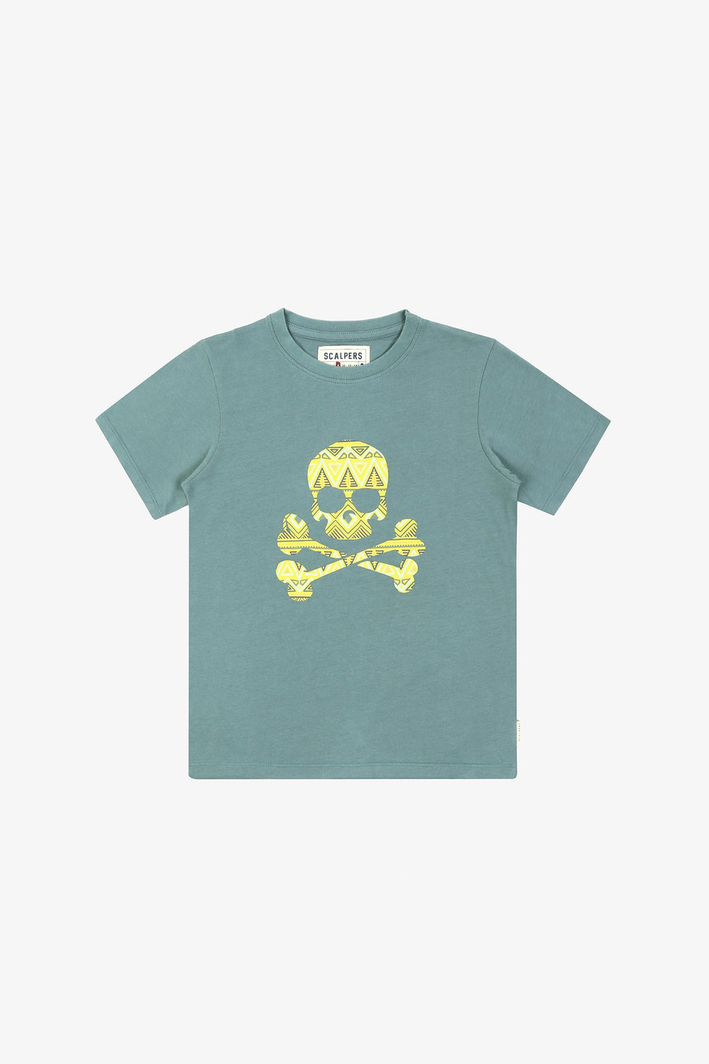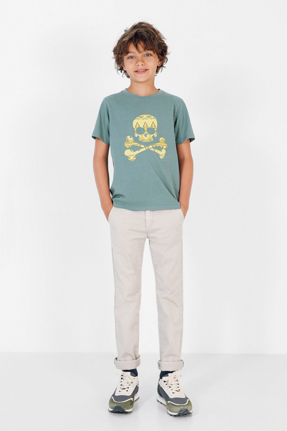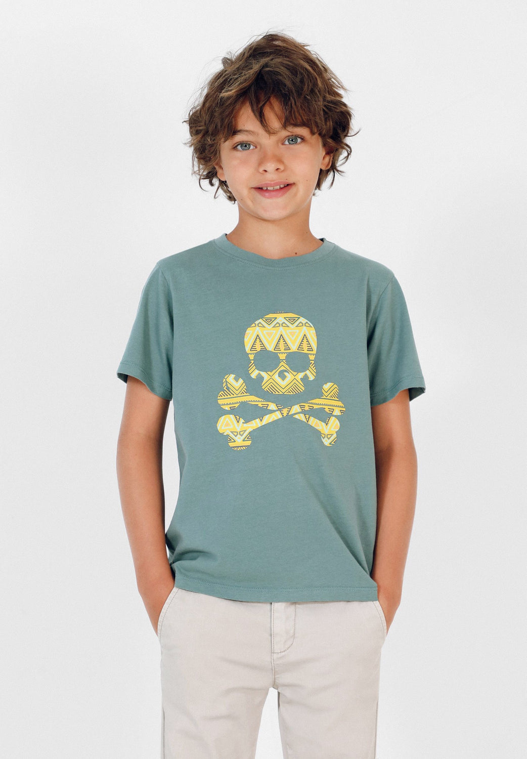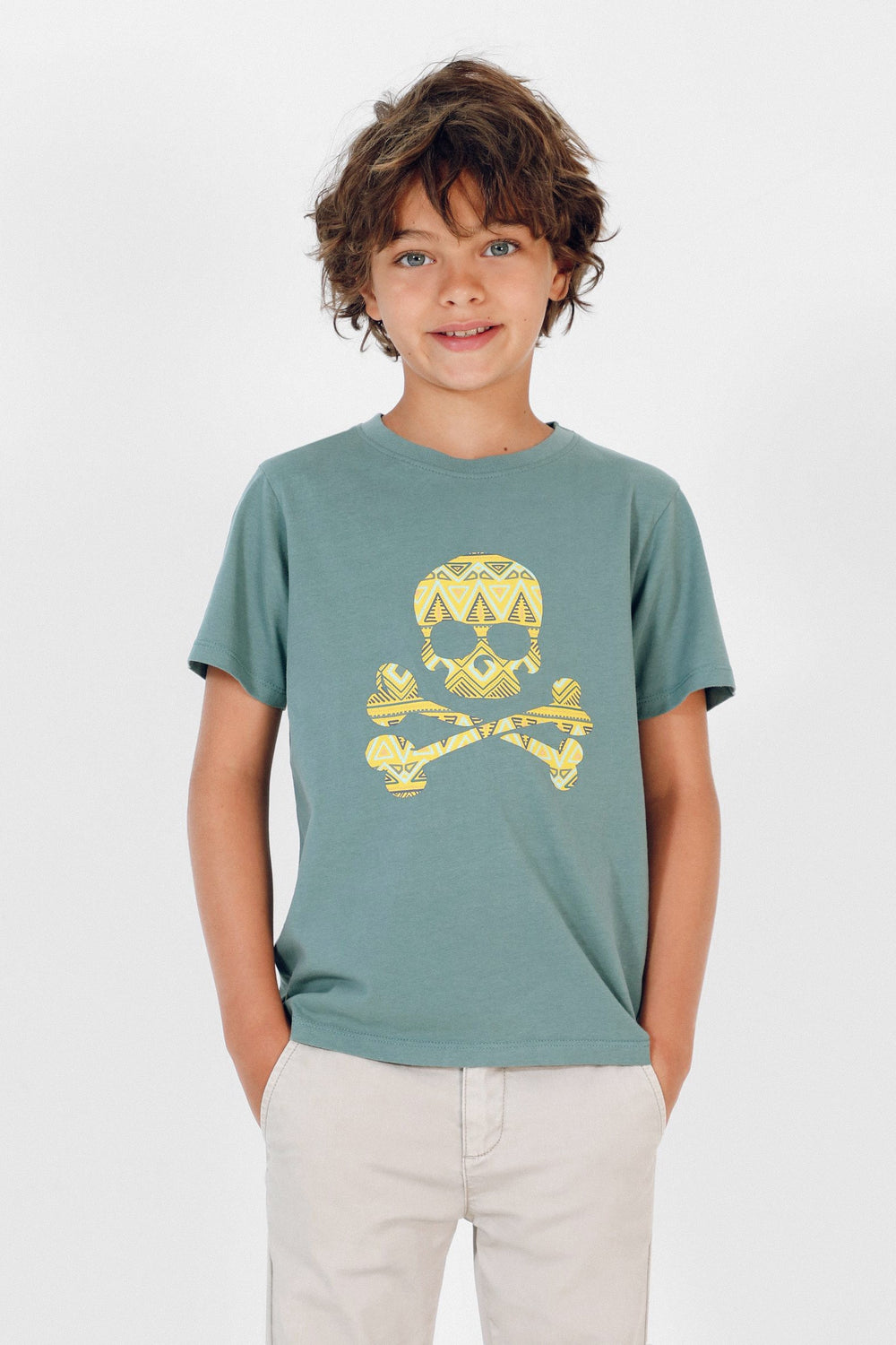 Camiseta confeccionada en tejido 100% algodón orgánico. Corte Regular Fit, cuello redondo y manga corta. Detalle de print de calavera con motivo étnico.