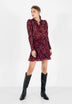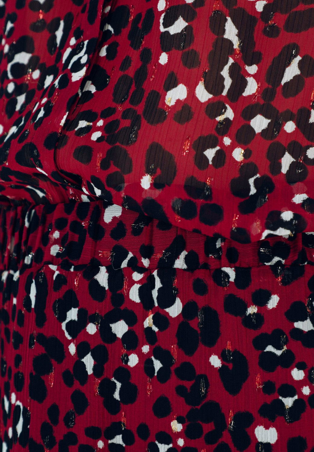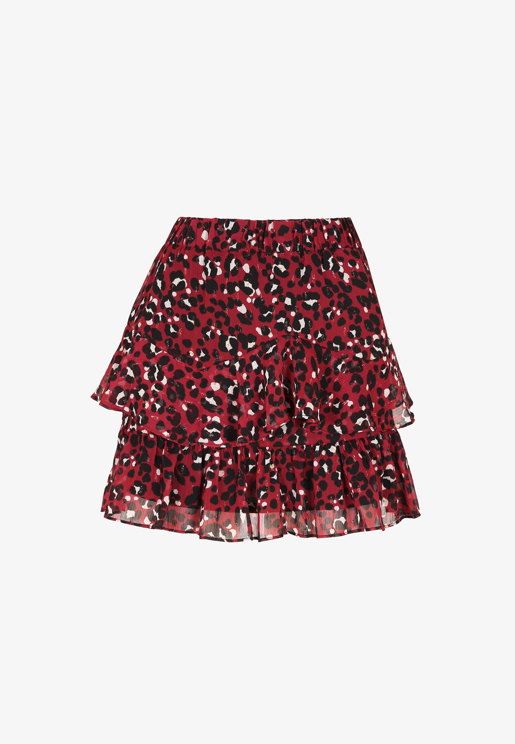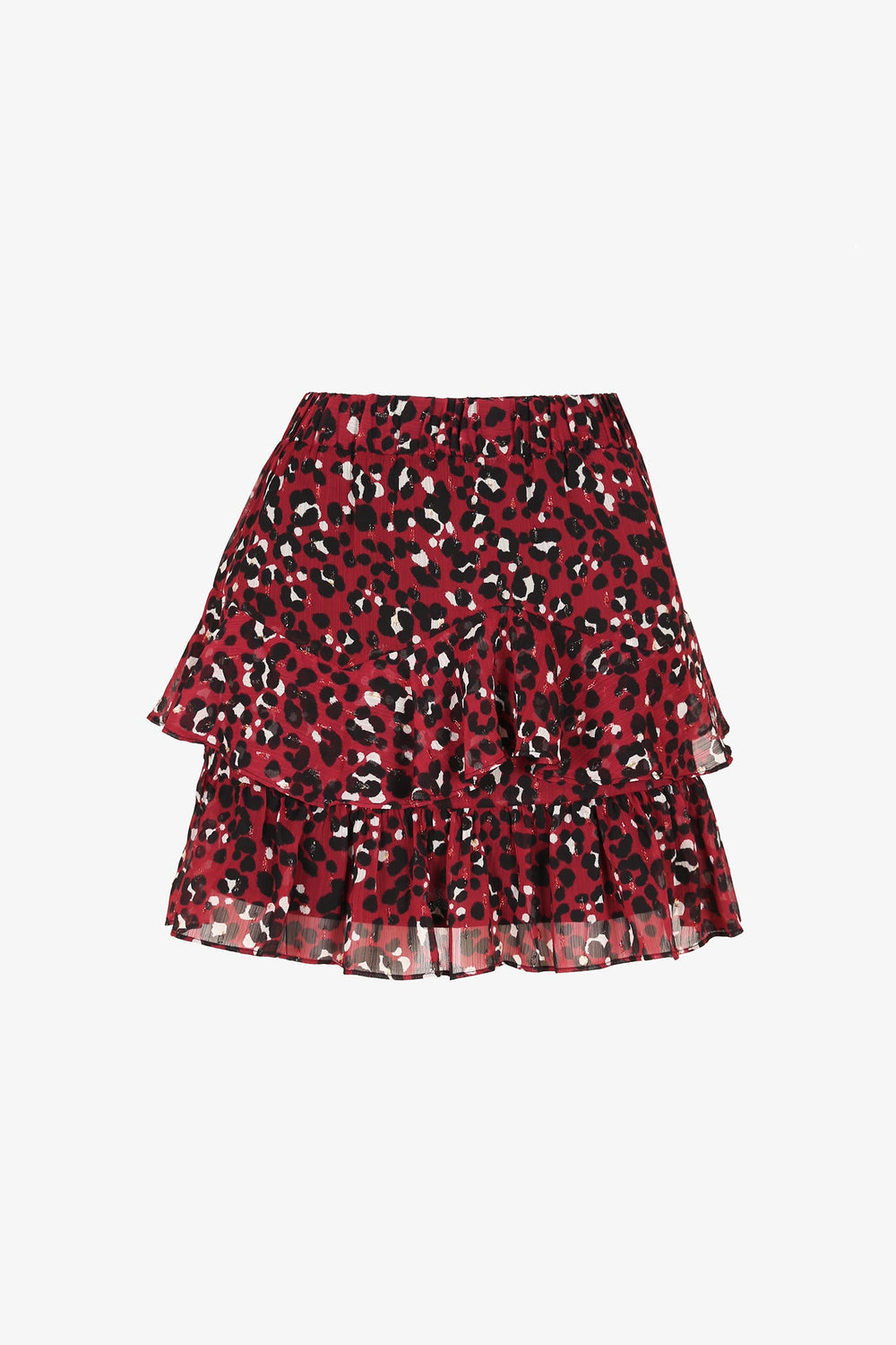 Falda mini con estampado animal confeccionada en tejido con hilos metálicos. Corte Slim Fit, cierre con cremallera y doble volante.