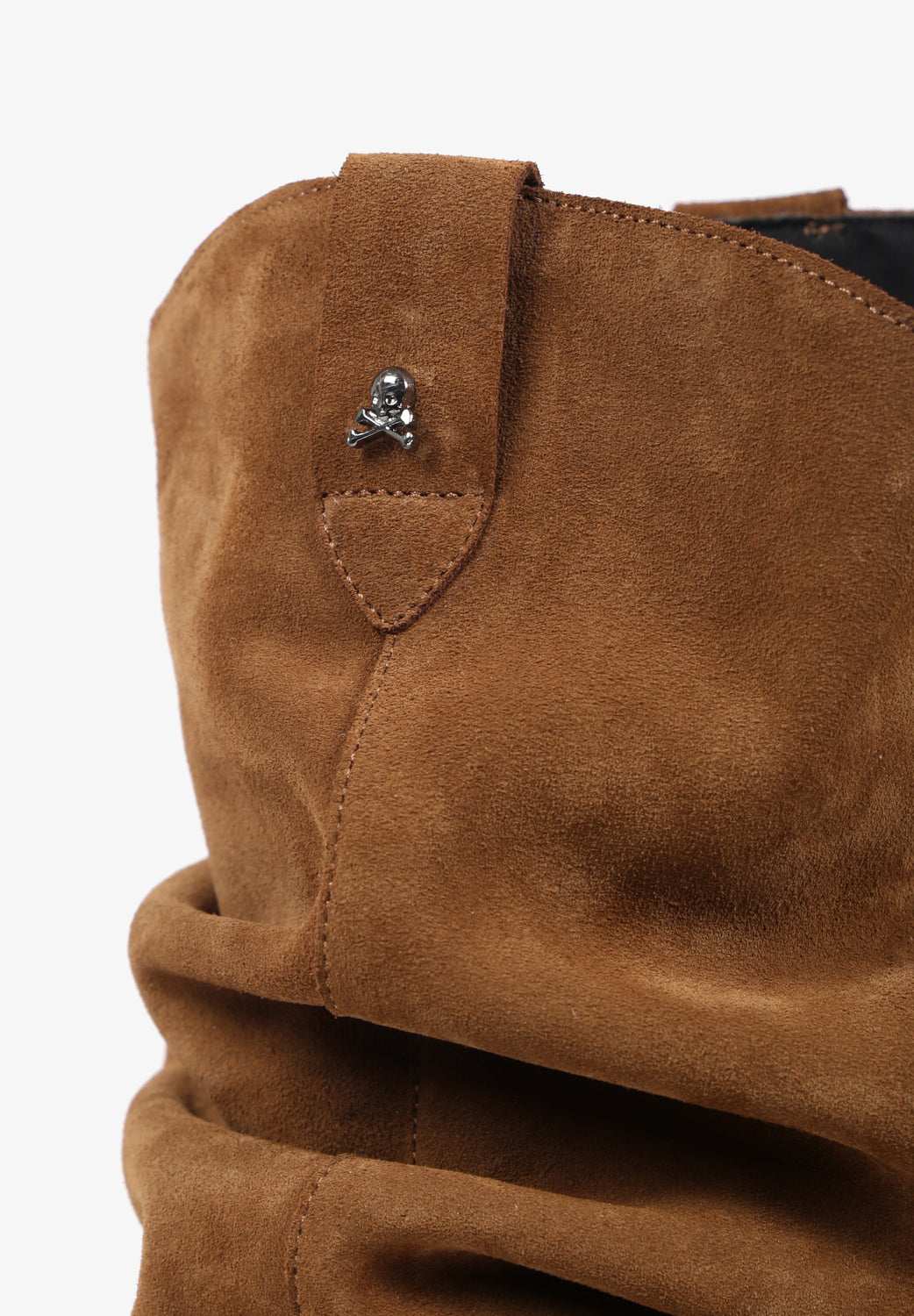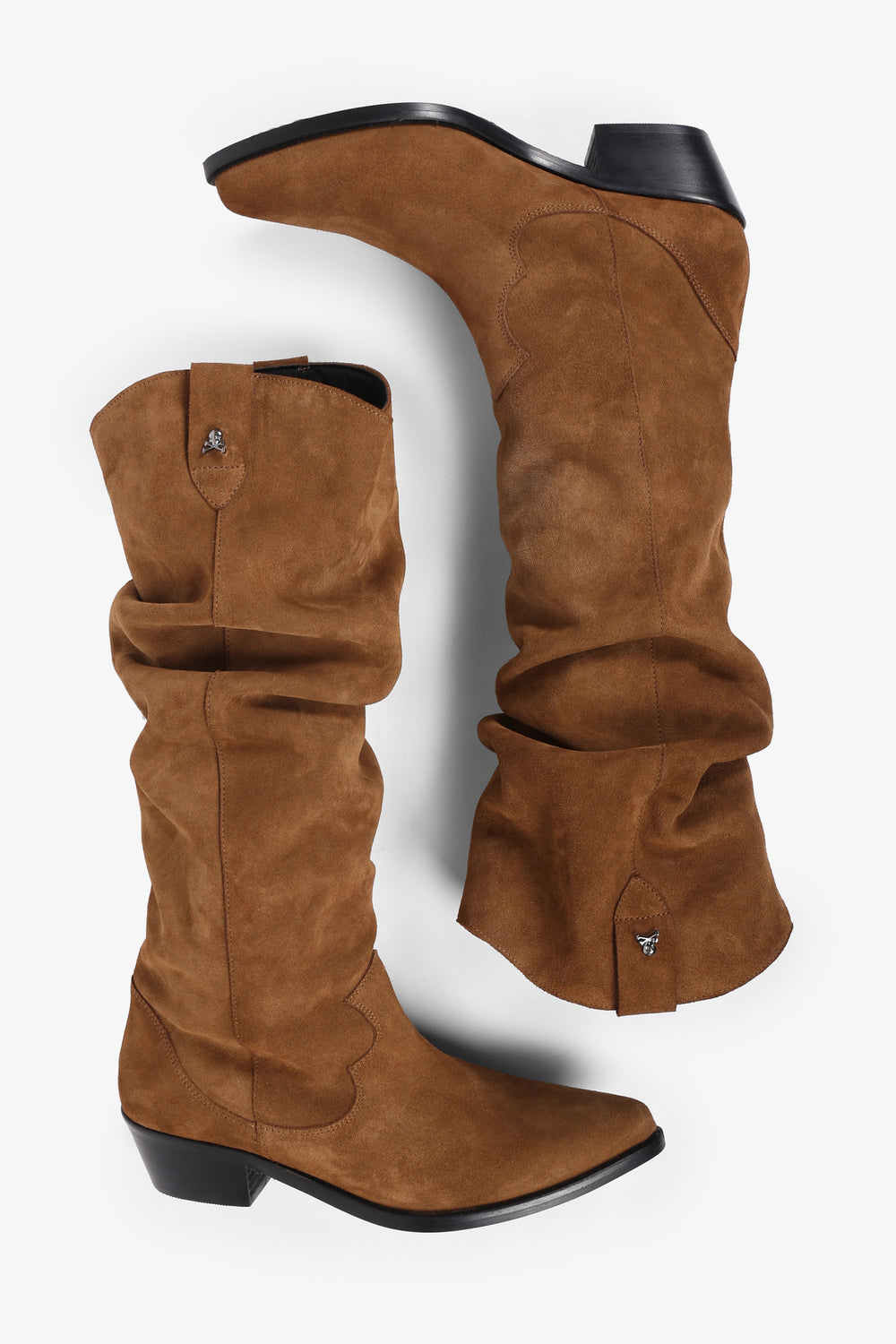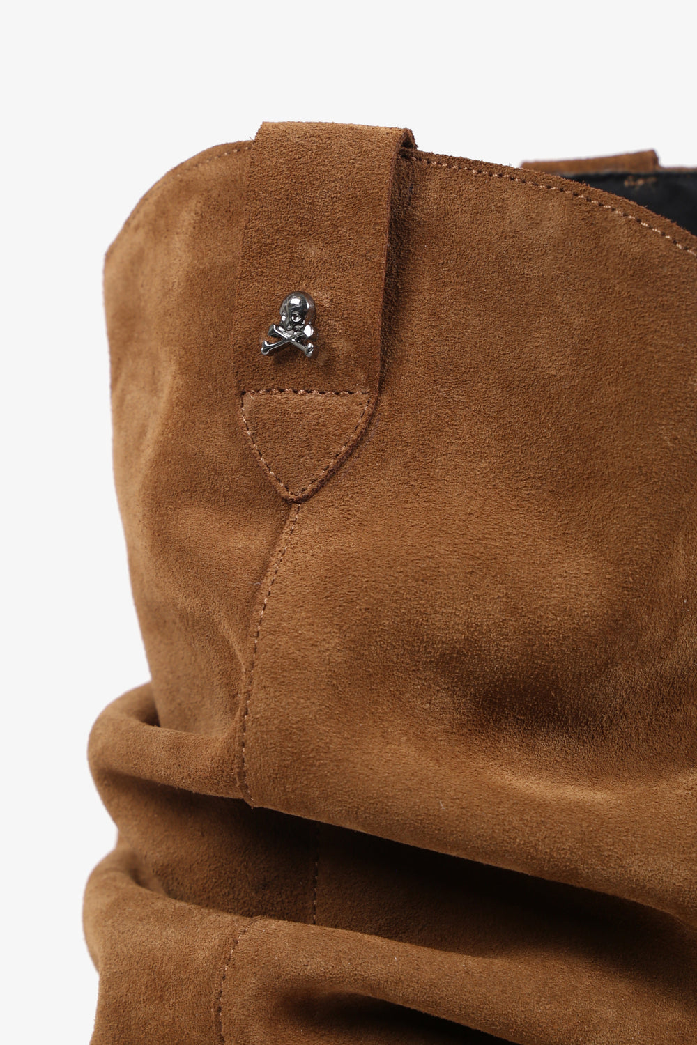 Botas confeccionadas en piel de vacuno. Caña alta con frunce, tacón bajo y acabada en punta. Detalle de calavera de metal.