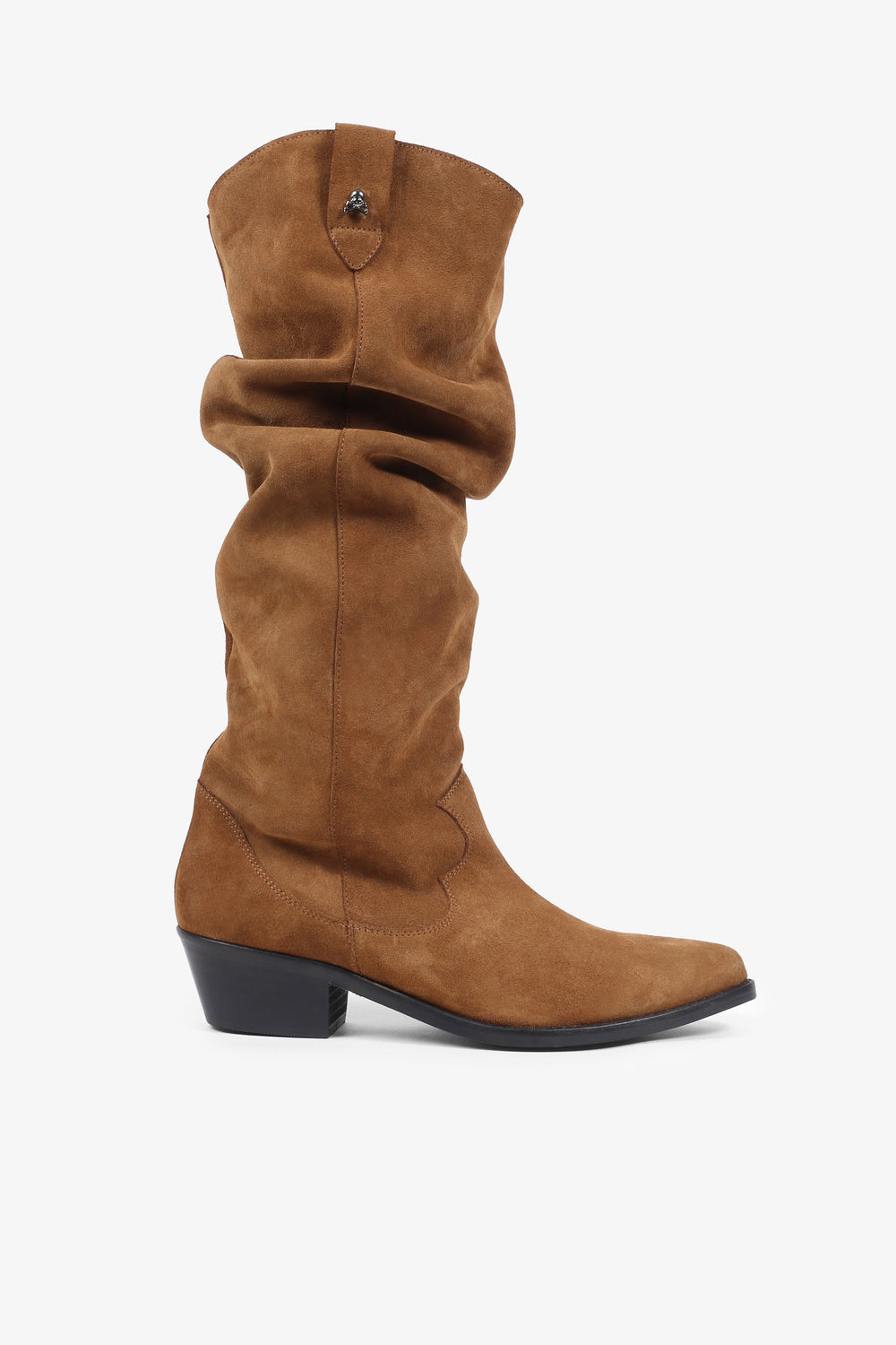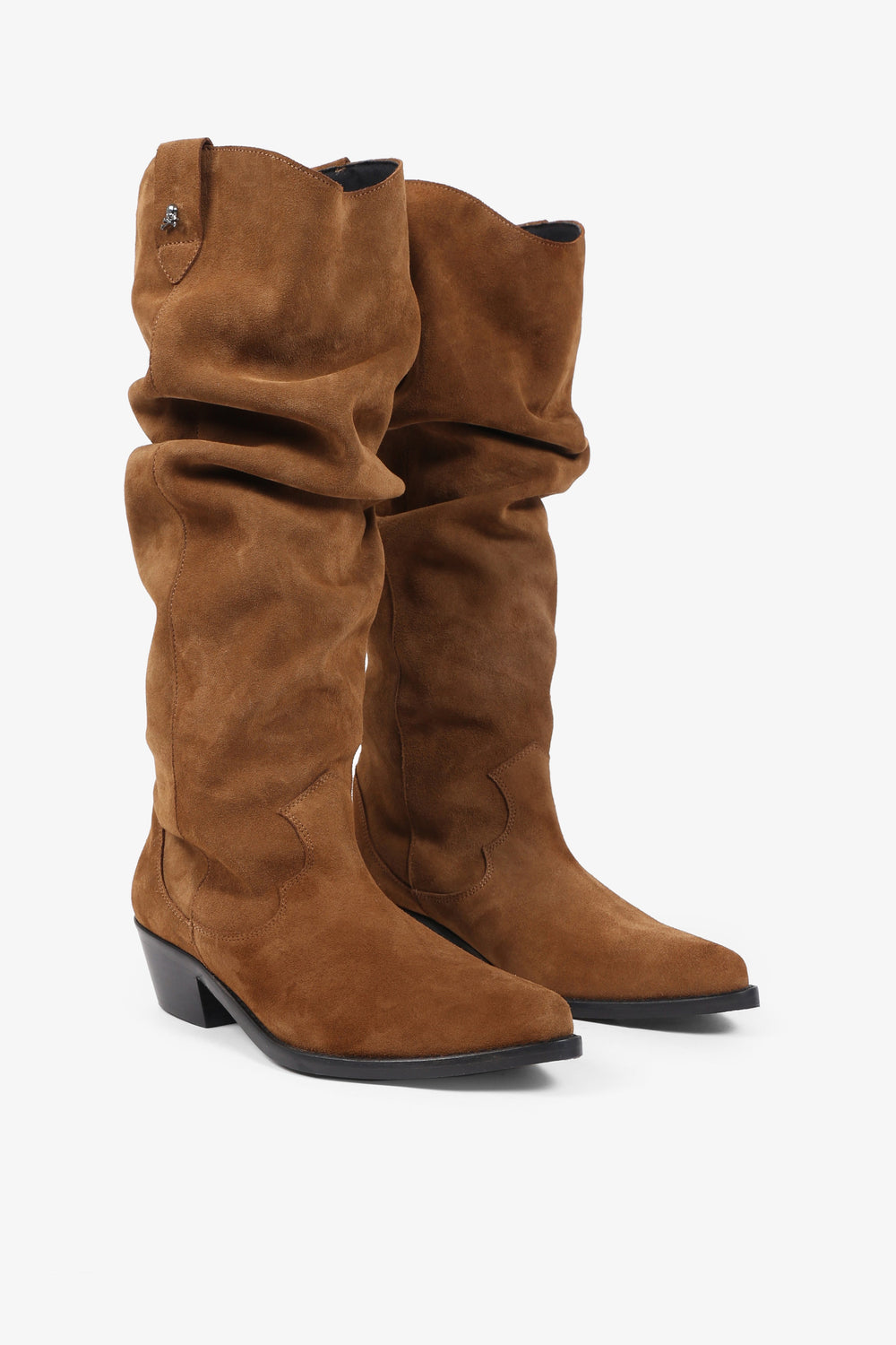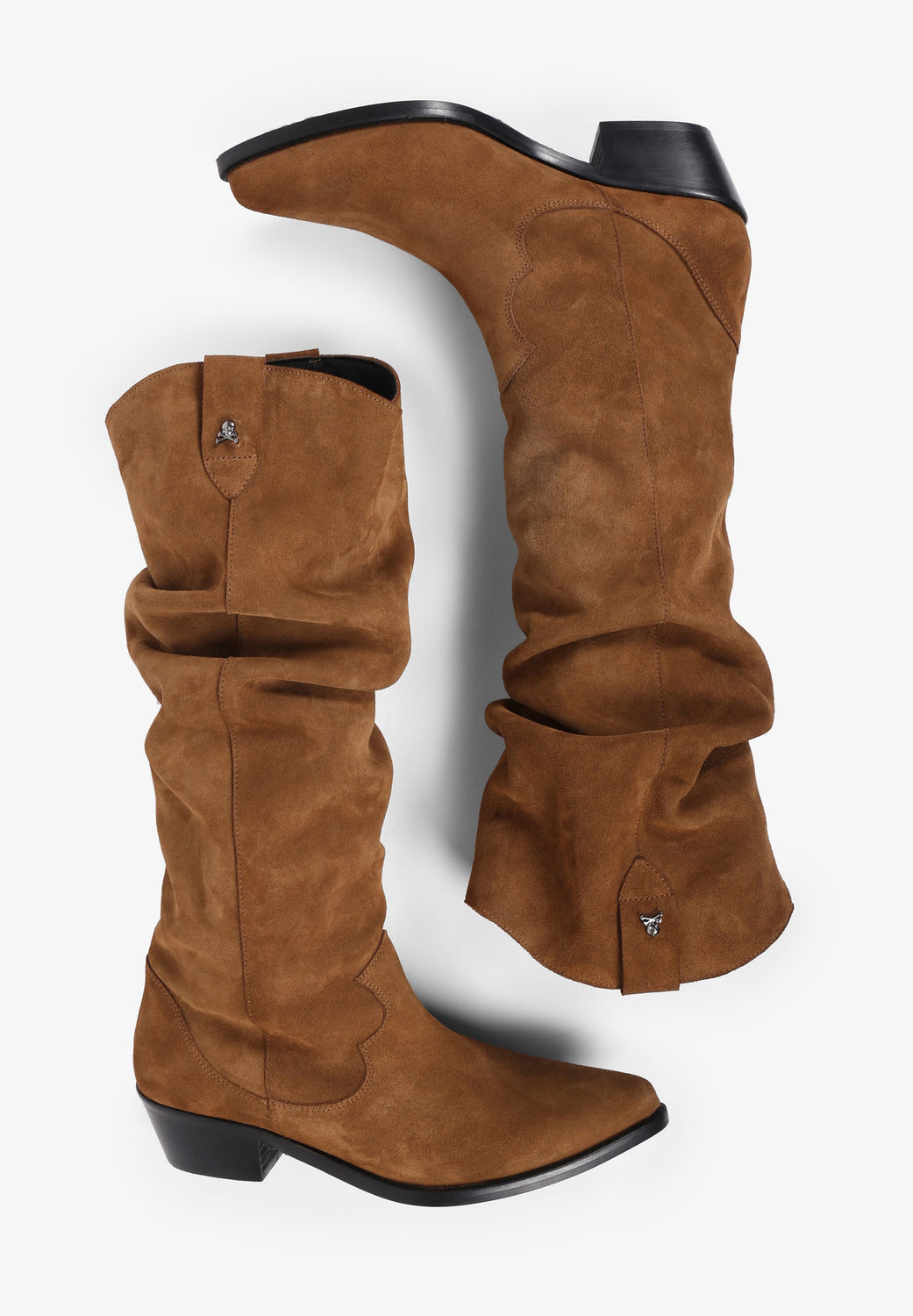 Botas confeccionadas en piel de vacuno. Caña alta con frunce, tacón bajo y acabada en punta. Detalle de calavera de metal.