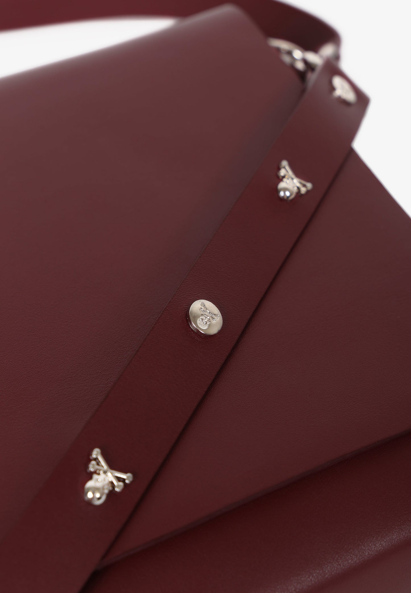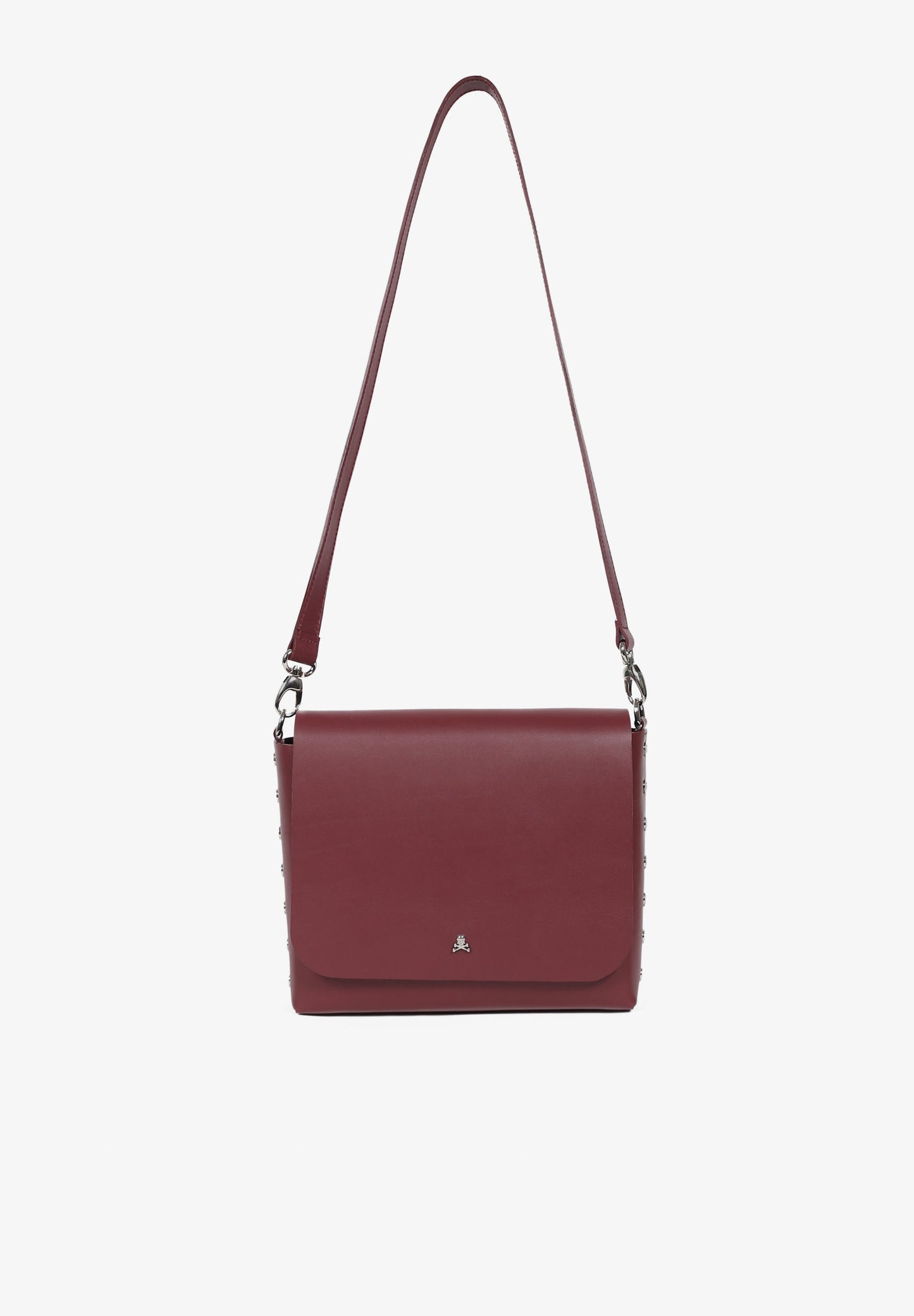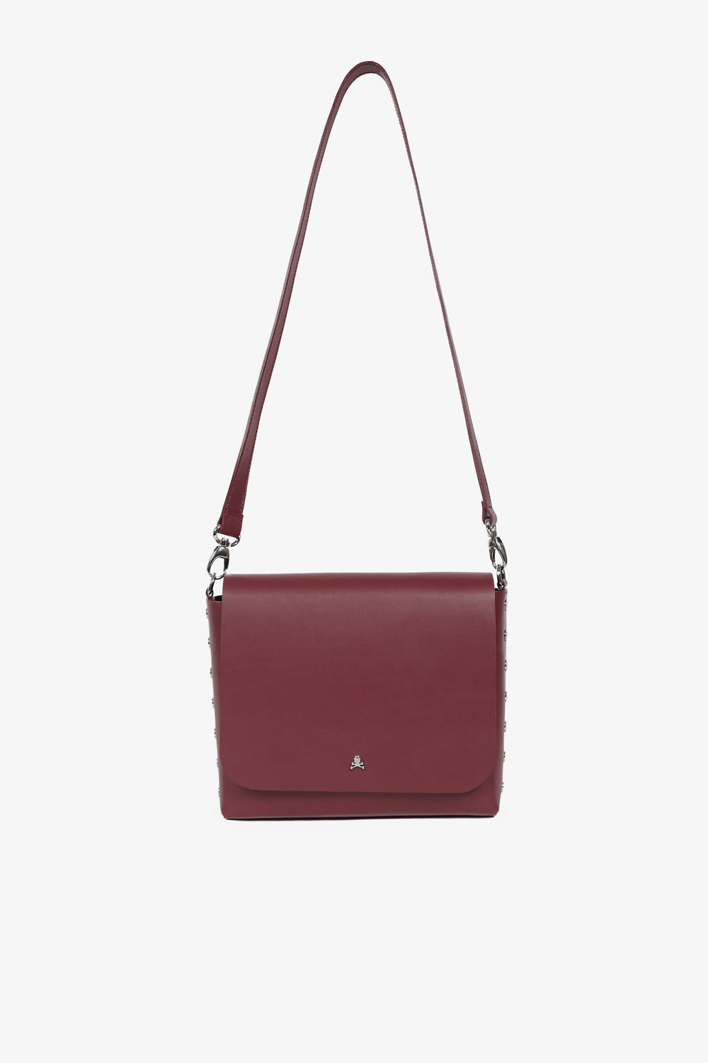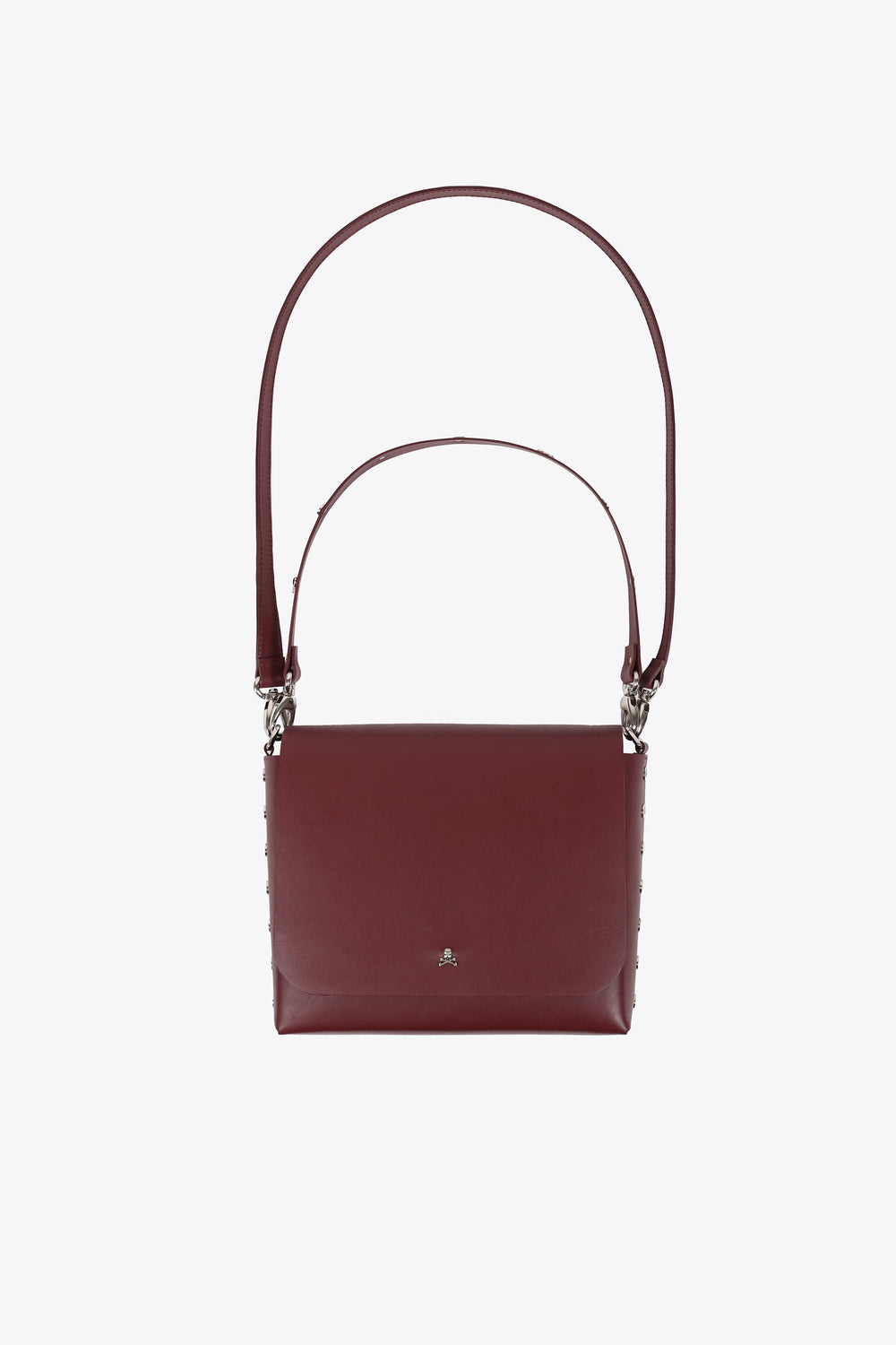 Bolso confeccionado en 100% piel. Doble asa corta y larga desmontable con gancho. Detalle de tachuela de calavera frontal y laterales.