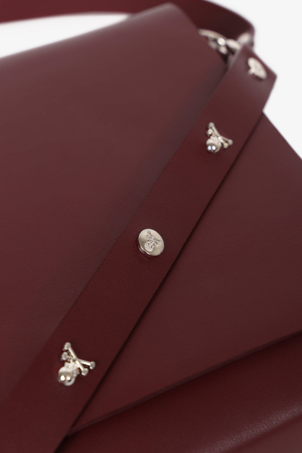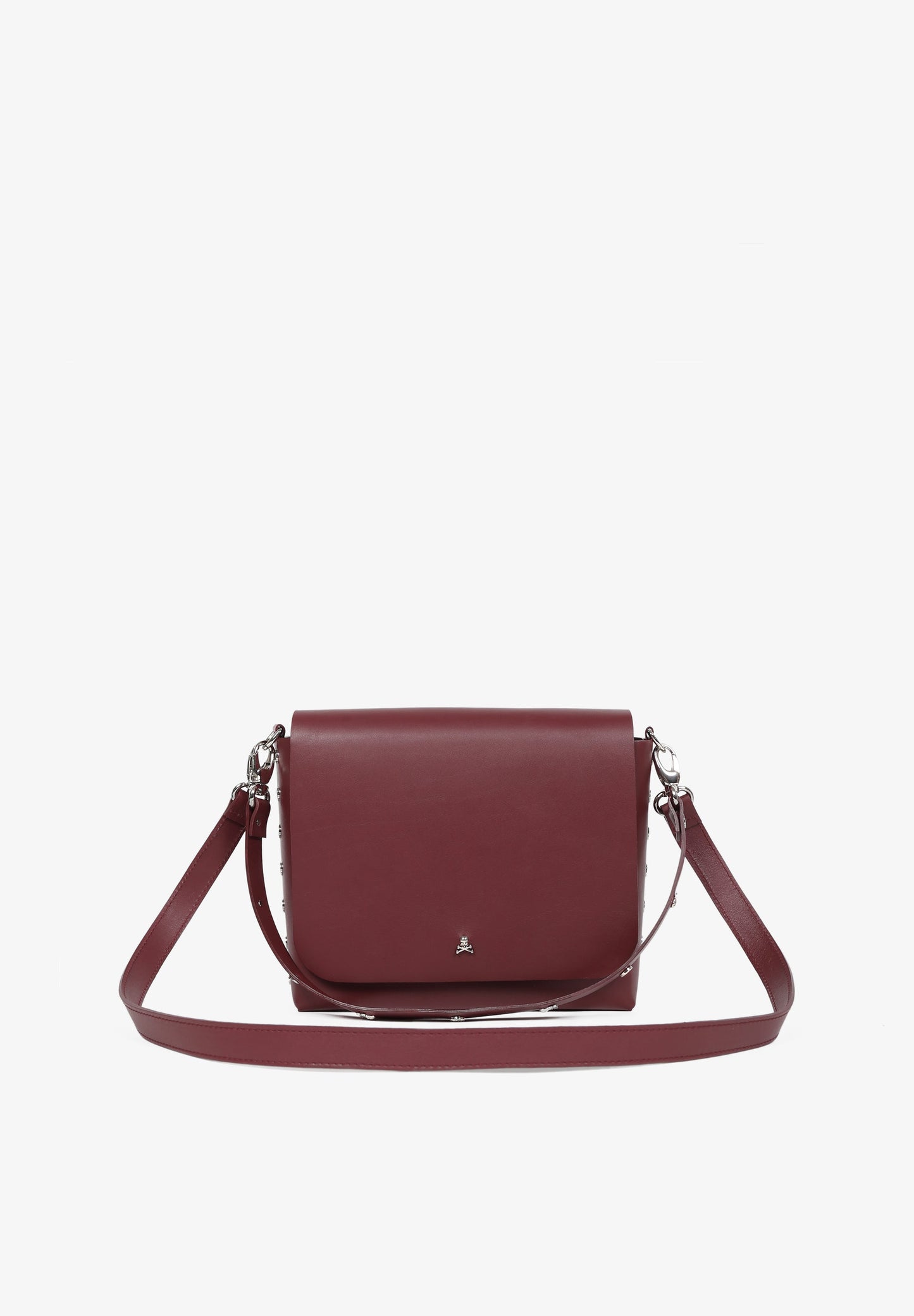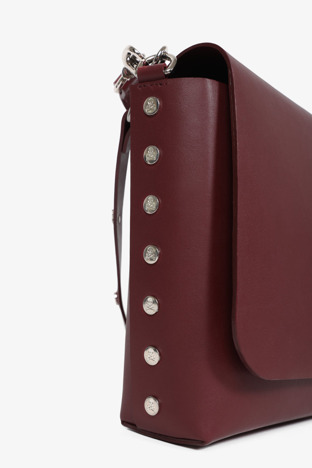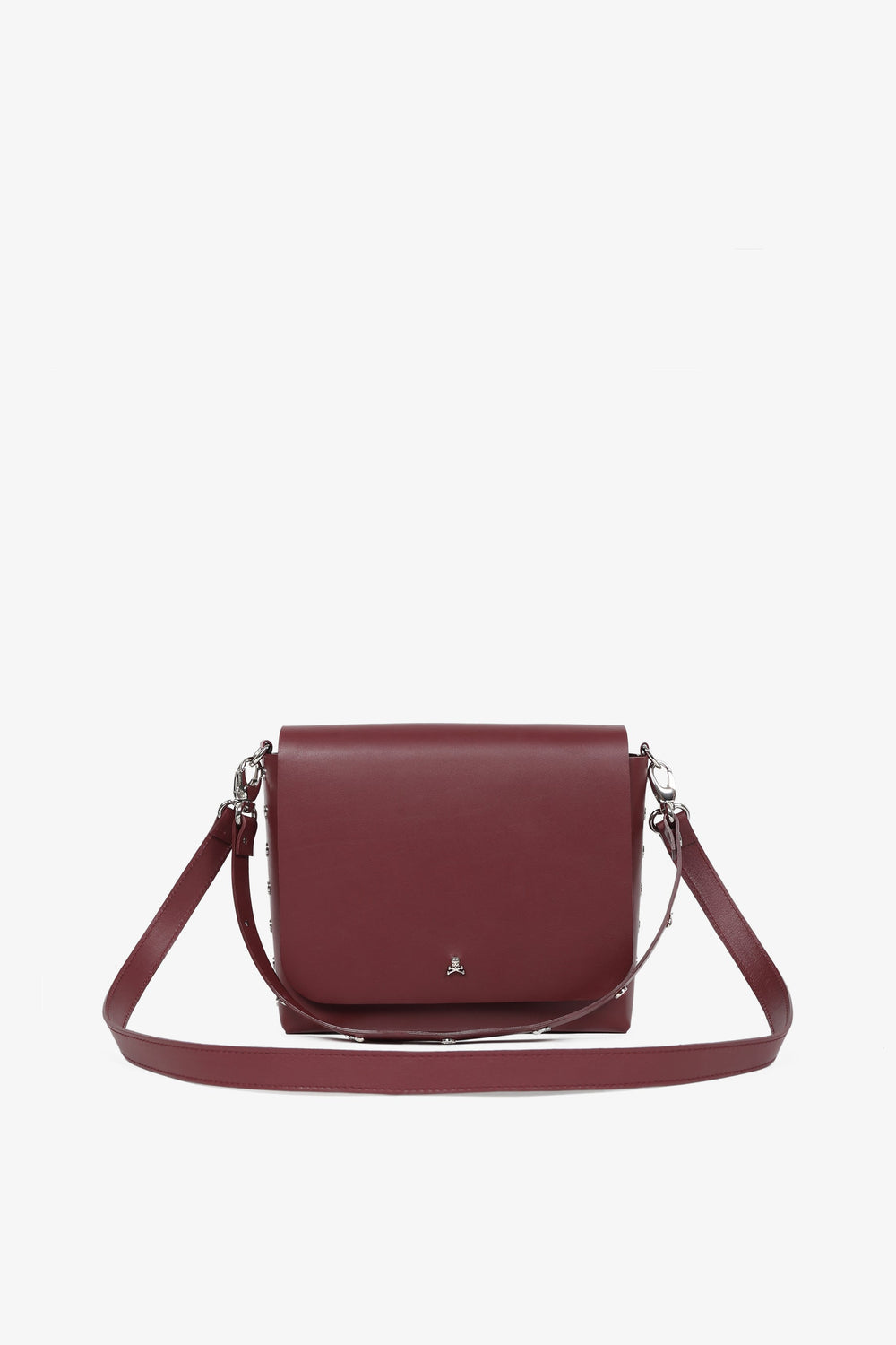 Bolso confeccionado en 100% piel. Doble asa corta y larga desmontable con gancho. Detalle de tachuela de calavera frontal y laterales.