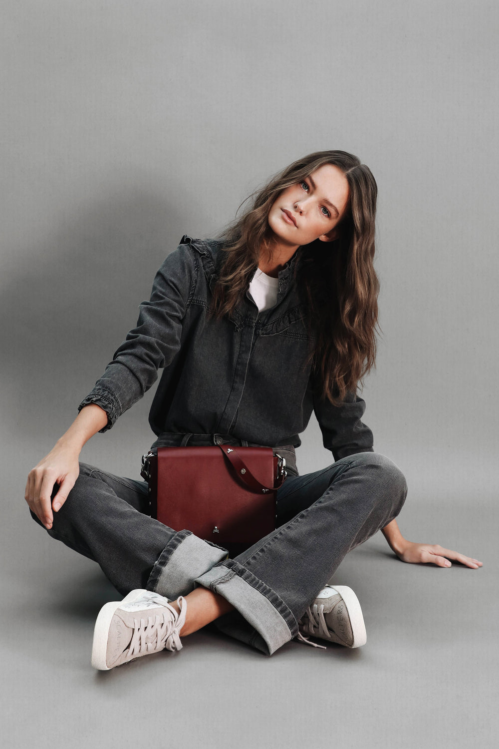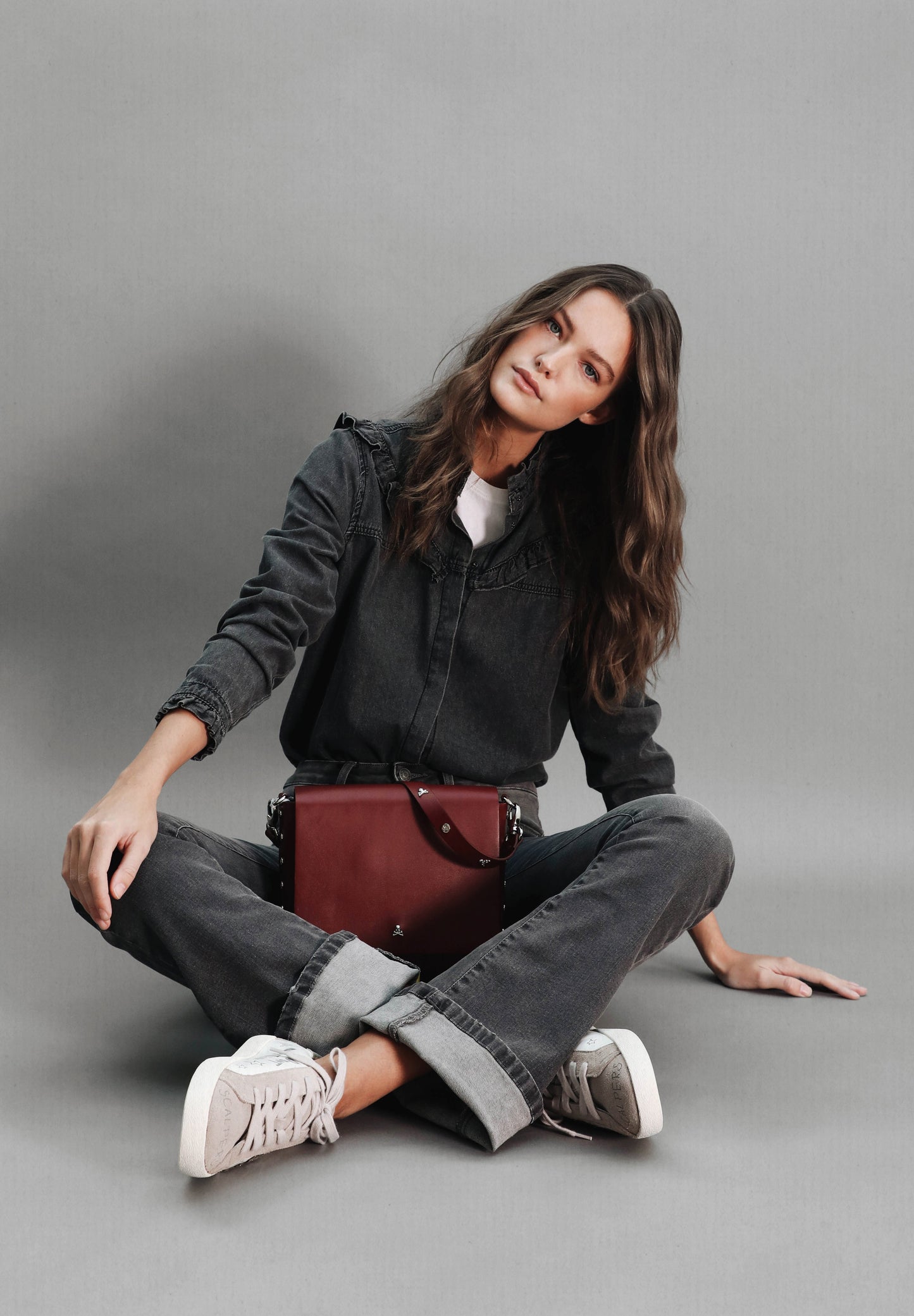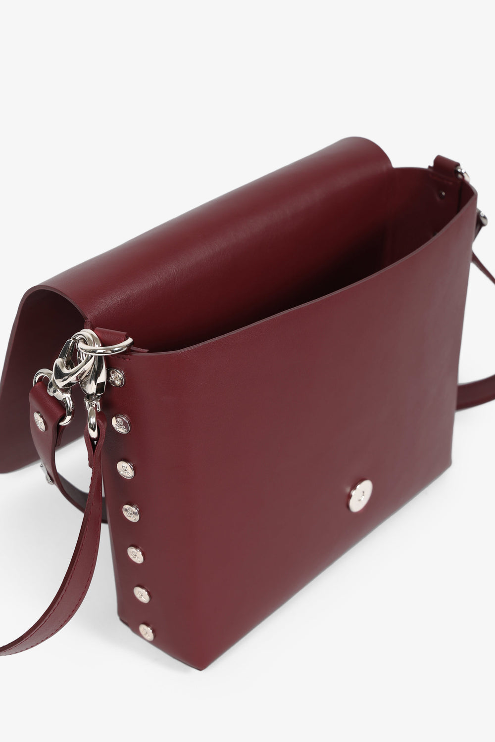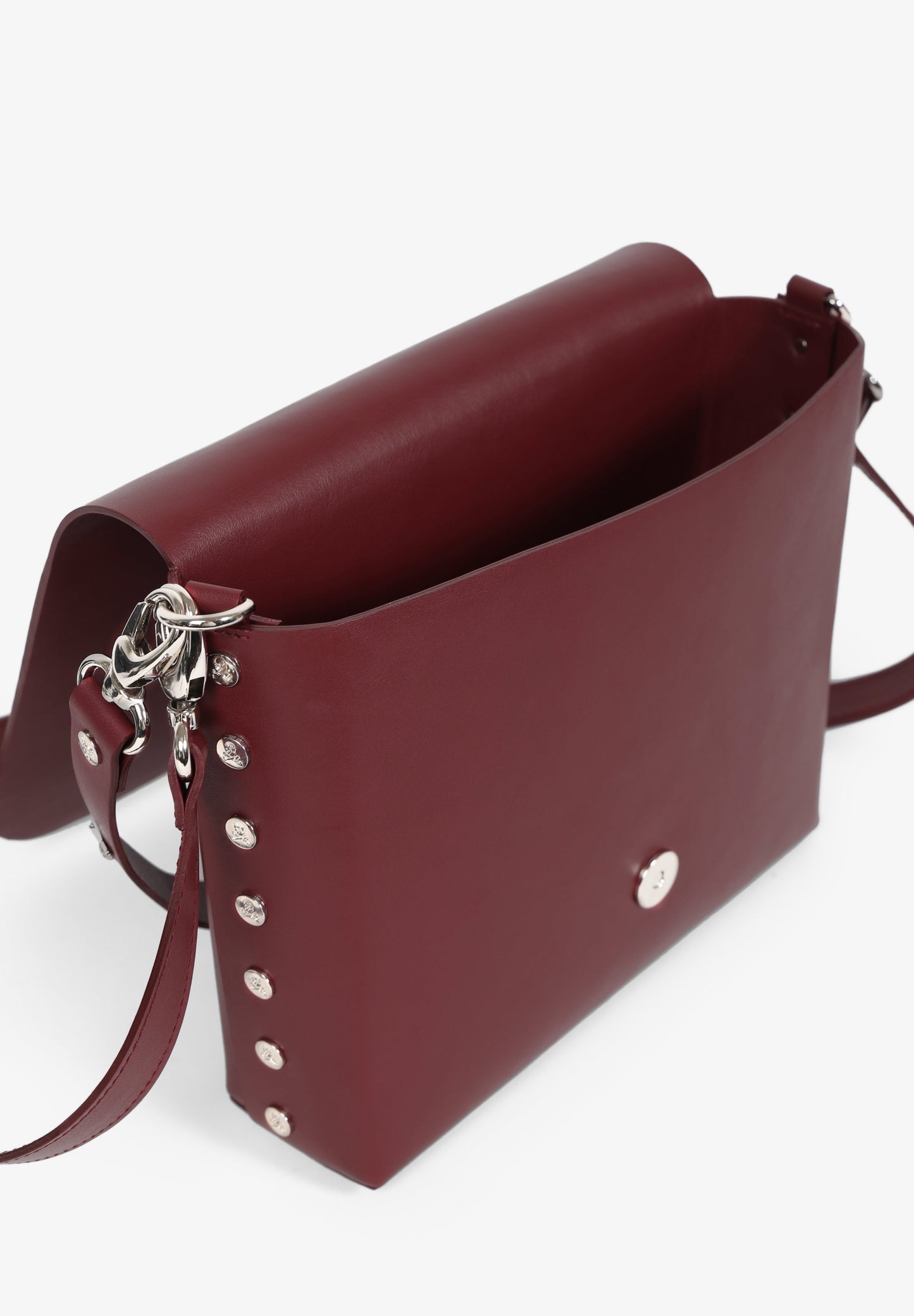 Bolso confeccionado en 100% piel. Doble asa corta y larga desmontable con gancho. Detalle de tachuela de calavera frontal y laterales.