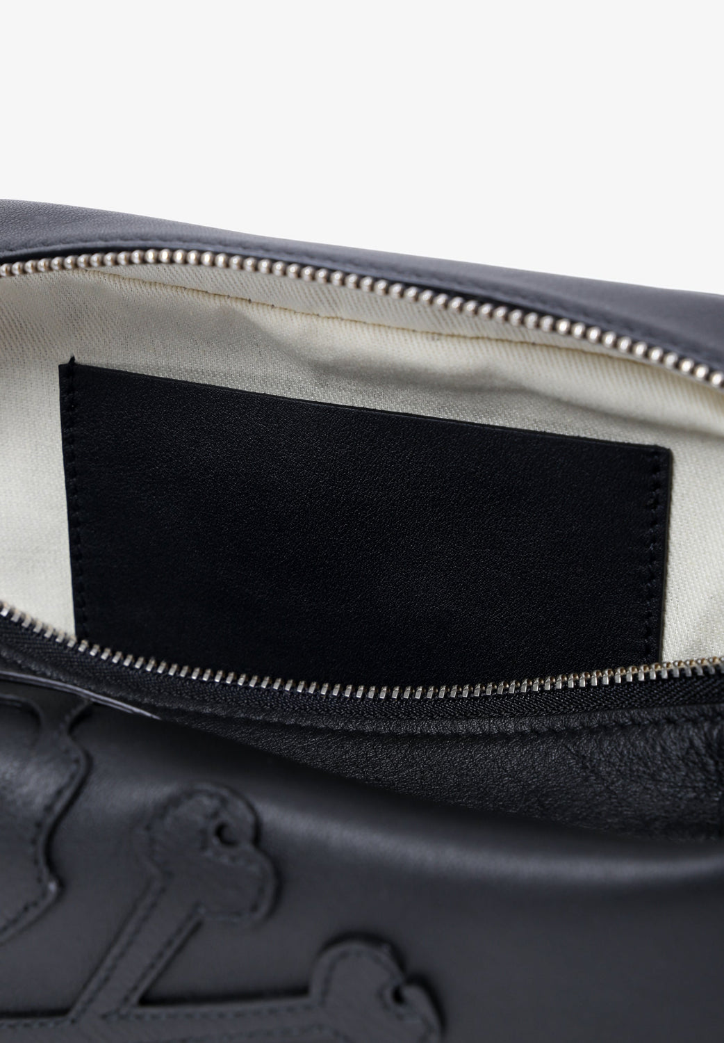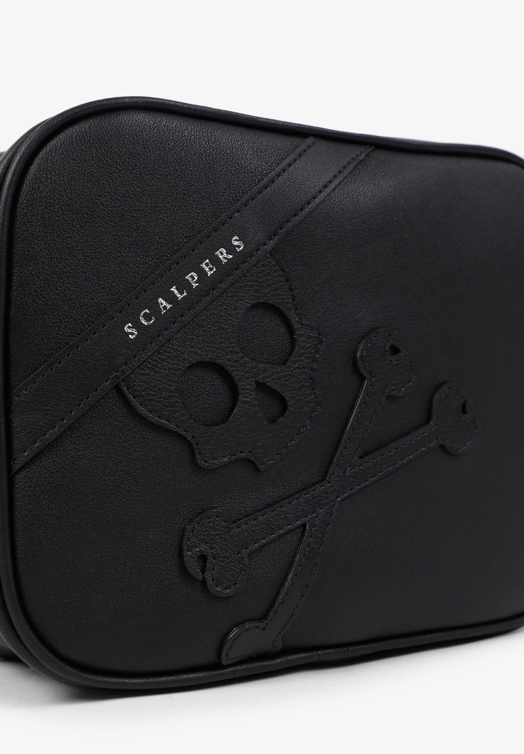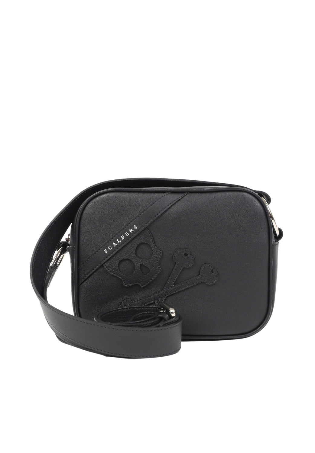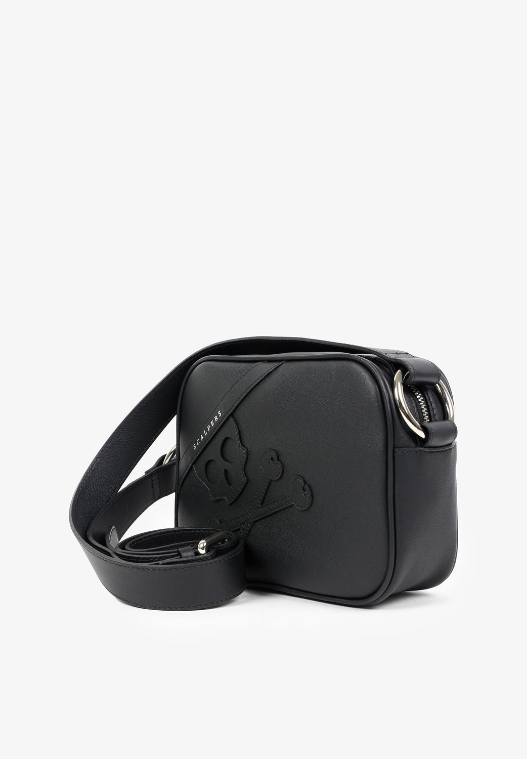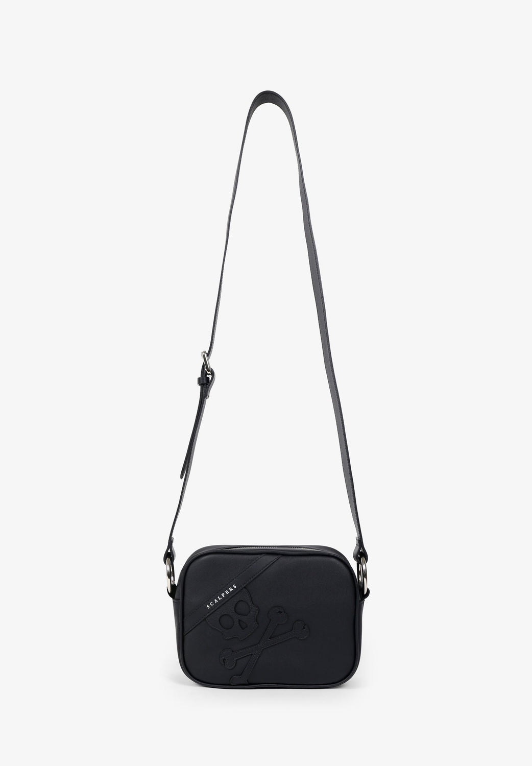 Bolso con maxi calavera confeccionado en piel. Cierre con cremallera, asa larga ajustable con hebilla y anillas.