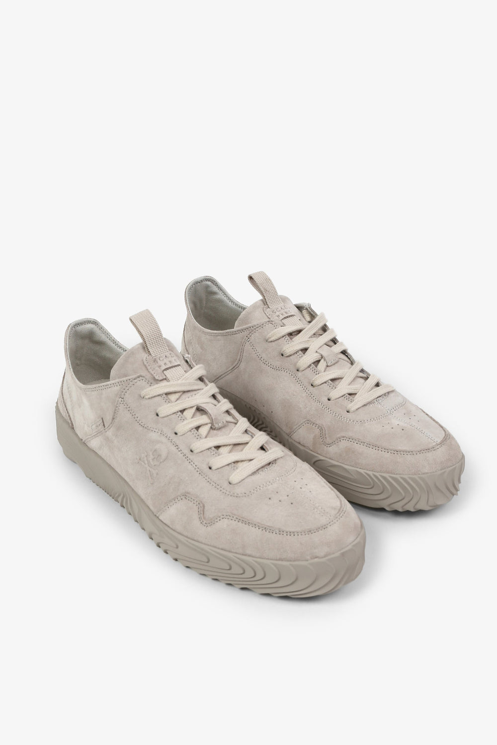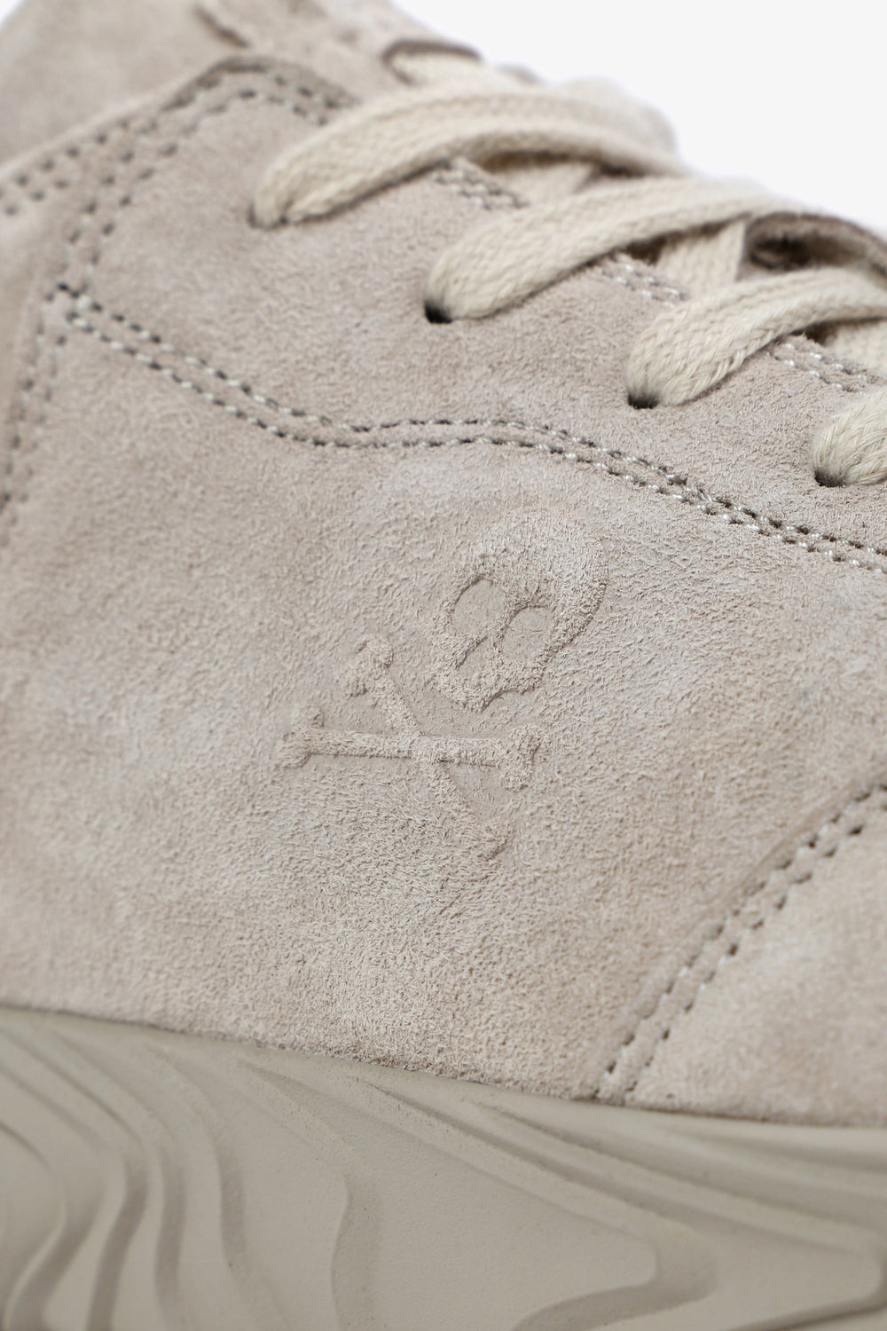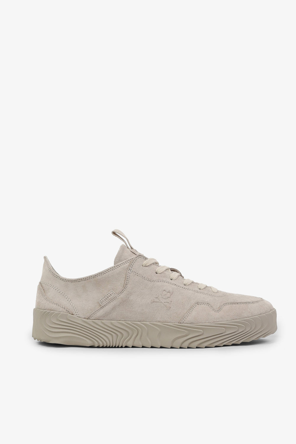 Sneakers baja confeccionadas en tejido 100% piel terminadas en ante. Cierre con cordones a tono y suela de goma. Detalle de calavera lateral.