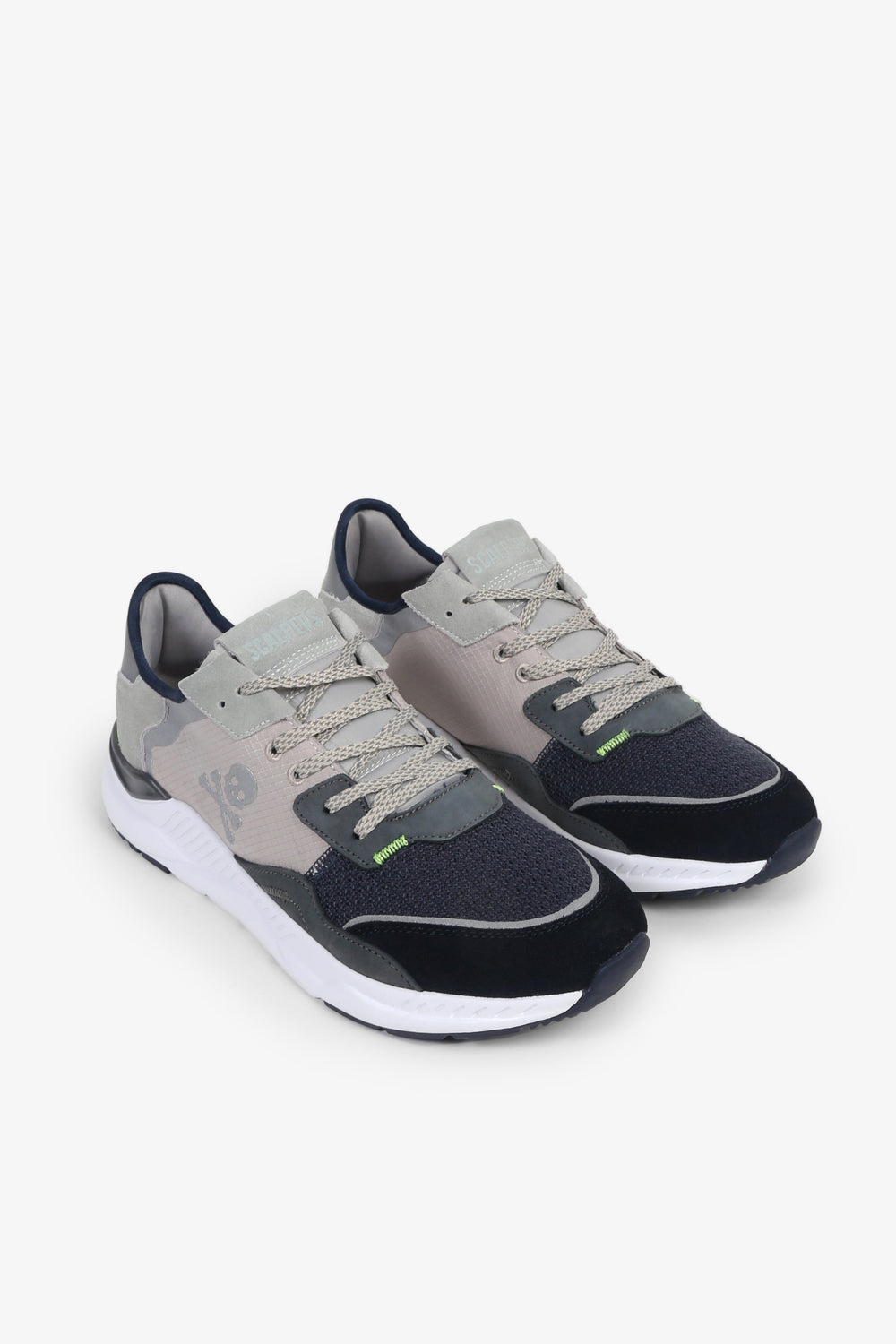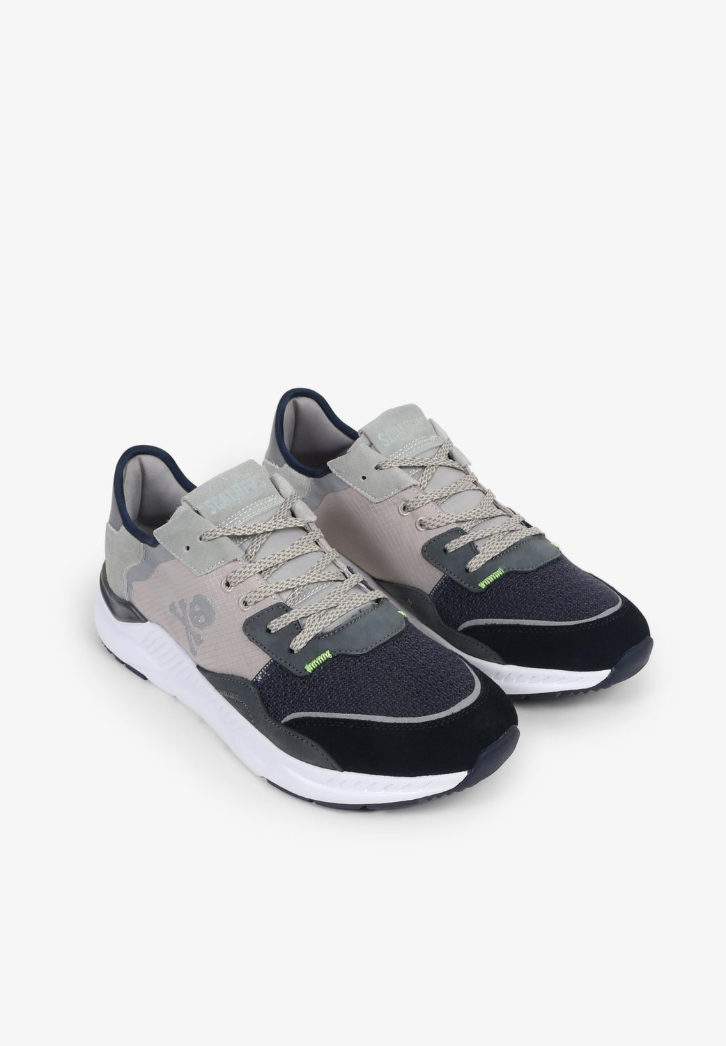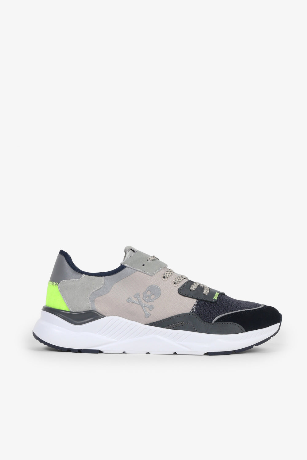 Sneakers confeccionadas en tejido mezcla de piel y nailon. Cierre con cordones, malla delantera y puntera a contraste. Suela gruesa de goma dentada. Detalle de calavera lateral y línea flúor trasera.