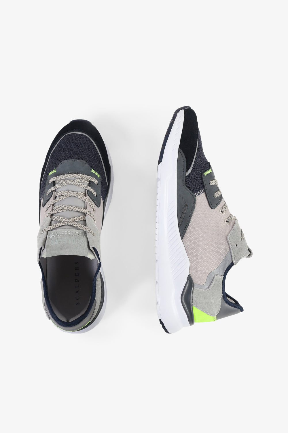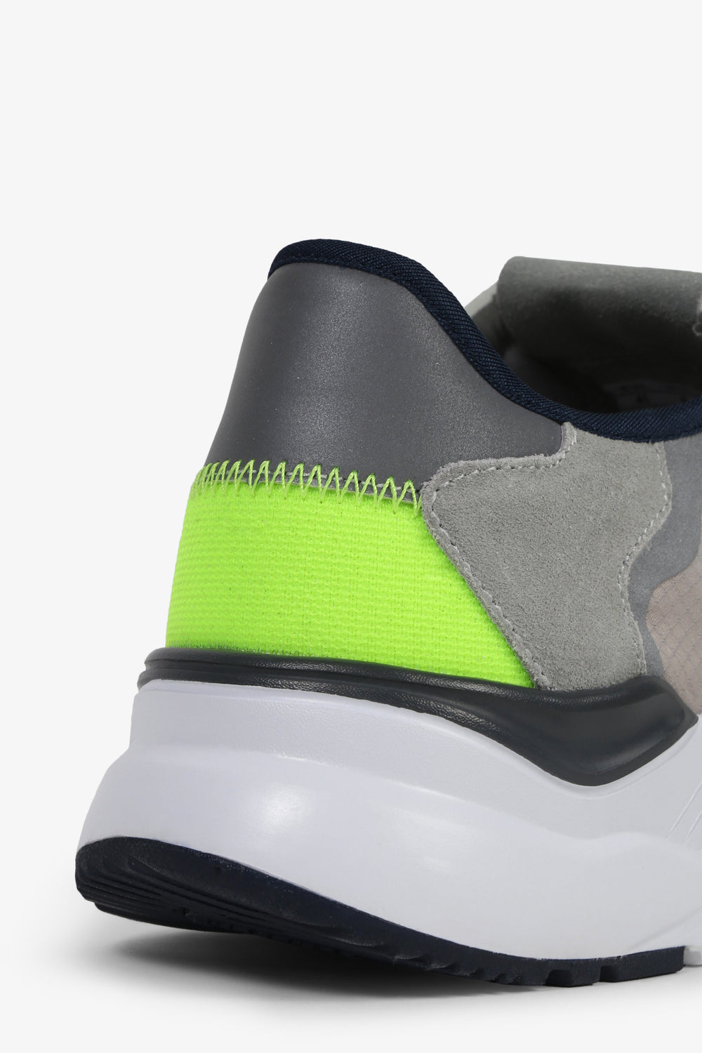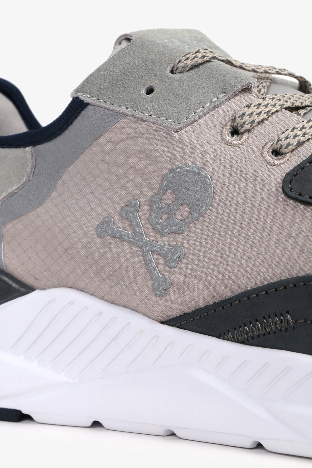 Sneakers confeccionadas en tejido mezcla de piel y nailon. Cierre con cordones, malla delantera y puntera a contraste. Suela gruesa de goma dentada. Detalle de calavera lateral y línea flúor trasera.
