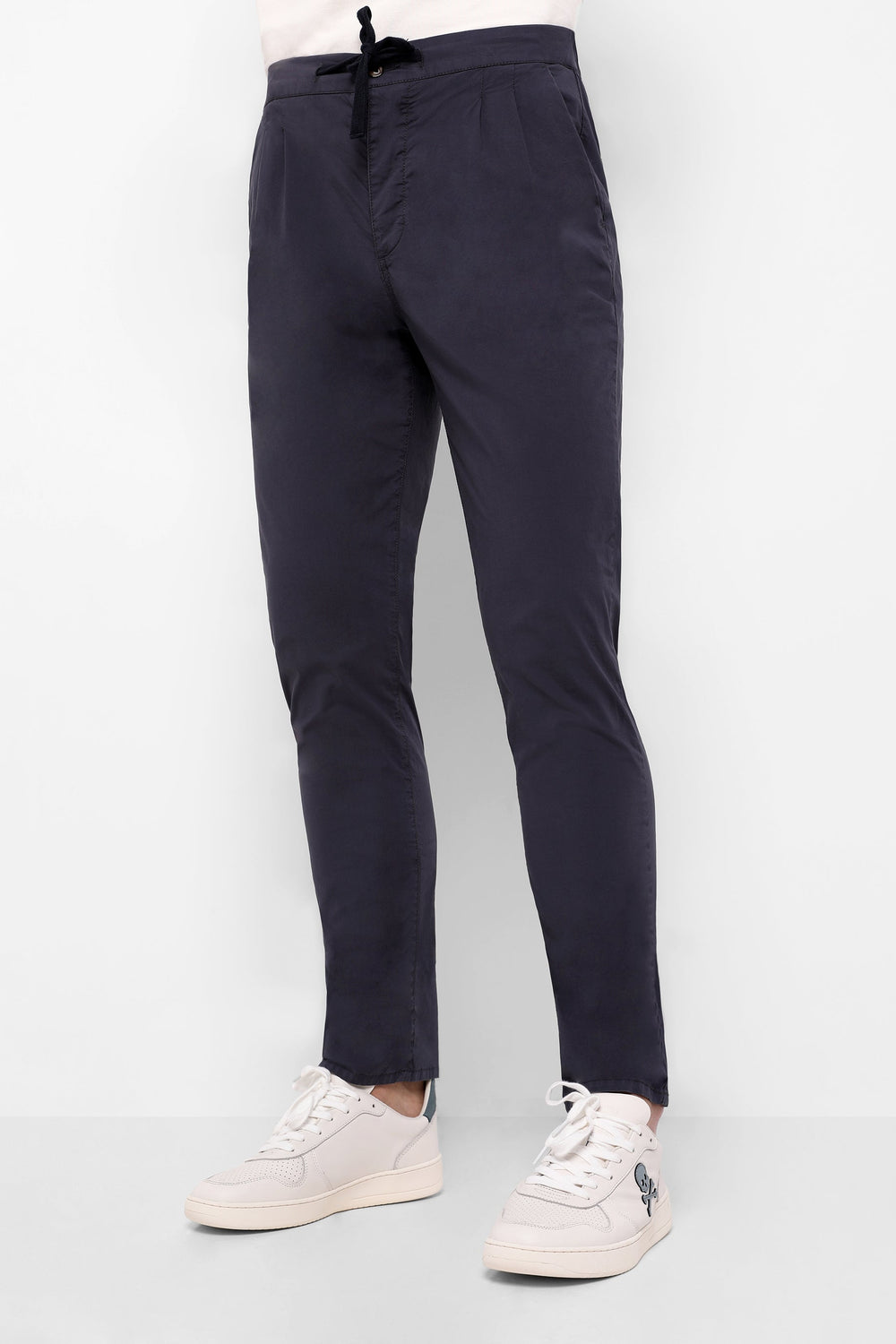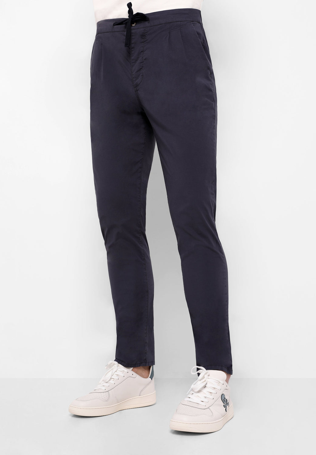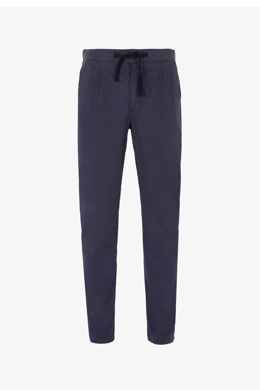 Pantalón confeccionado en tejido de algodón ligeramente elástico. Corte Regular Fit con pinzas, cierre con botón, cremallera y lazada. Bolsillos laterales.