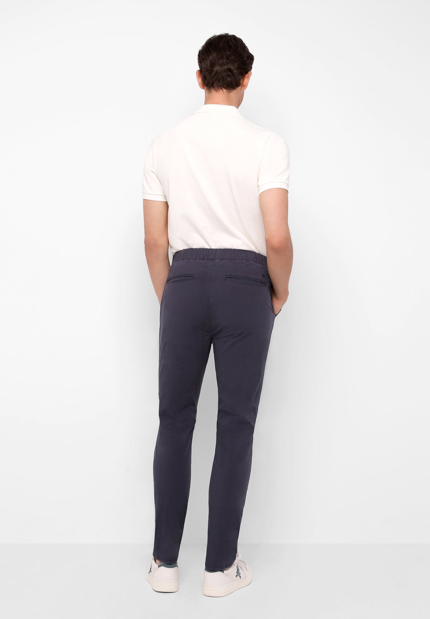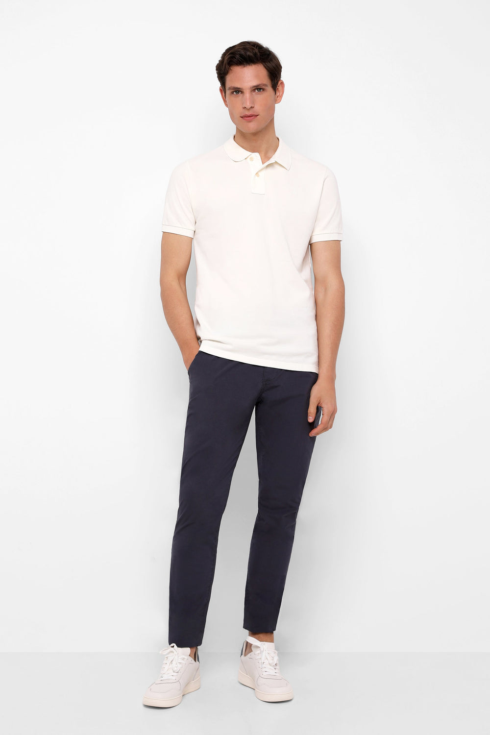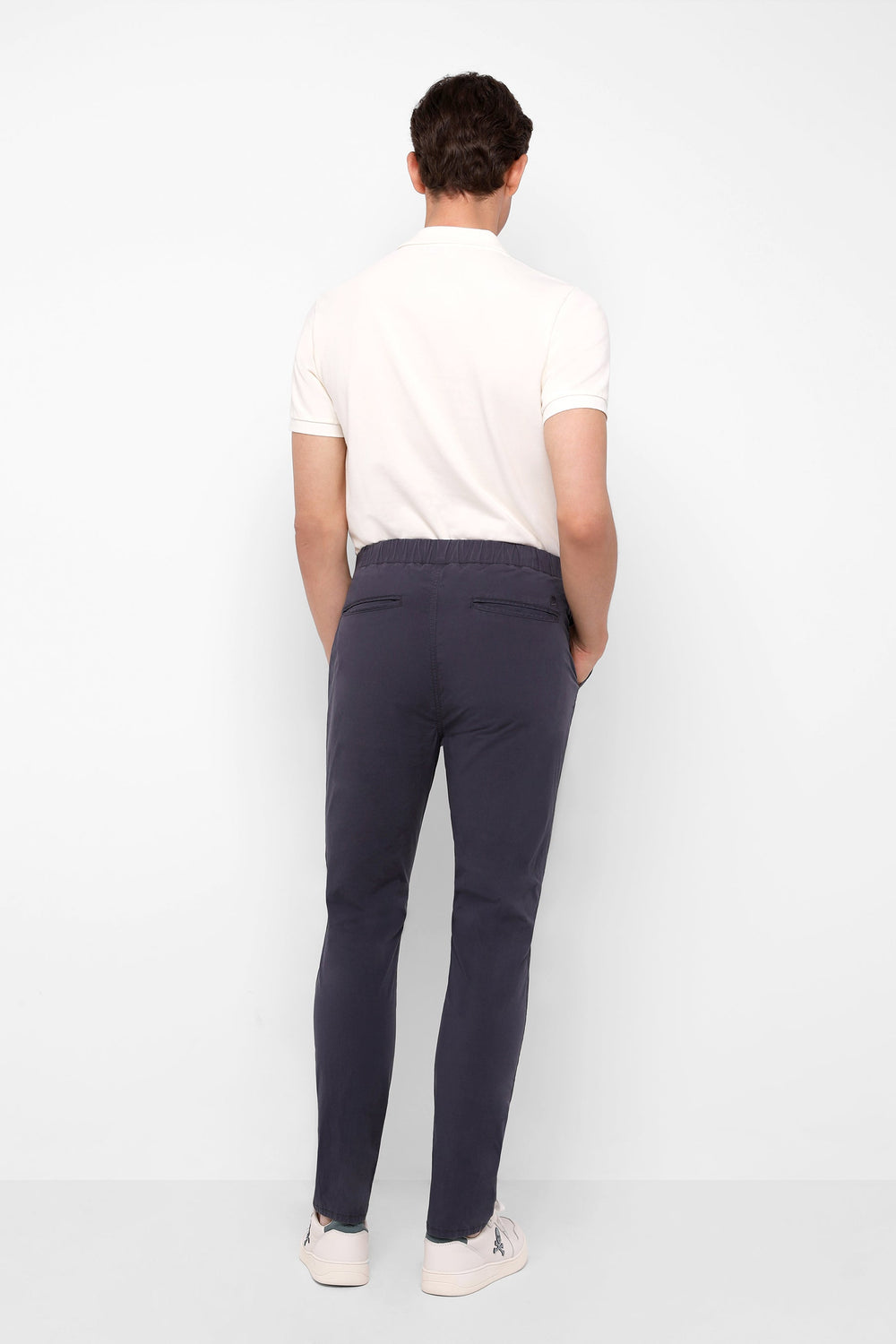 Pantalón confeccionado en tejido de algodón ligeramente elástico. Corte Regular Fit con pinzas, cierre con botón, cremallera y lazada. Bolsillos laterales.