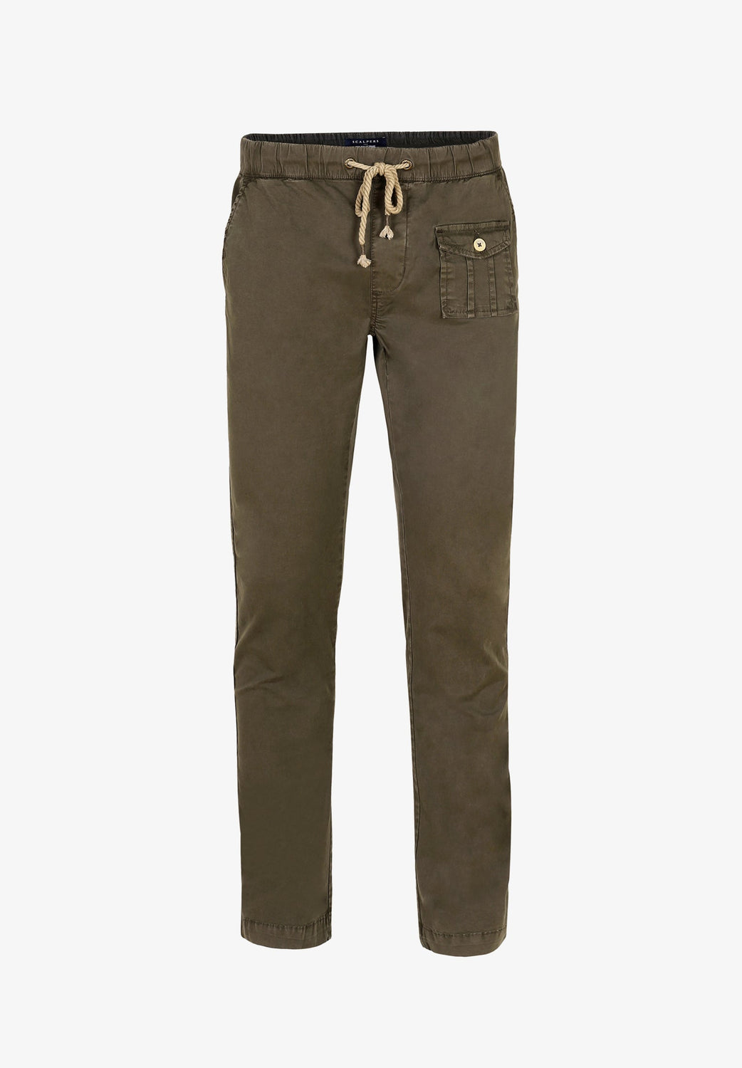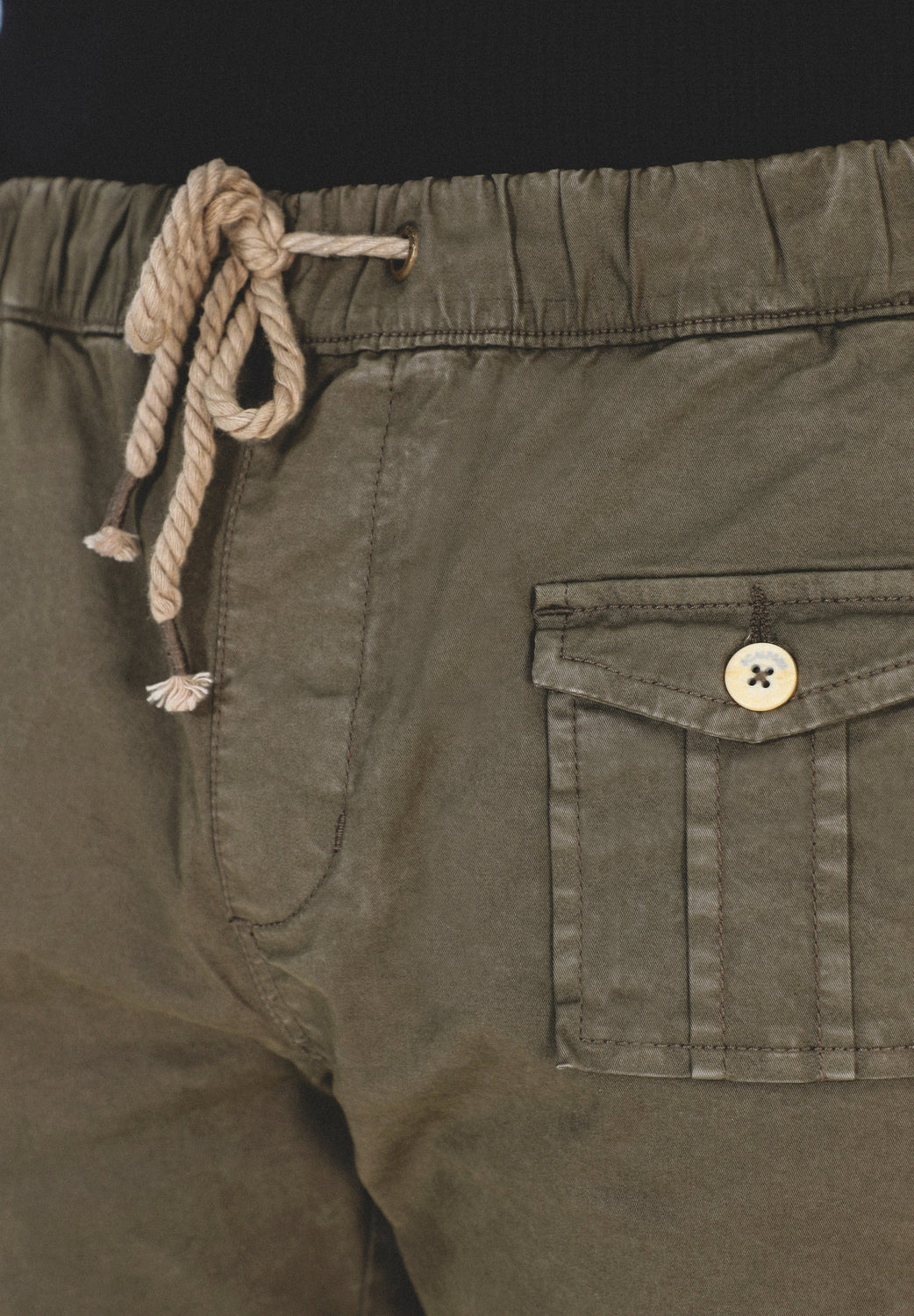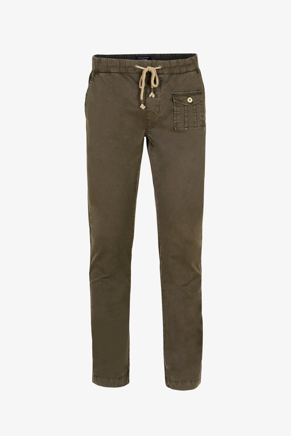 Pantalón confeccionado en tejido de algodón ligeramente elástico. Corte Regular Fit con elástico, cierre con cordones y bolsillos laterales y de plastrón con tapeta y botón.