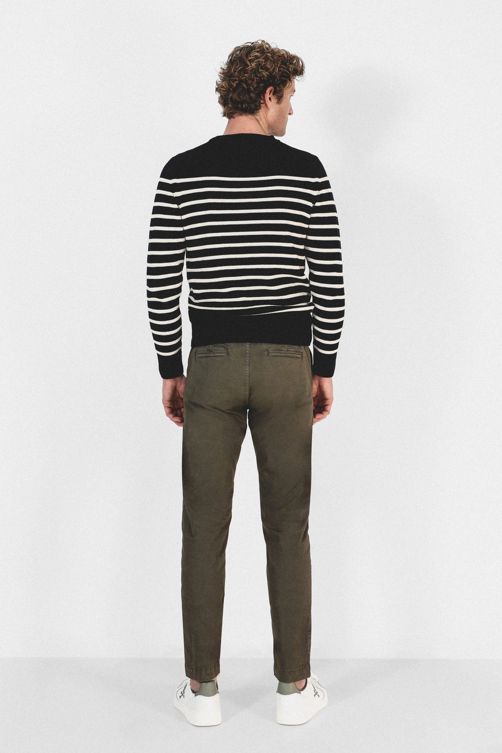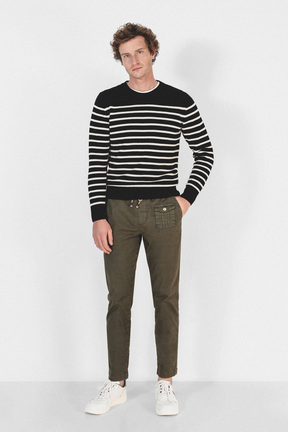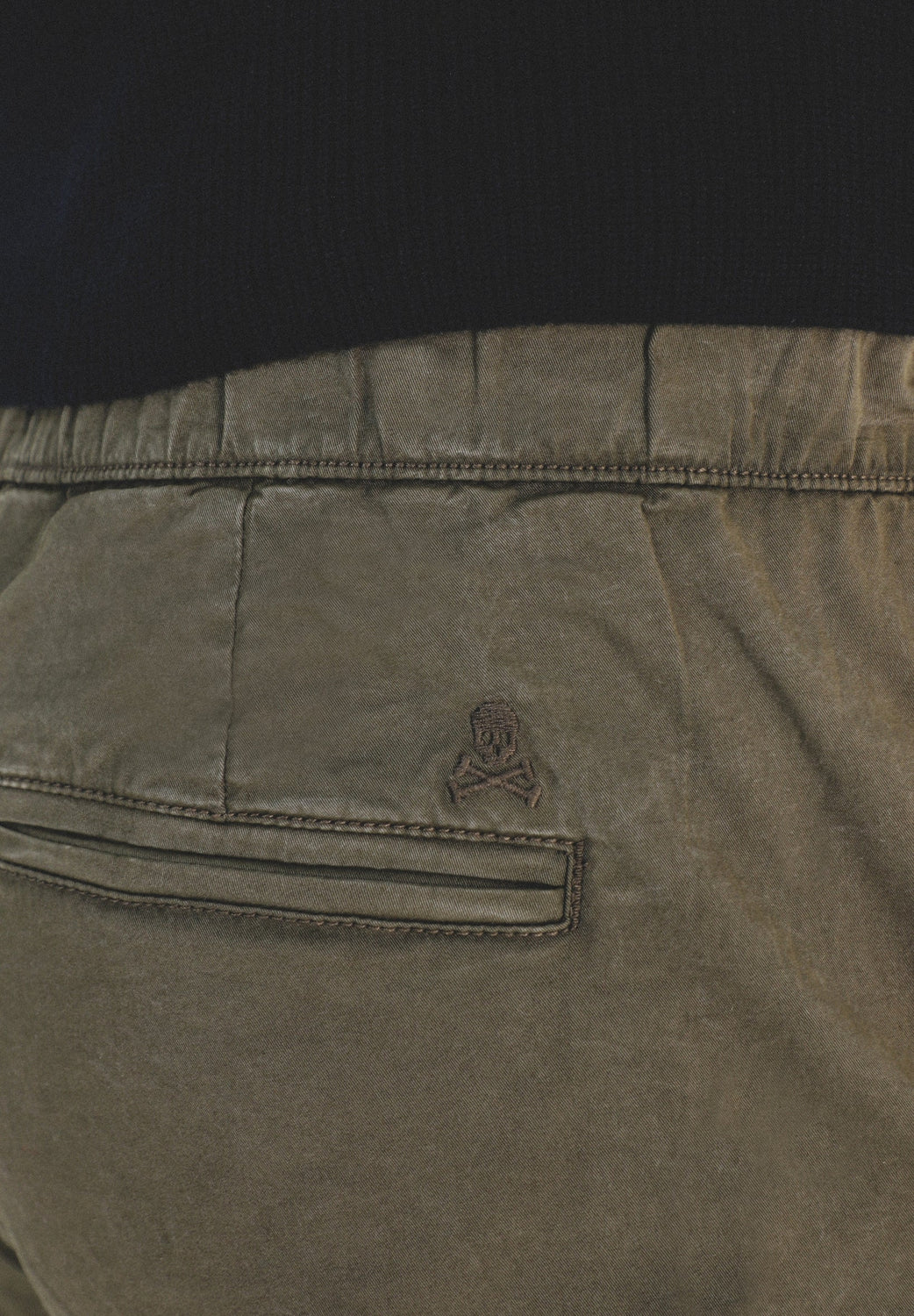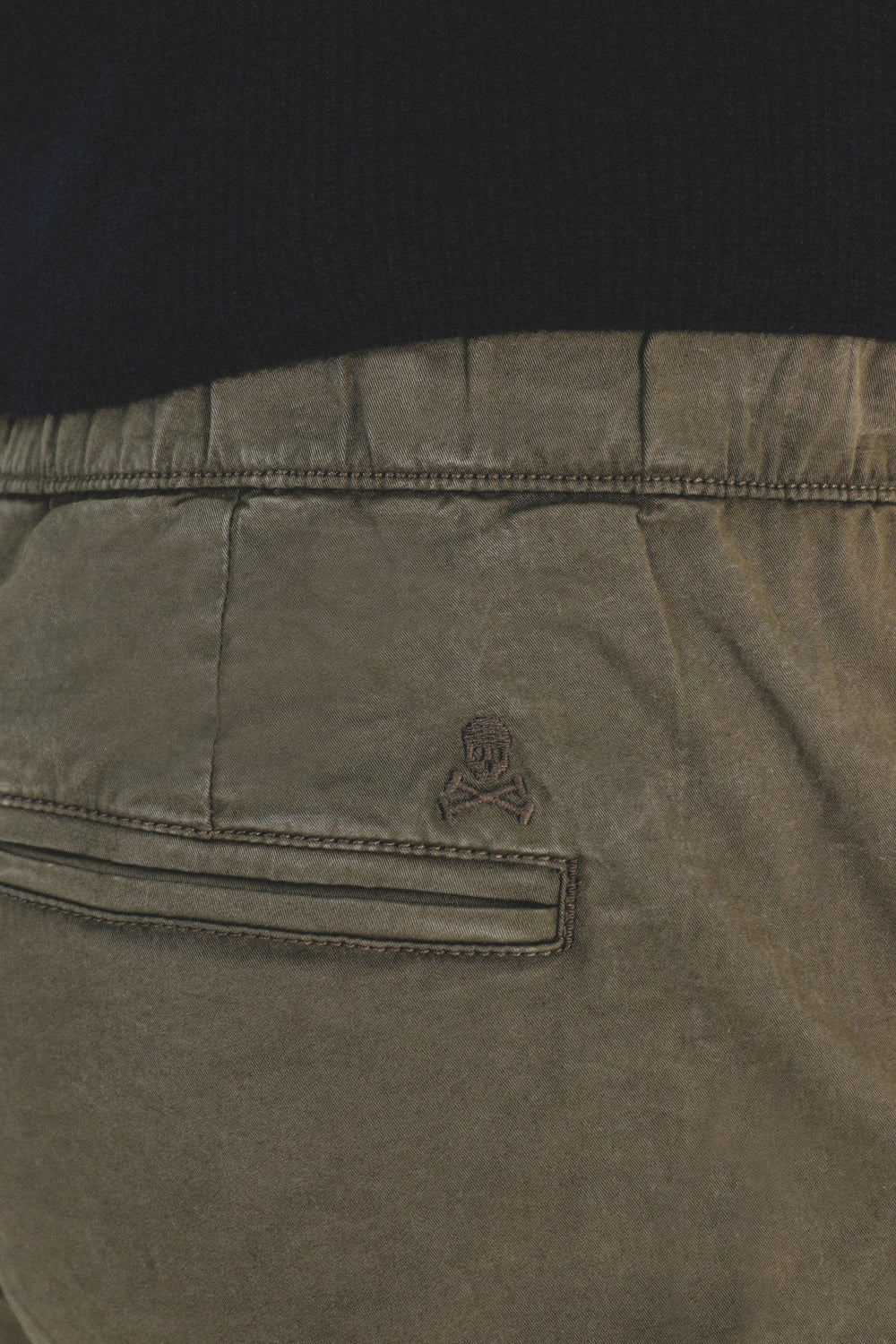 Pantalón confeccionado en tejido de algodón ligeramente elástico. Corte Regular Fit con elástico, cierre con cordones y bolsillos laterales y de plastrón con tapeta y botón.