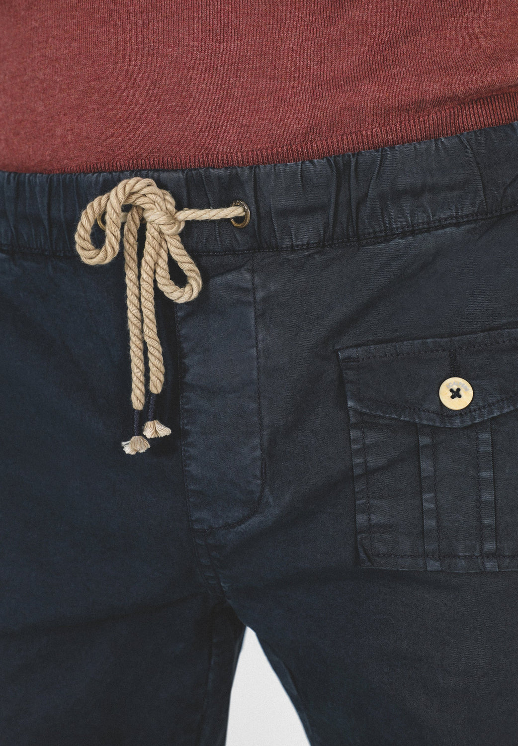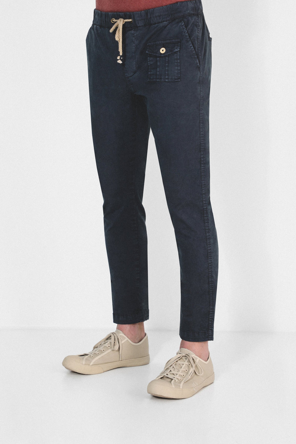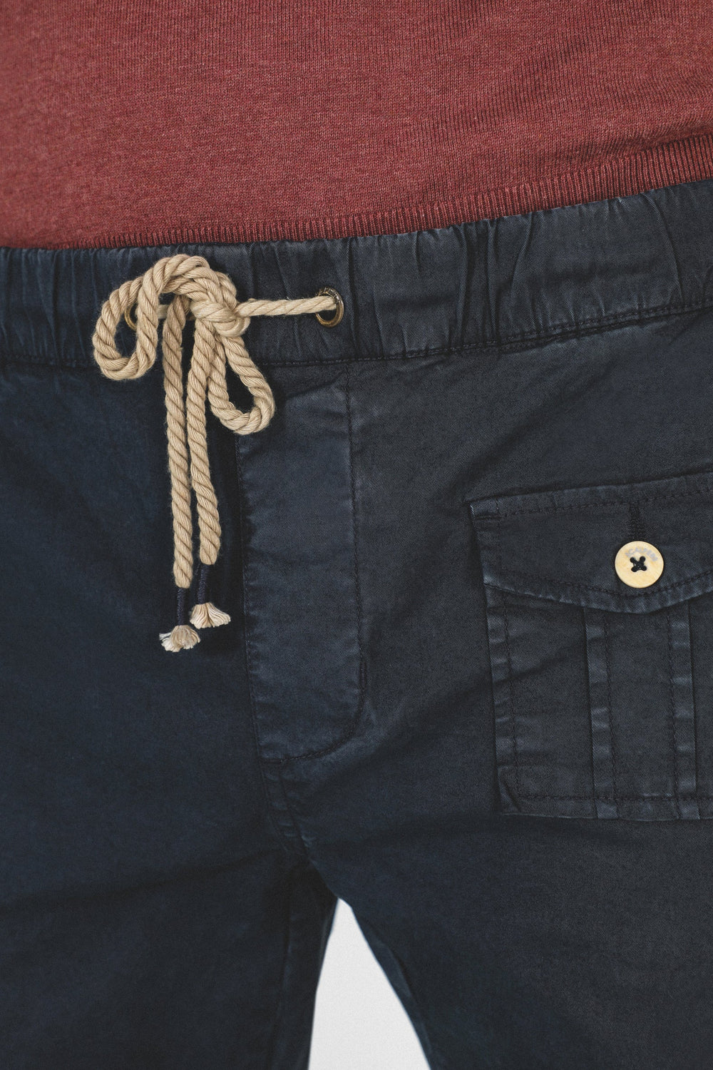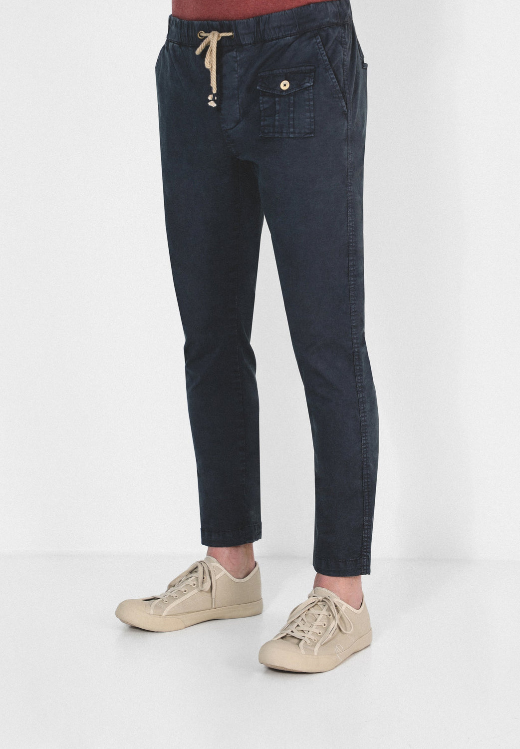 Pantalón confeccionado en tejido de algodón ligeramente elástico. Corte Regular Fit con elástico, cierre con cordones y bolsillos laterales y de plastrón con tapeta y botón.