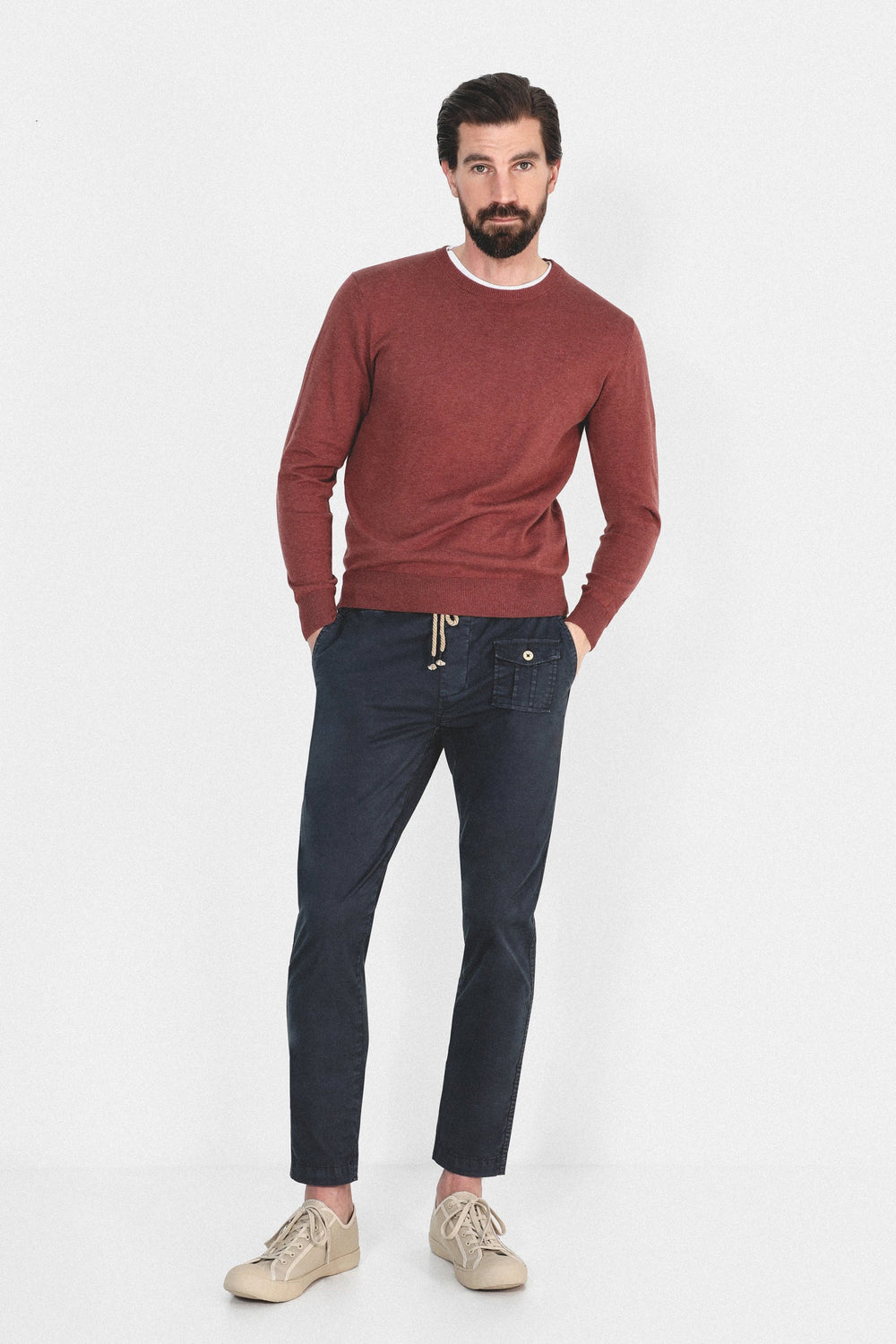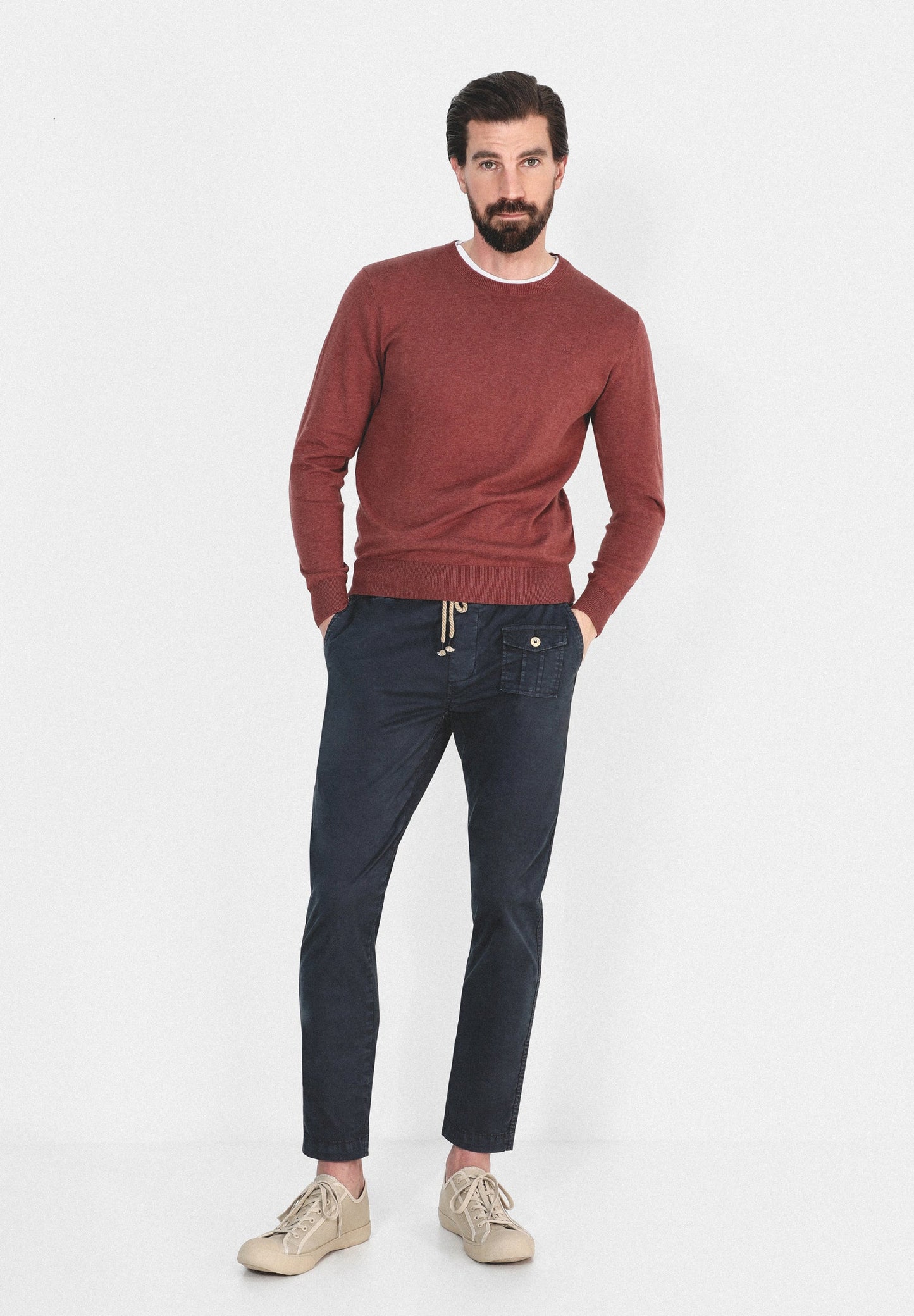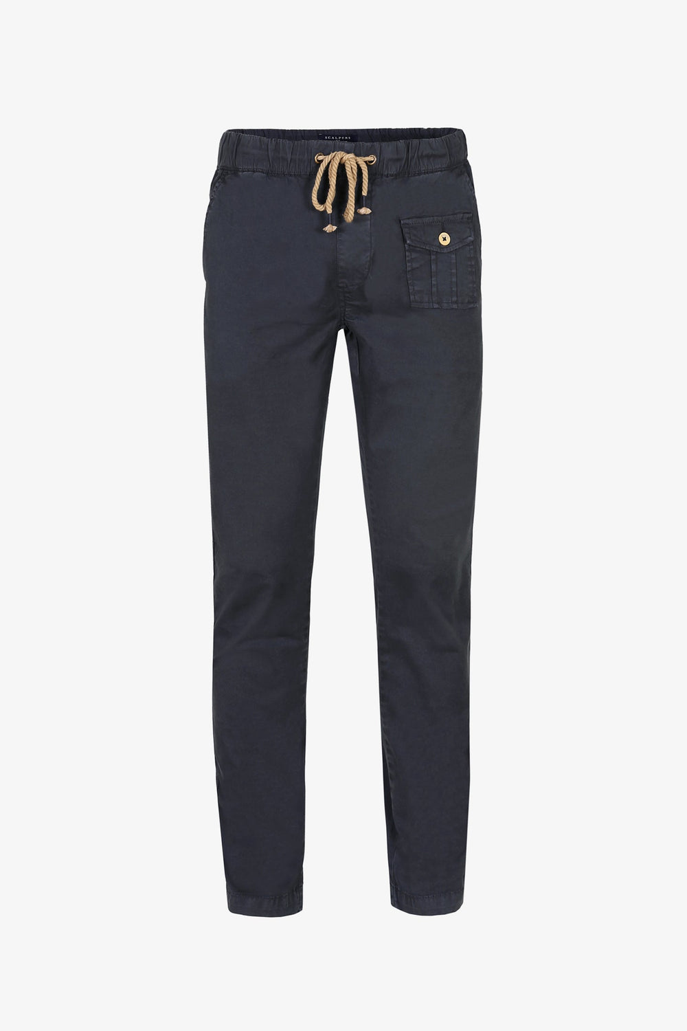 Pantalón confeccionado en tejido de algodón ligeramente elástico. Corte Regular Fit con elástico, cierre con cordones y bolsillos laterales y de plastrón con tapeta y botón.