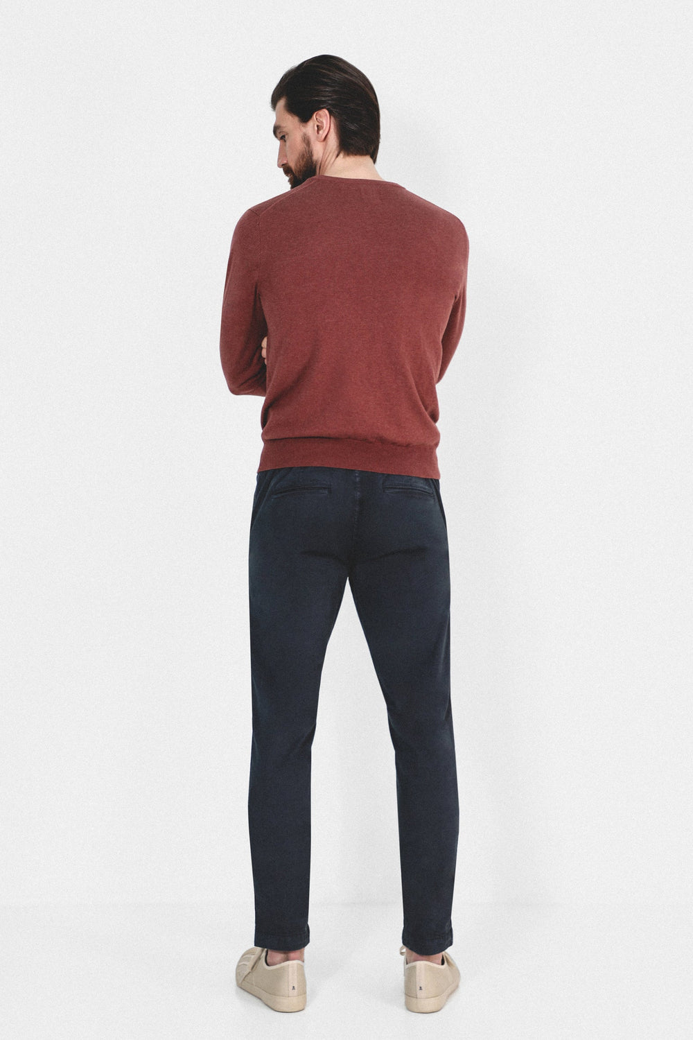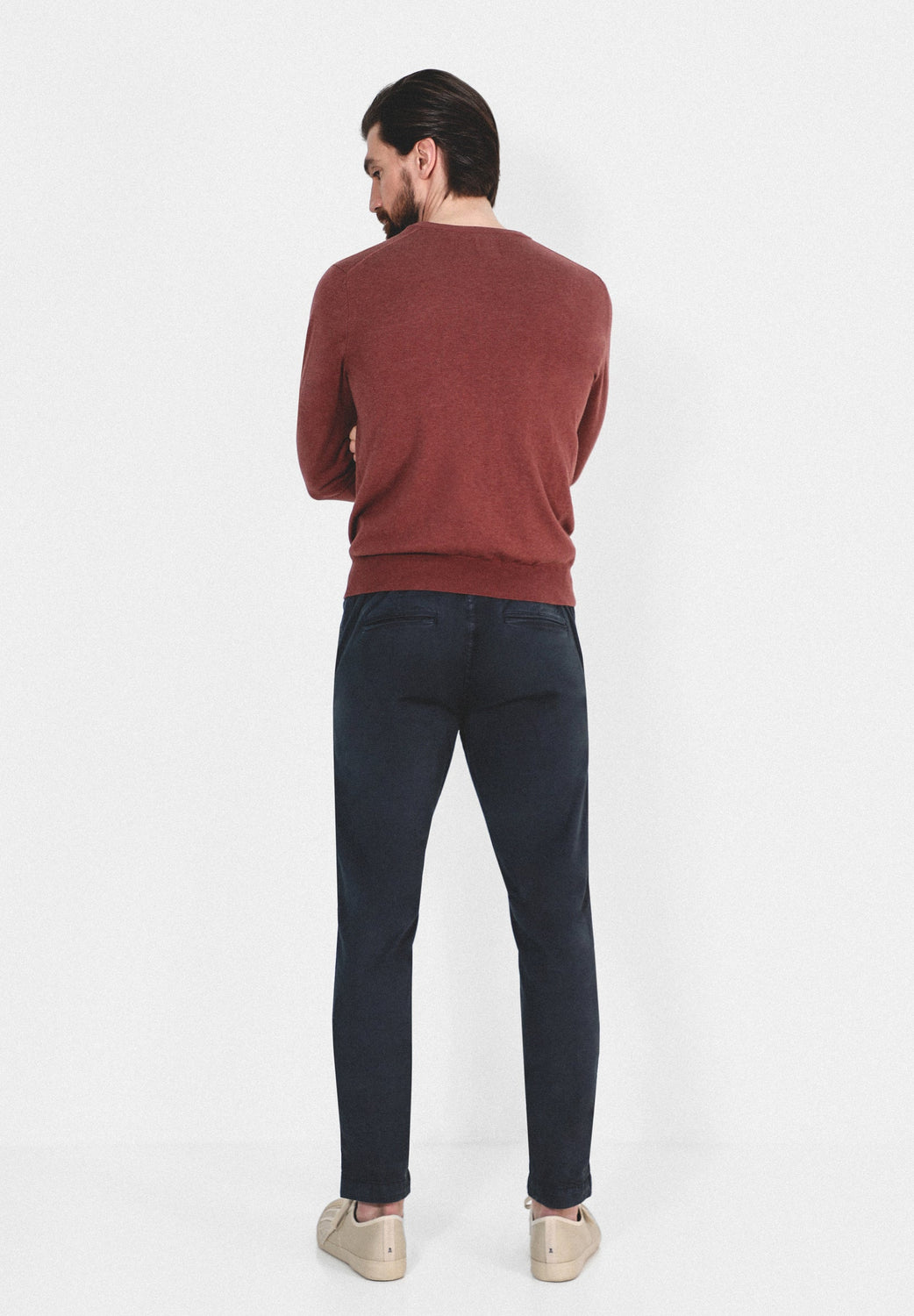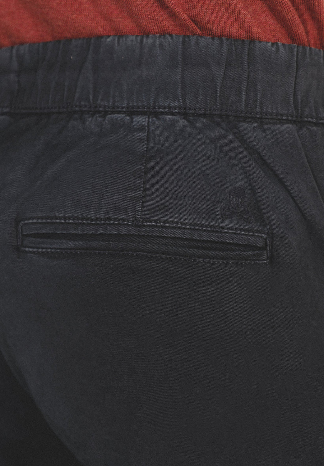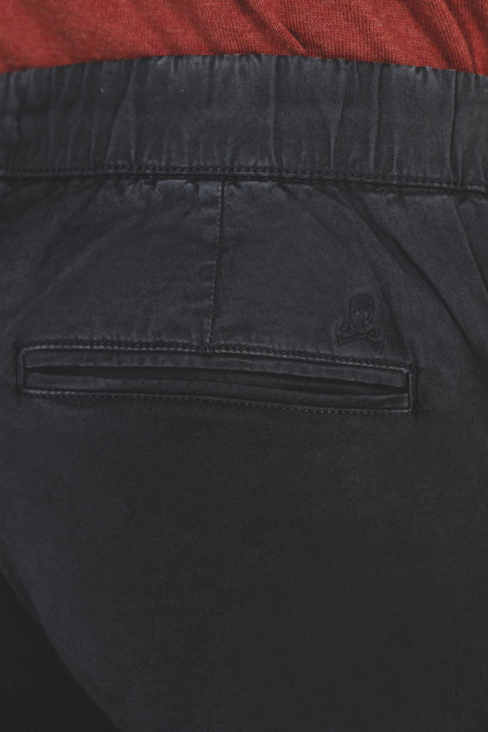 Pantalón confeccionado en tejido de algodón ligeramente elástico. Corte Regular Fit con elástico, cierre con cordones y bolsillos laterales y de plastrón con tapeta y botón.