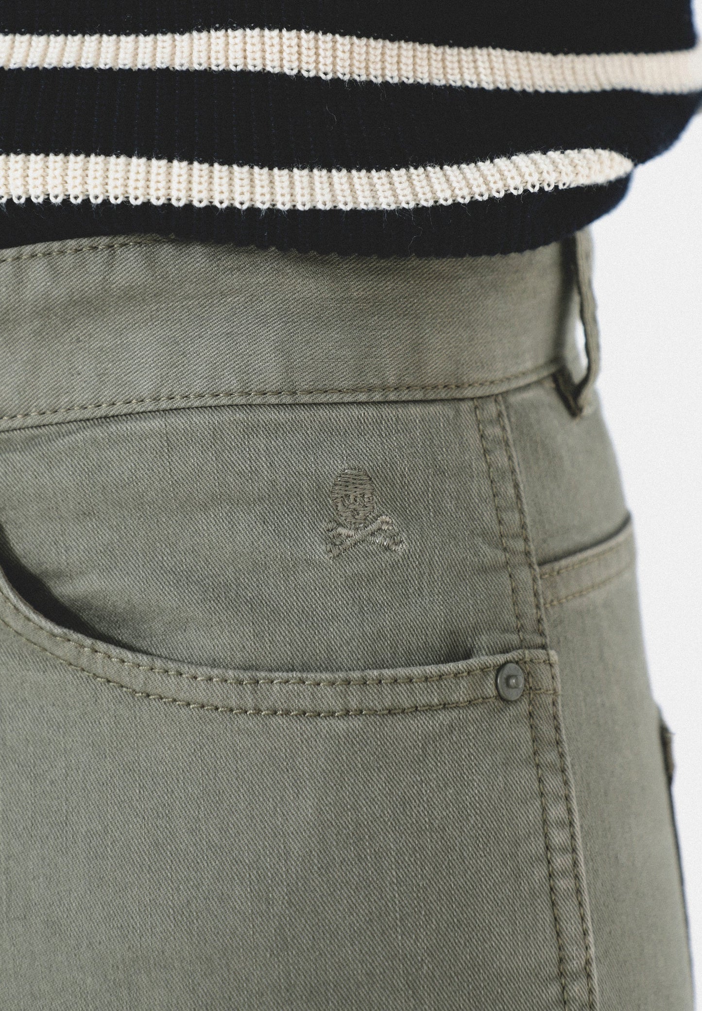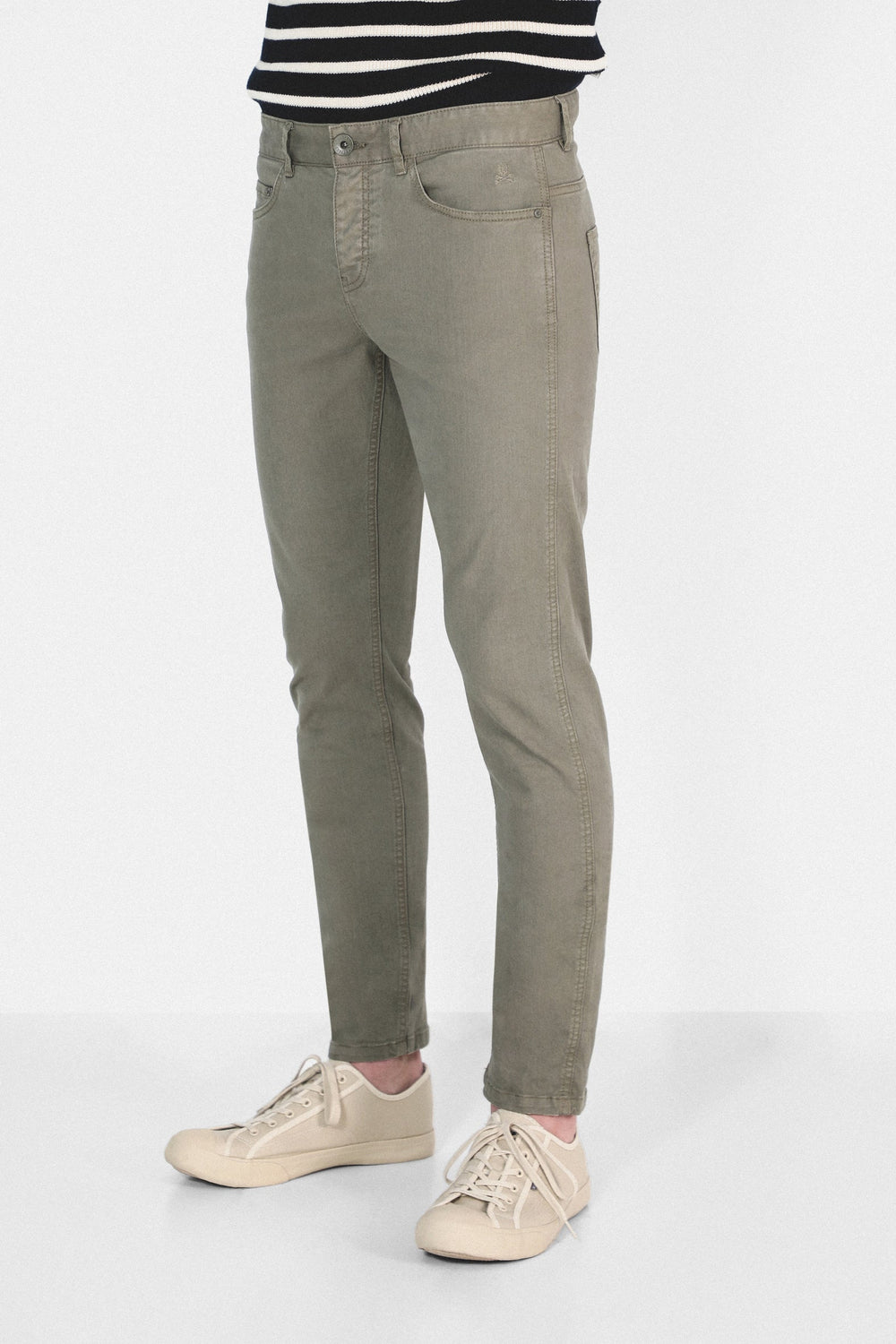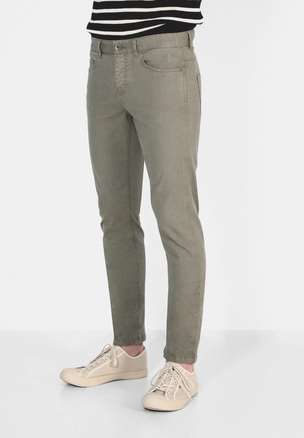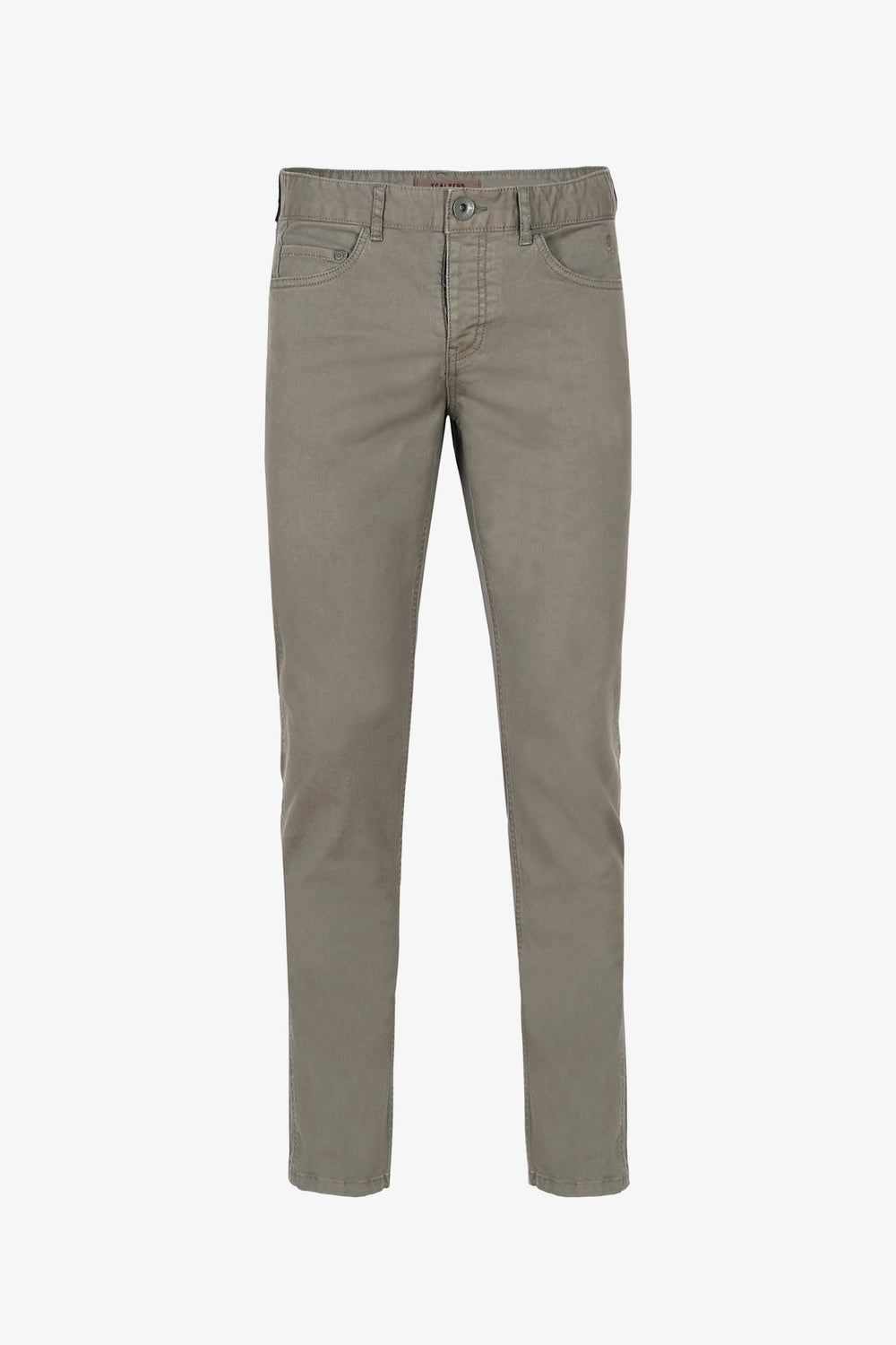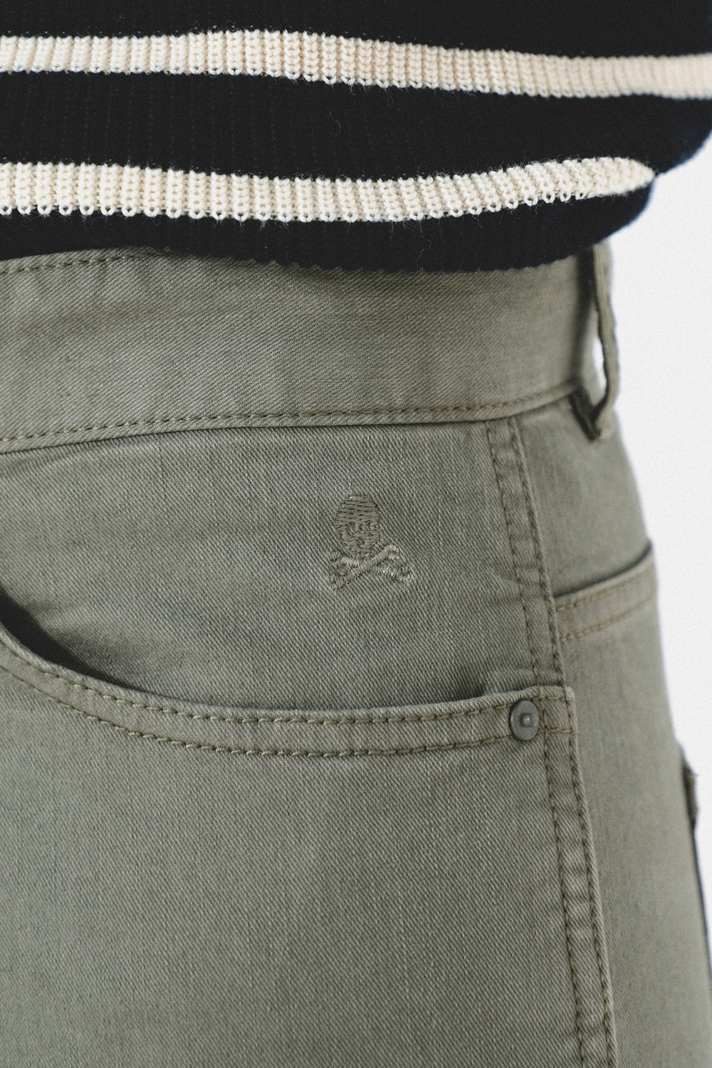 Pantalón confeccionado en tejido de algodón garment dyed. Corte Slim Fit, cierre con botón y cremallera. Cinco bolsillos y trabillas. Logo bordado en el bolsillo.