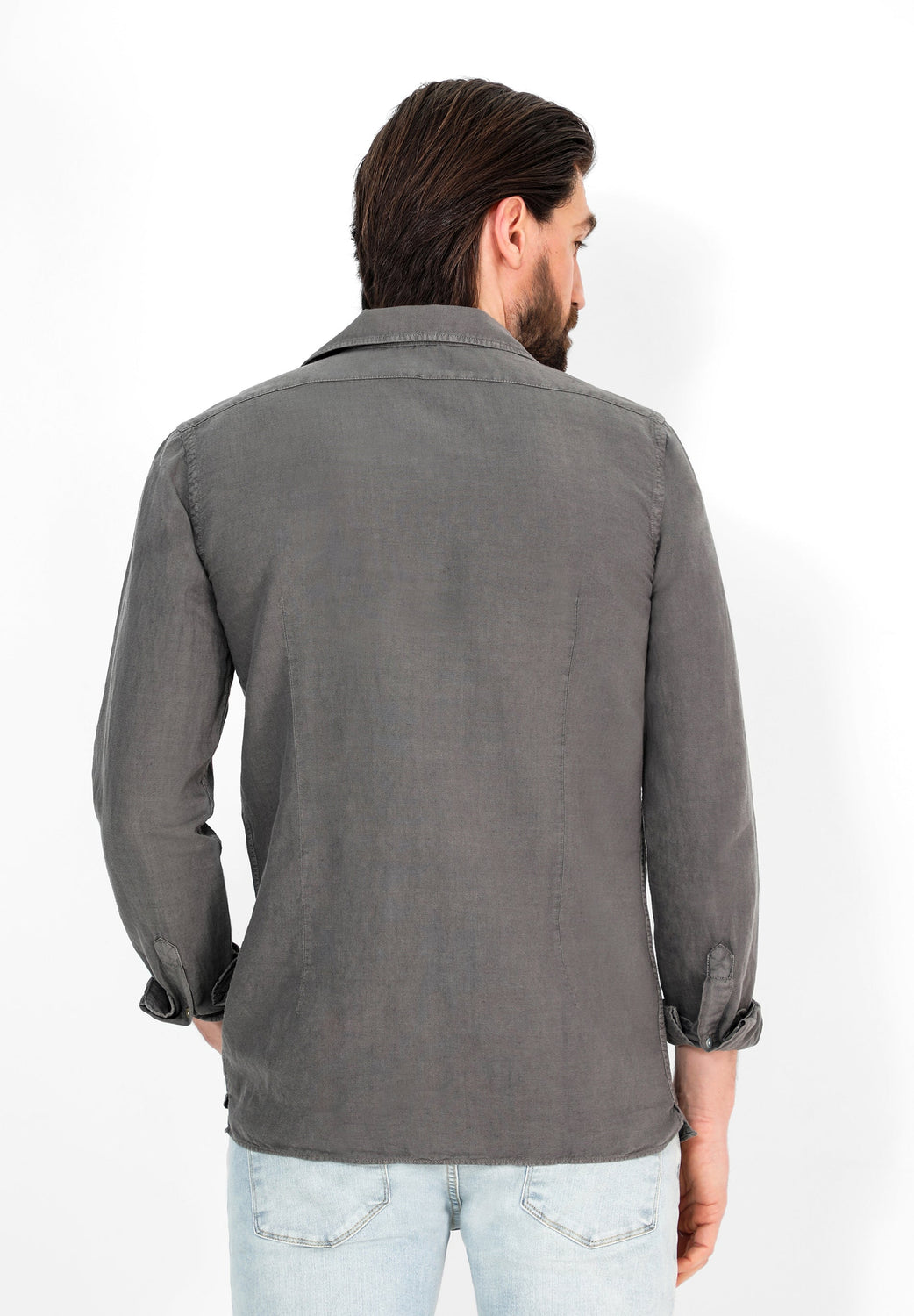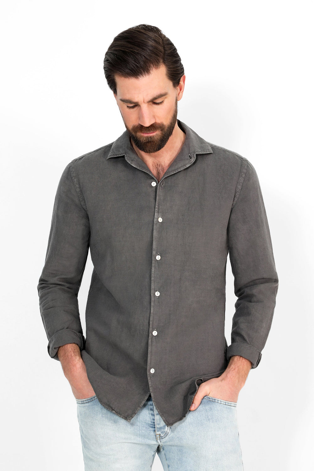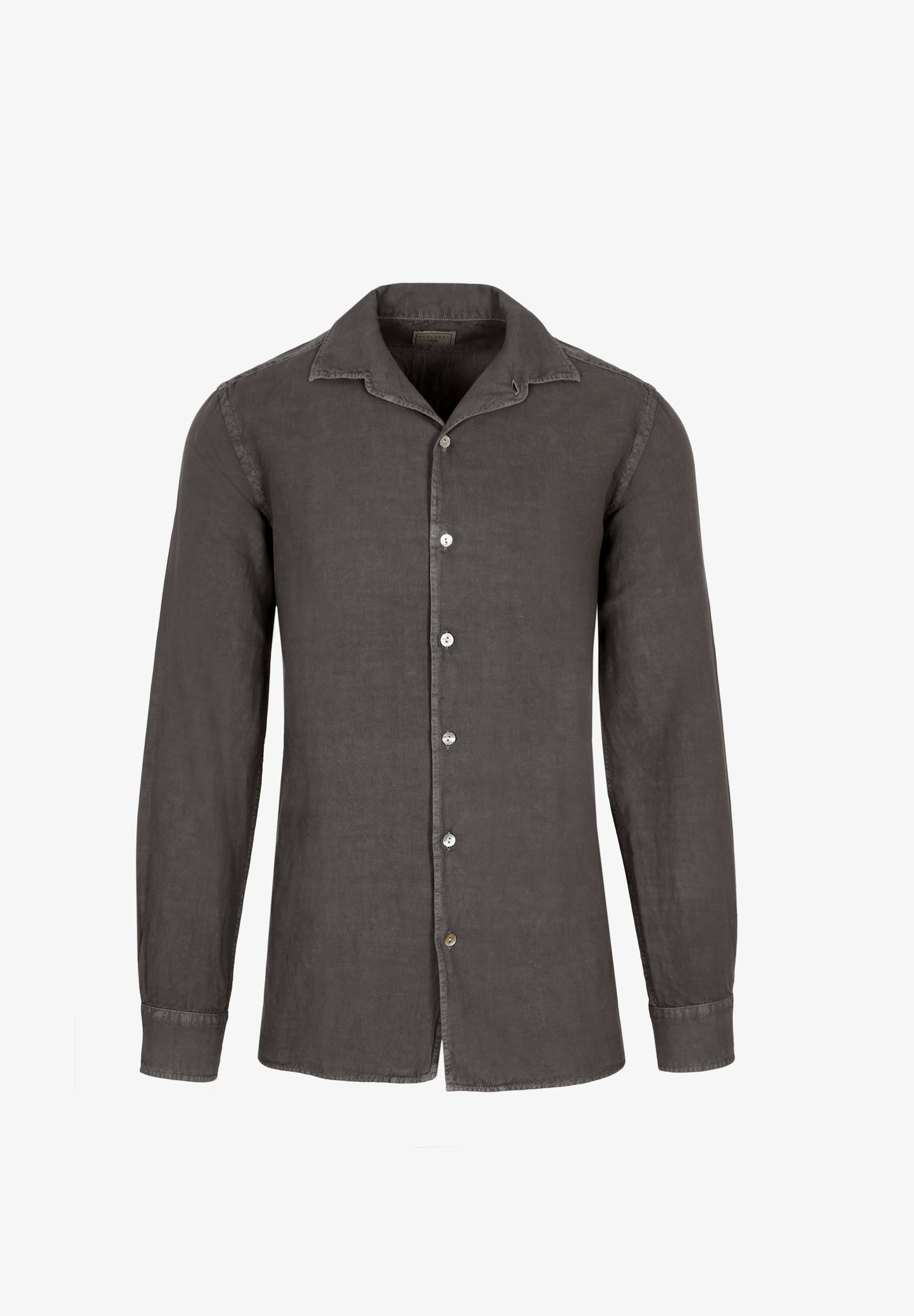 Camisa confeccionada en tejido 100% lino. Corte Regular Fit, cuello pijamero y cierre con botones. Manga larga terminada en puño con botones.