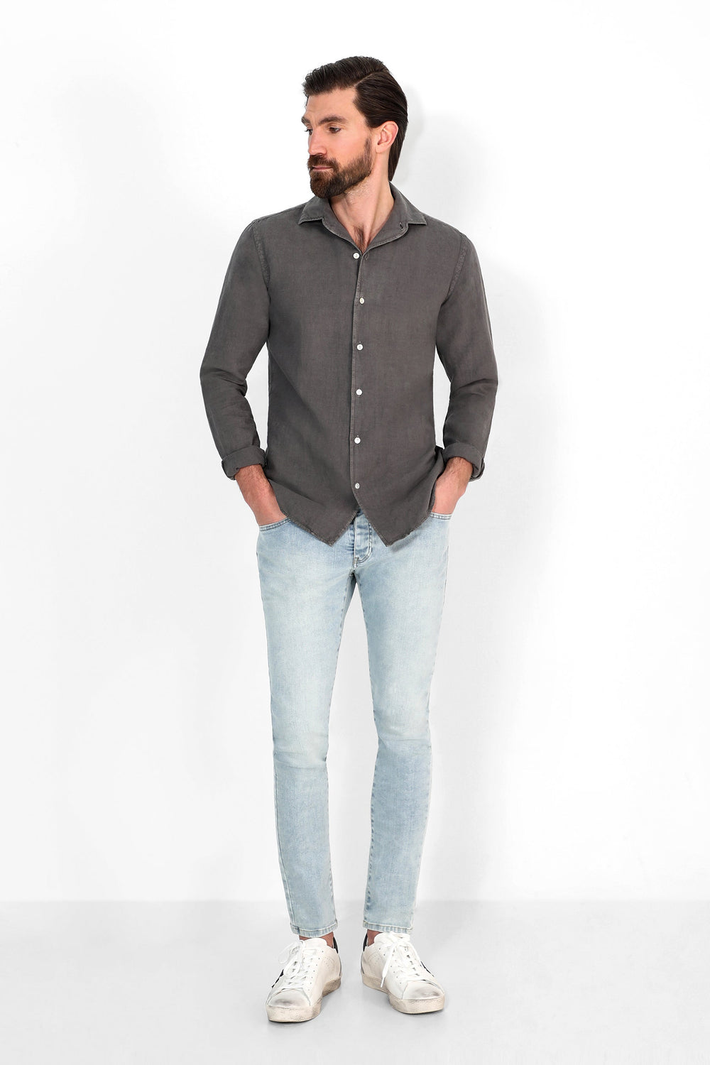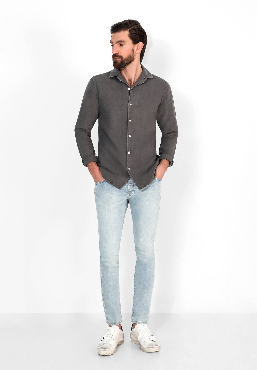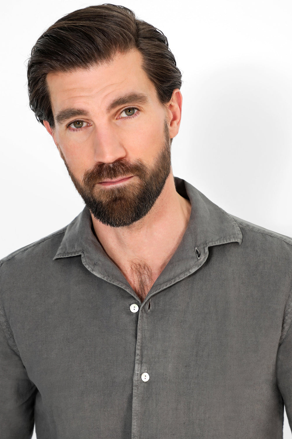 Camisa confeccionada en tejido 100% lino. Corte Regular Fit, cuello pijamero y cierre con botones. Manga larga terminada en puño con botones.