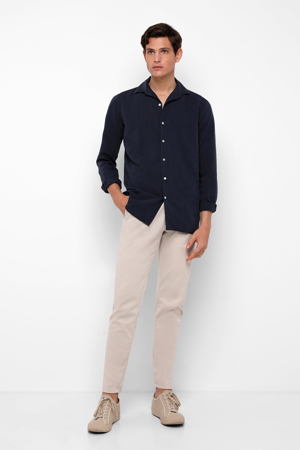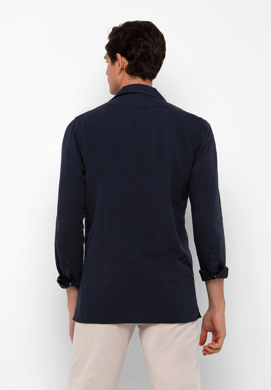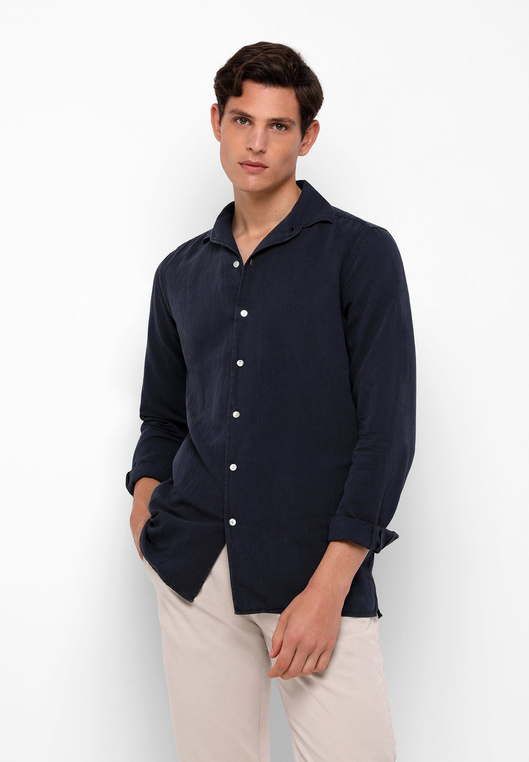 Camisa confeccionada en tejido 100% lino. Corte Regular Fit, cuello pijamero y cierre con botones. Manga larga terminada en puño con botones.