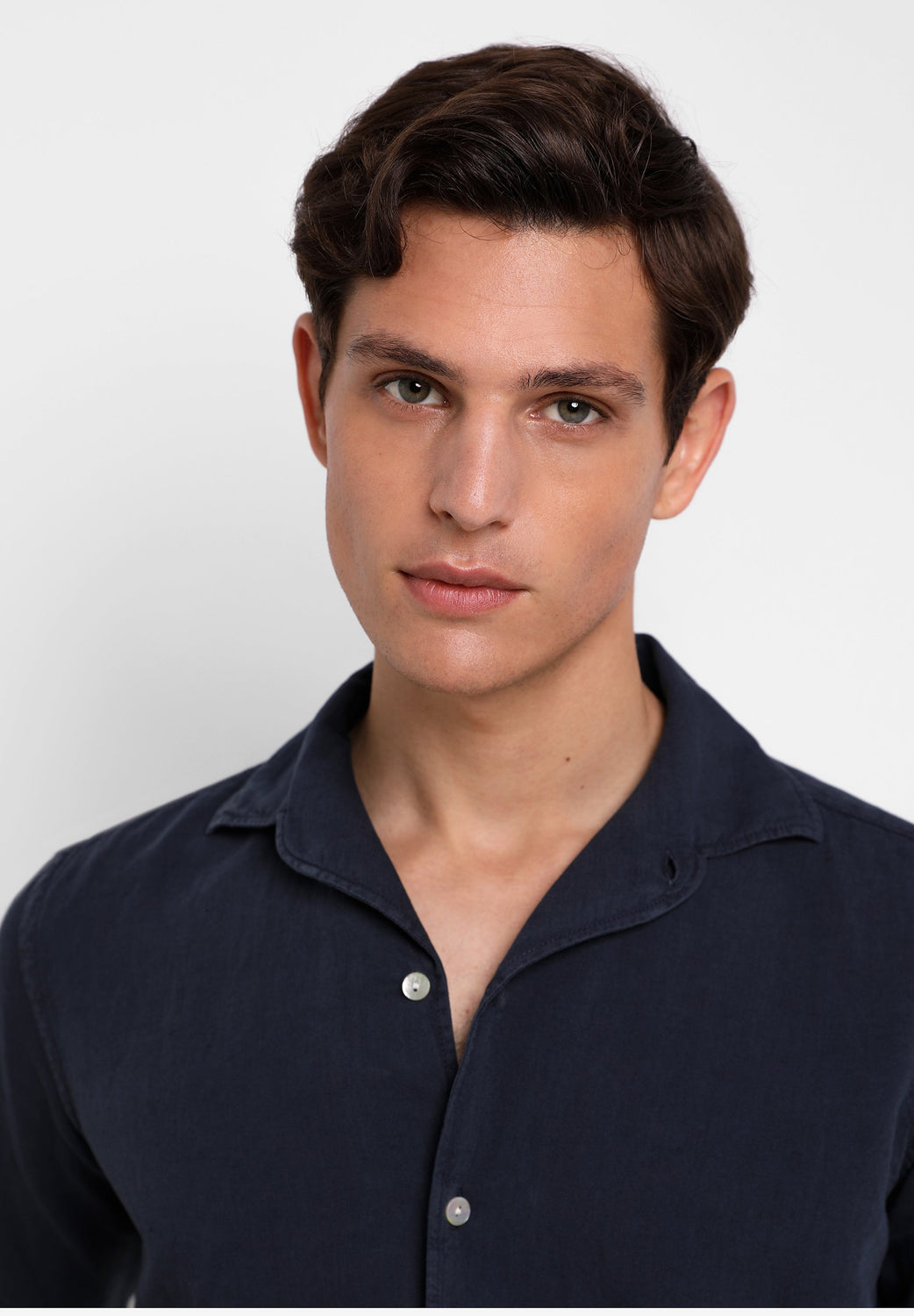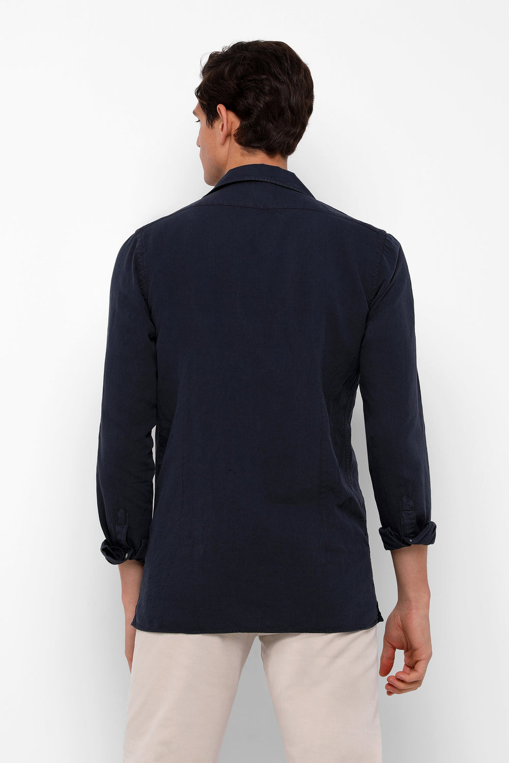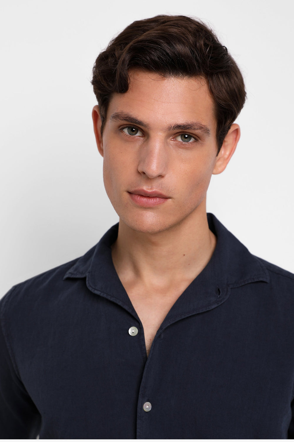 Camisa confeccionada en tejido 100% lino. Corte Regular Fit, cuello pijamero y cierre con botones. Manga larga terminada en puño con botones.