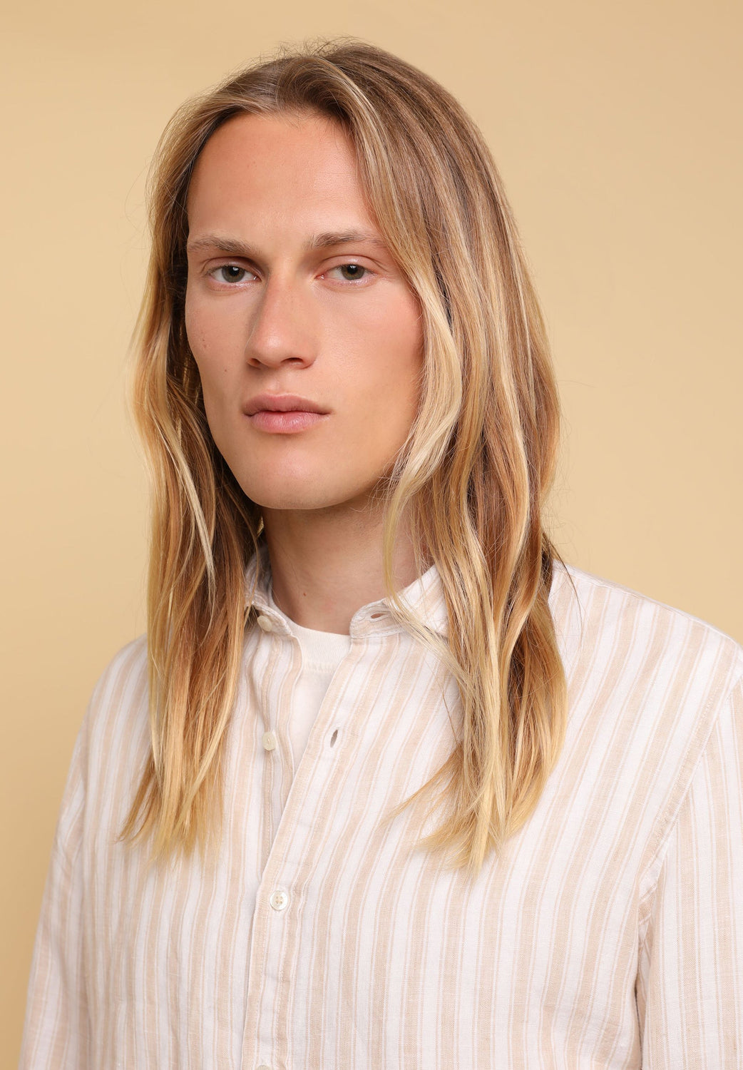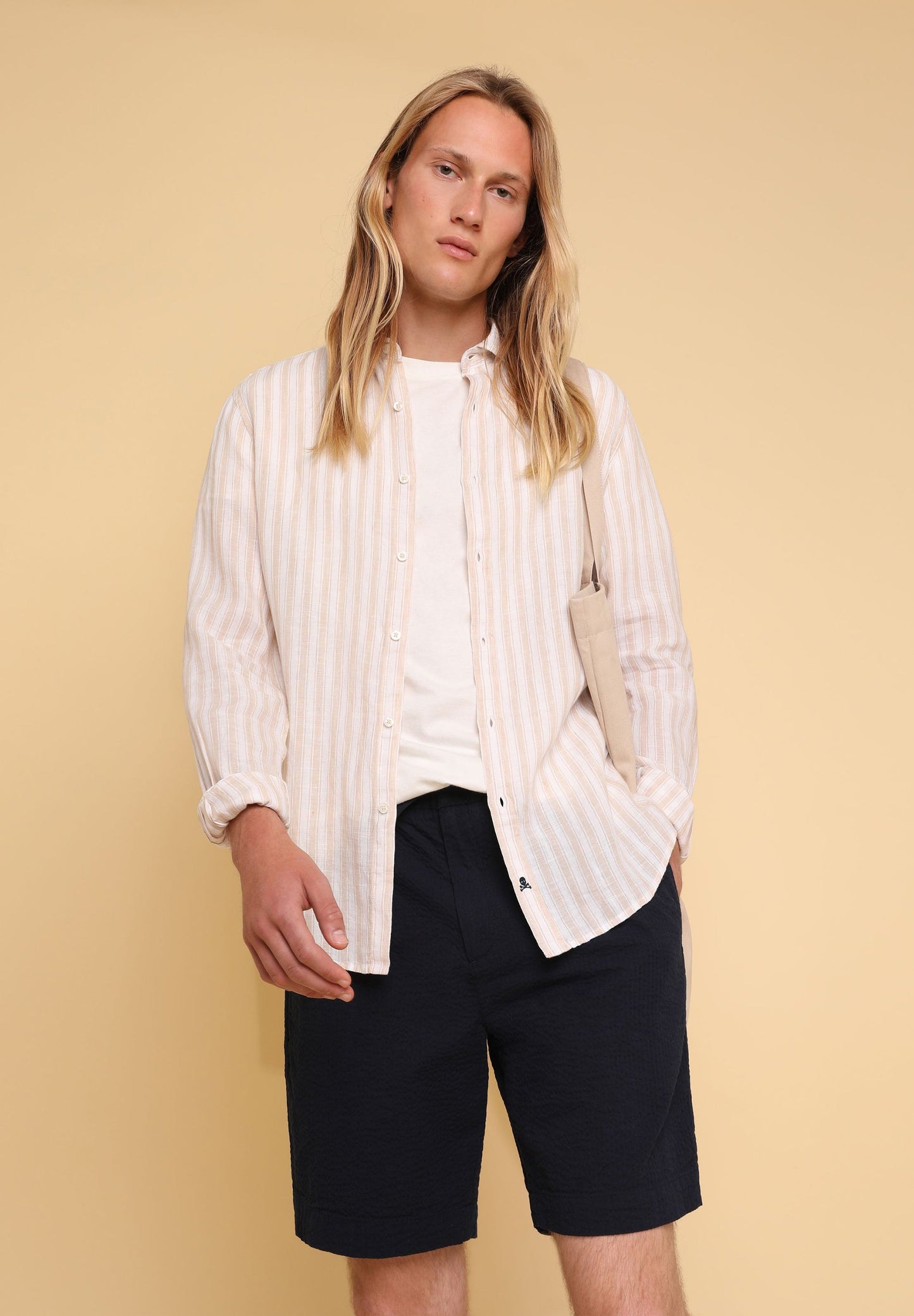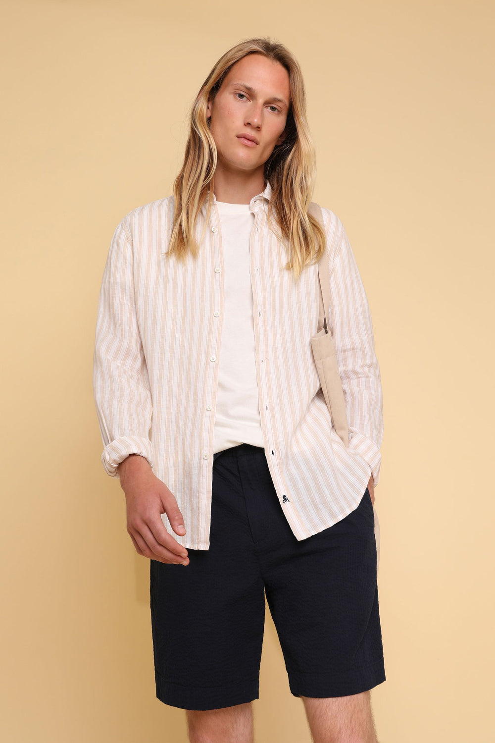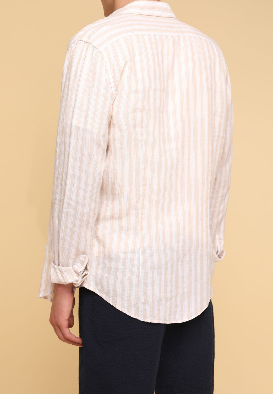 Camisa de rayas confeccionada en tejido 100% lino. Corte Slim Fit, cuello italiano y cierre con botones. Manga larga terminada en puño con botones.