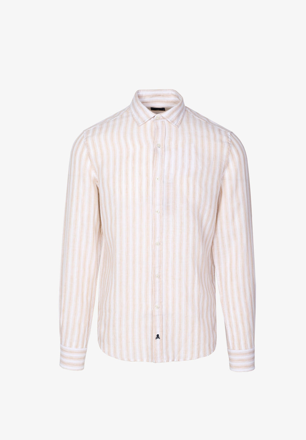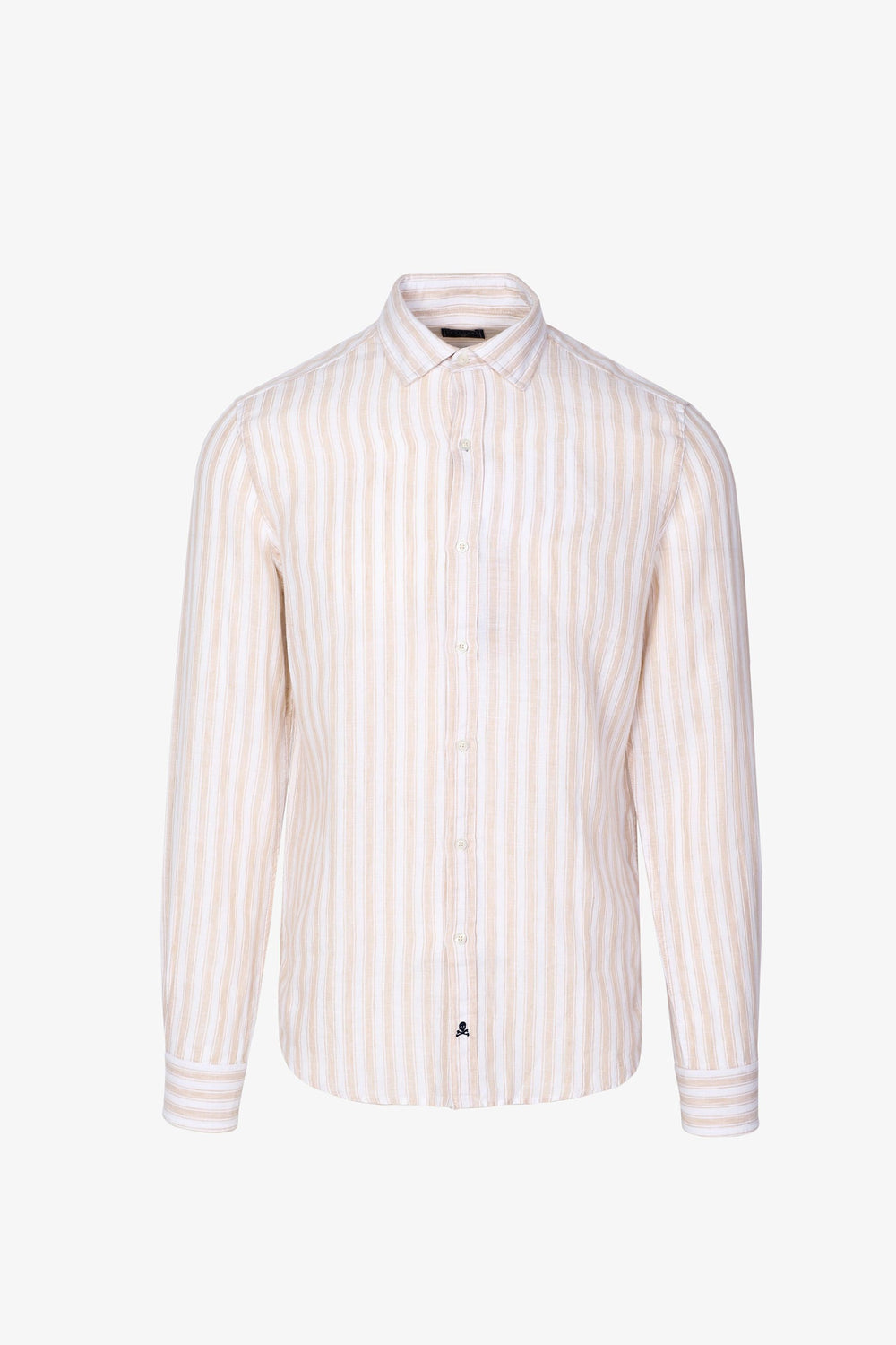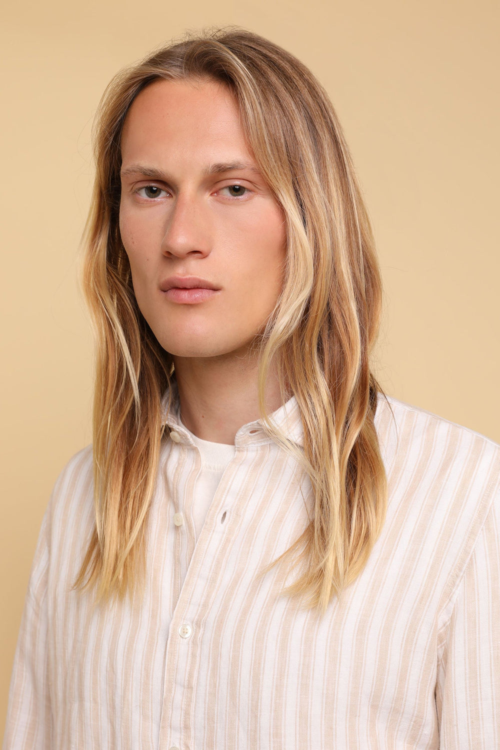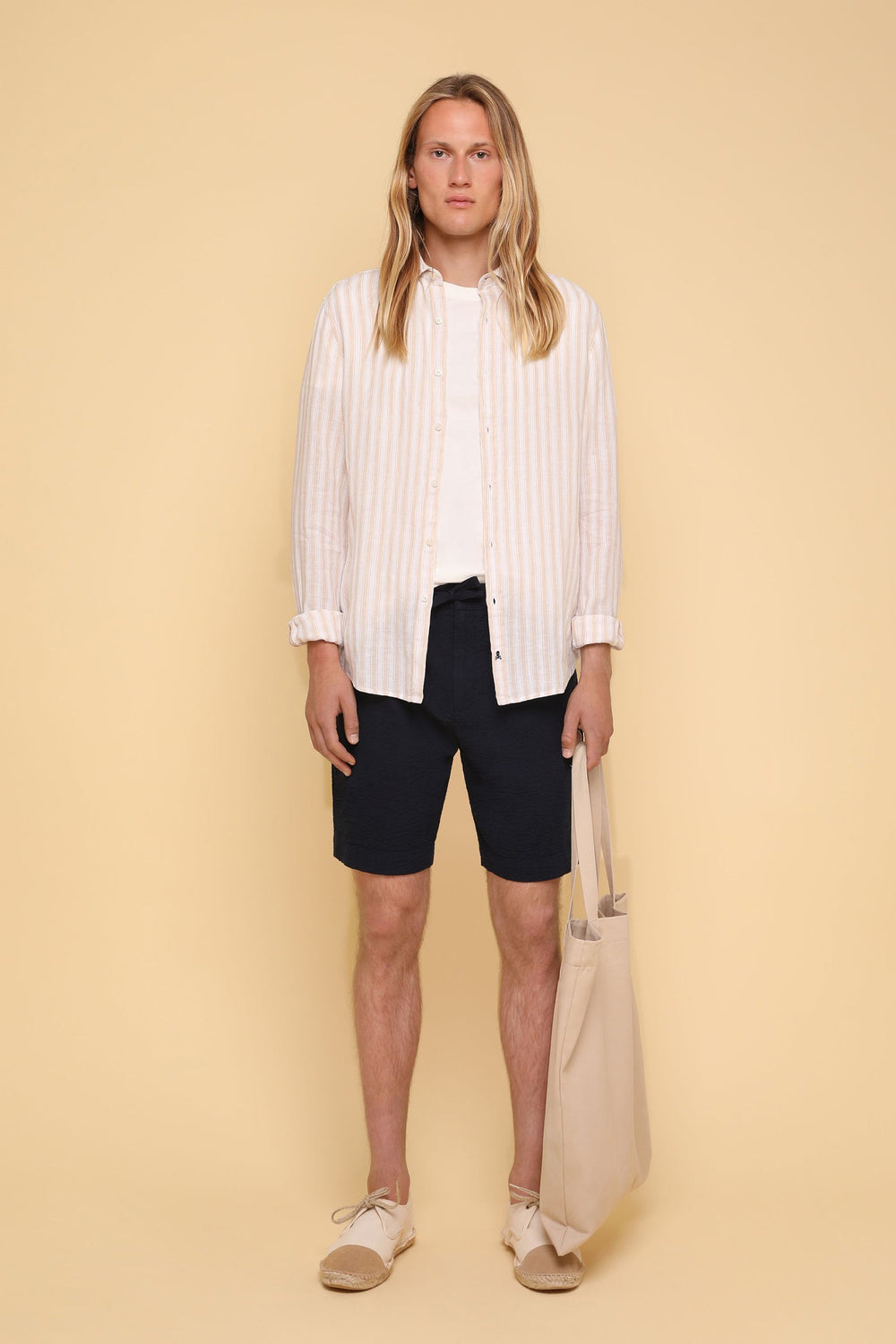 Camisa de rayas confeccionada en tejido 100% lino. Corte Slim Fit, cuello italiano y cierre con botones. Manga larga terminada en puño con botones.