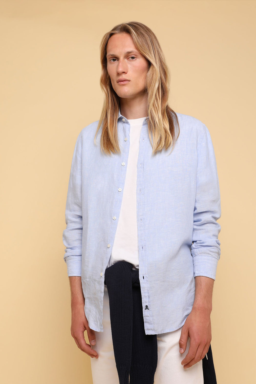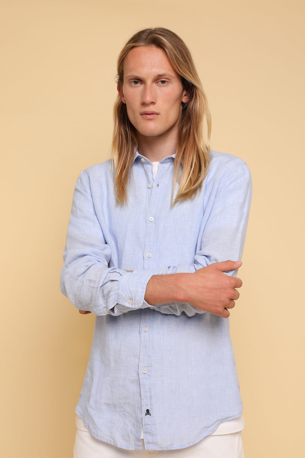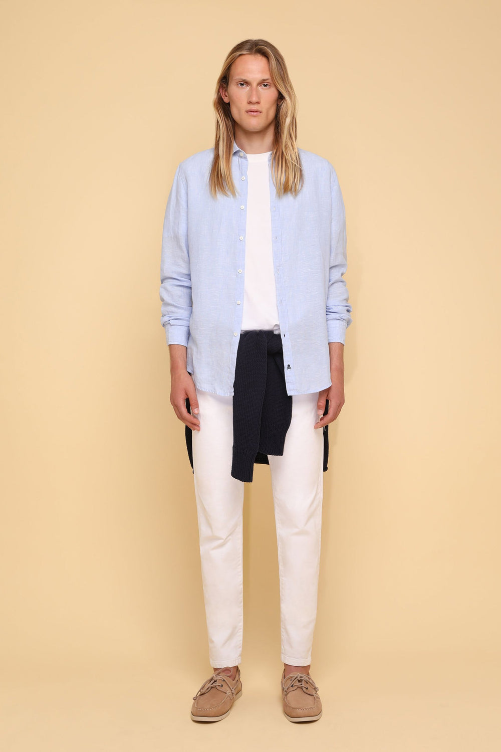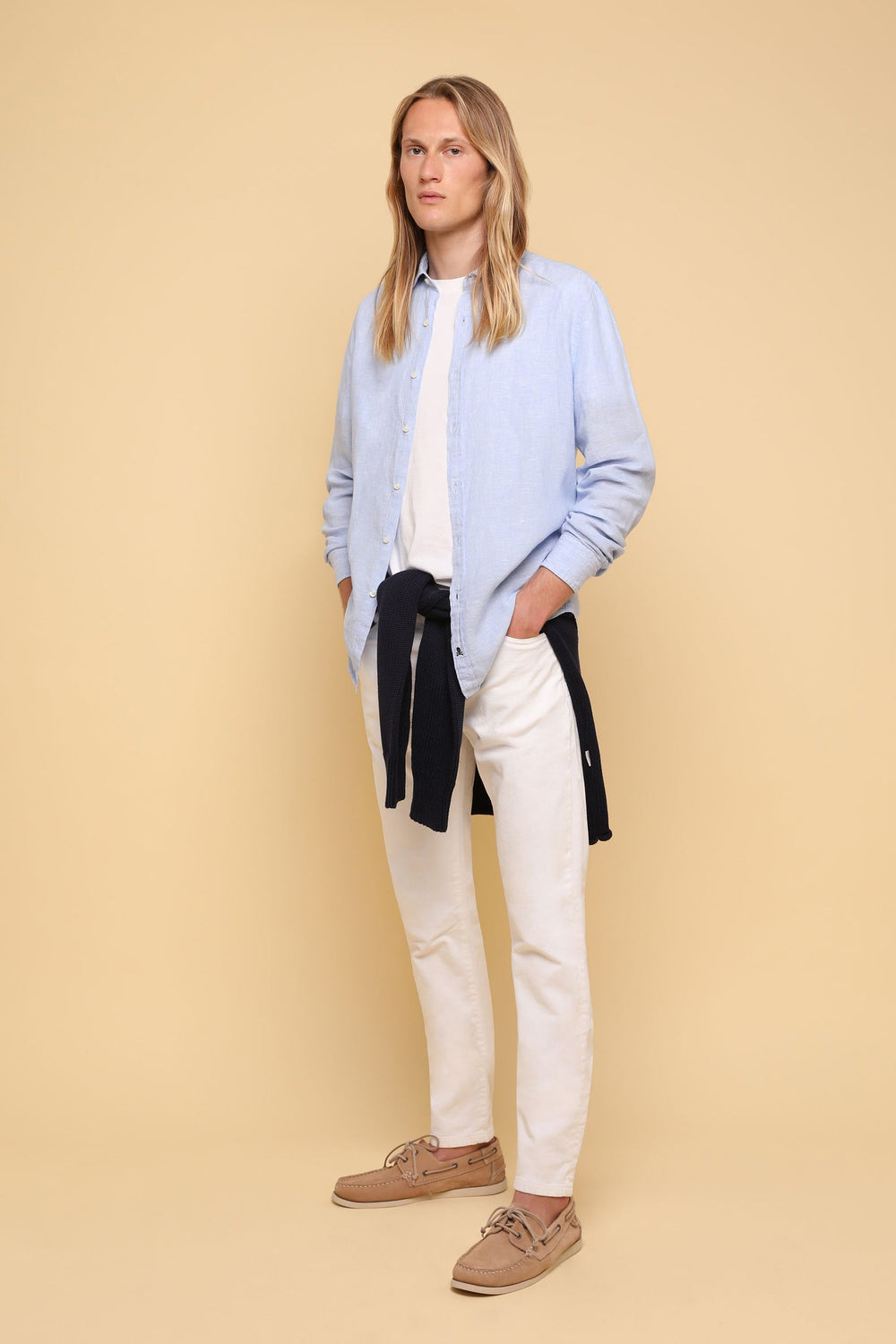Camisa confeccionada en tejido 100% lino. Corte Slim Fit, cuello italiano y cierre con botones. Manga larga terminada en puño con botones.