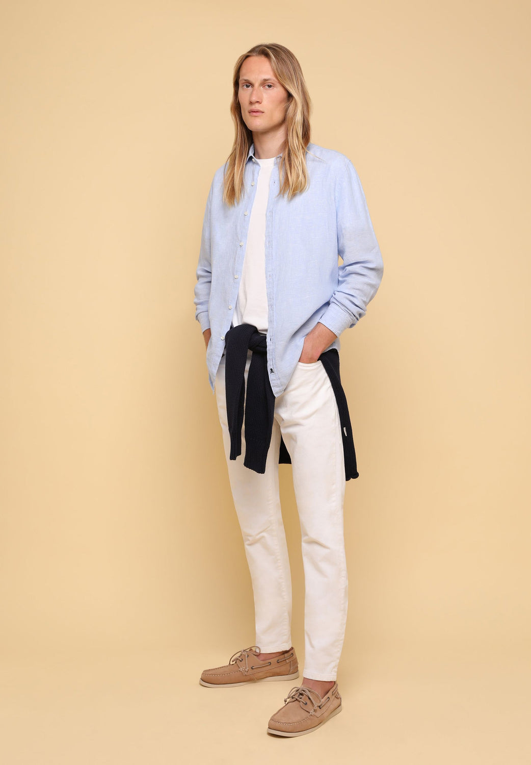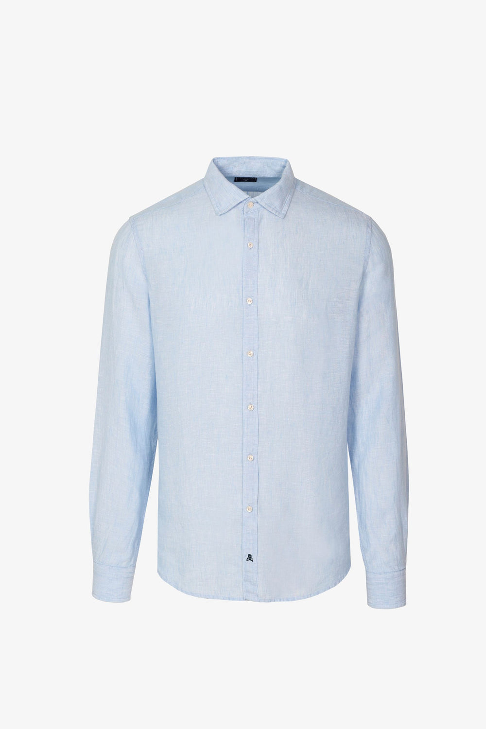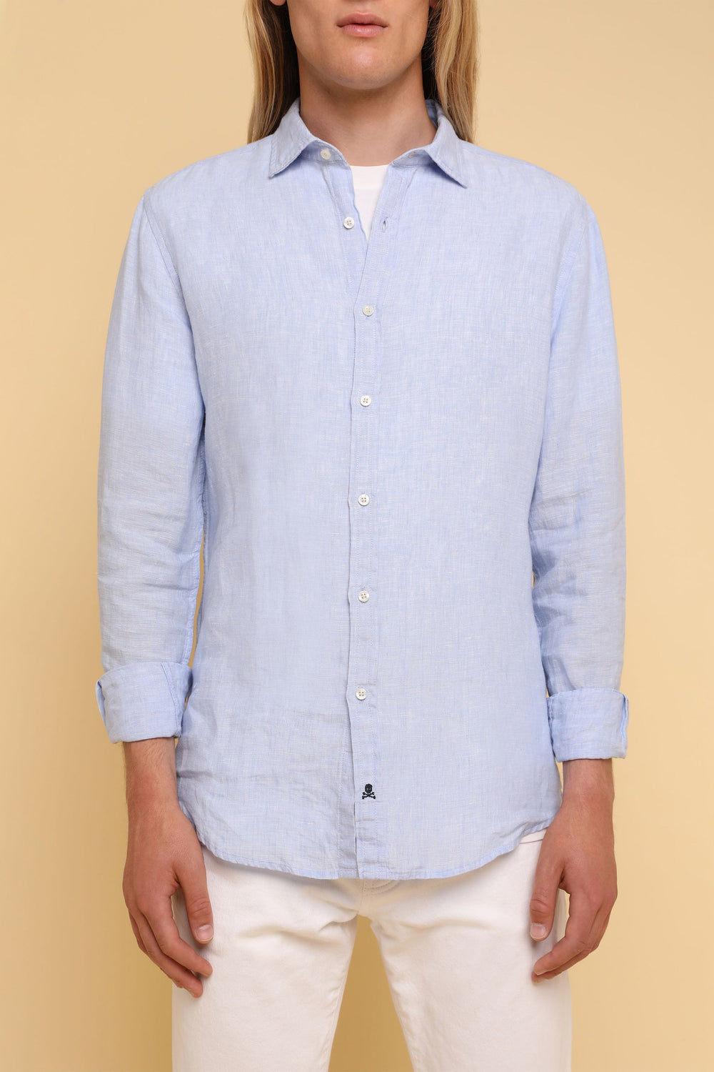 Camisa confeccionada en tejido 100% lino. Corte Slim Fit, cuello italiano y cierre con botones. Manga larga terminada en puño con botones.