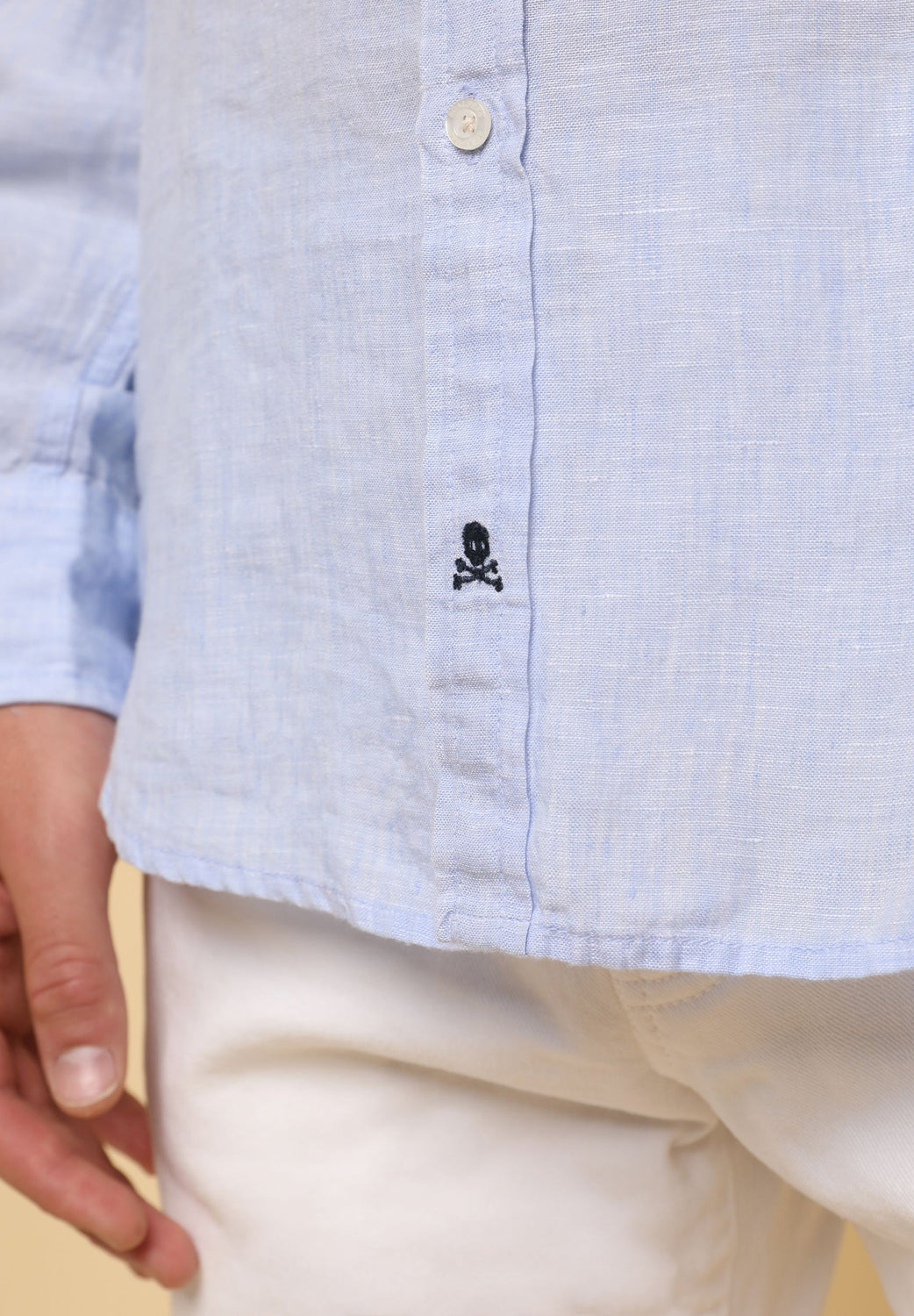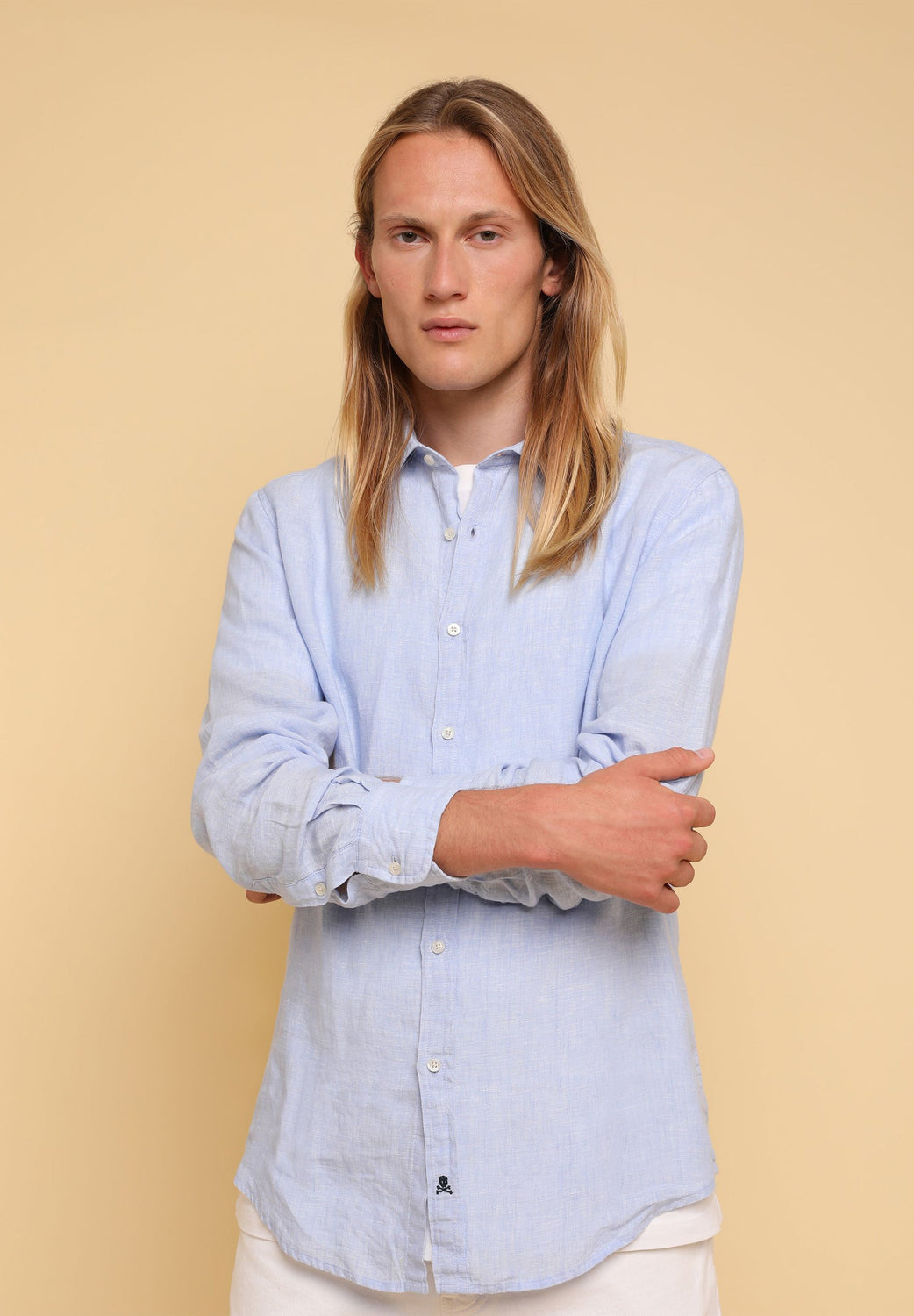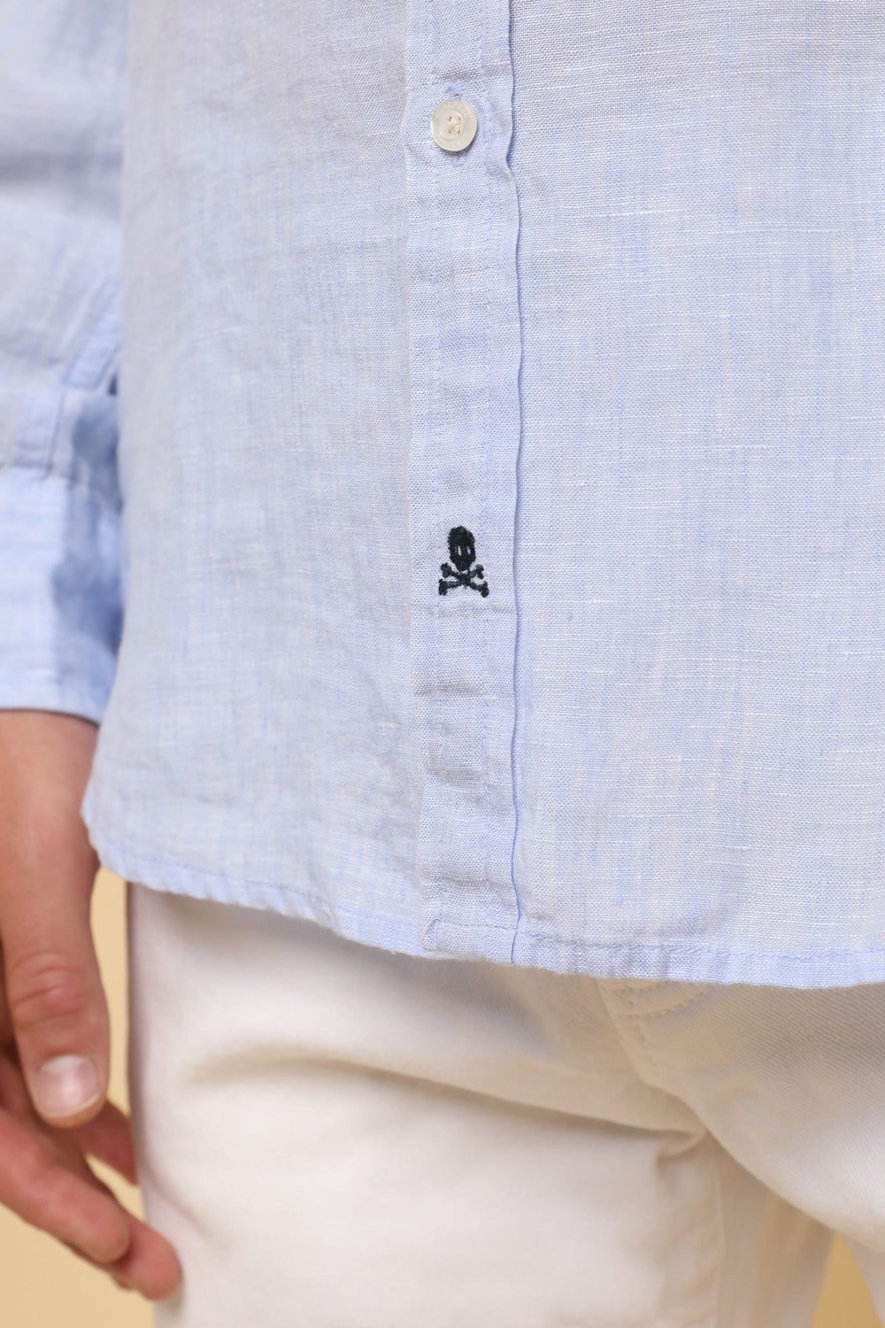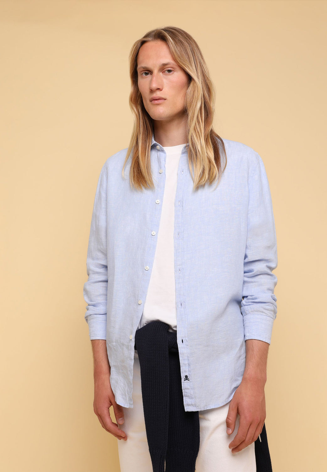 Camisa confeccionada en tejido 100% lino. Corte Slim Fit, cuello italiano y cierre con botones. Manga larga terminada en puño con botones.
