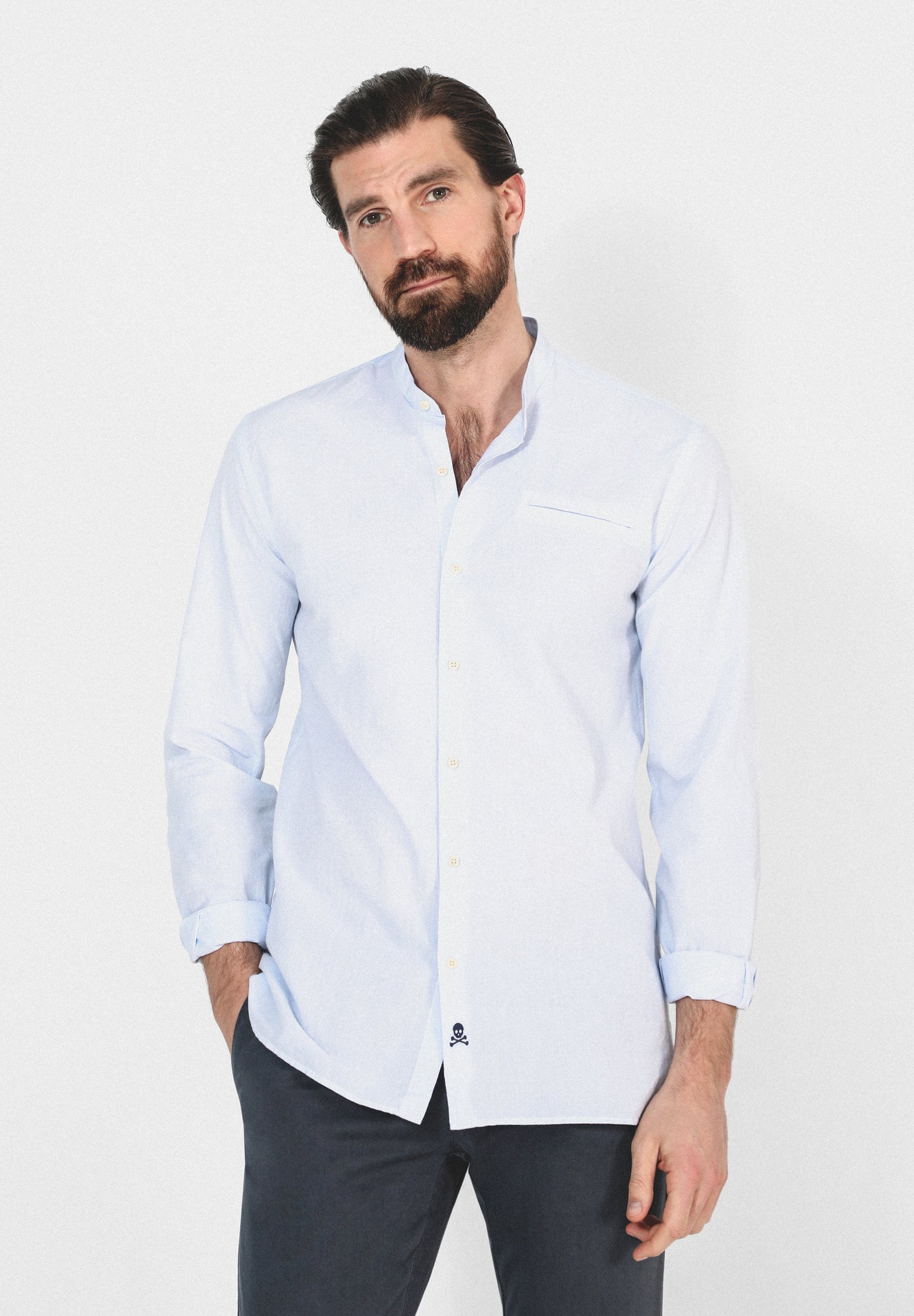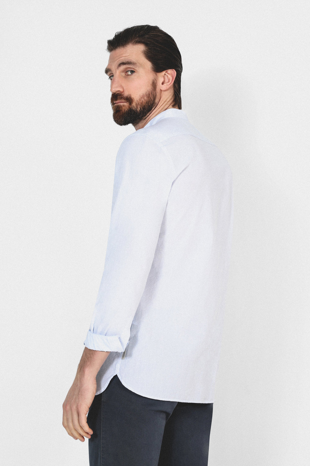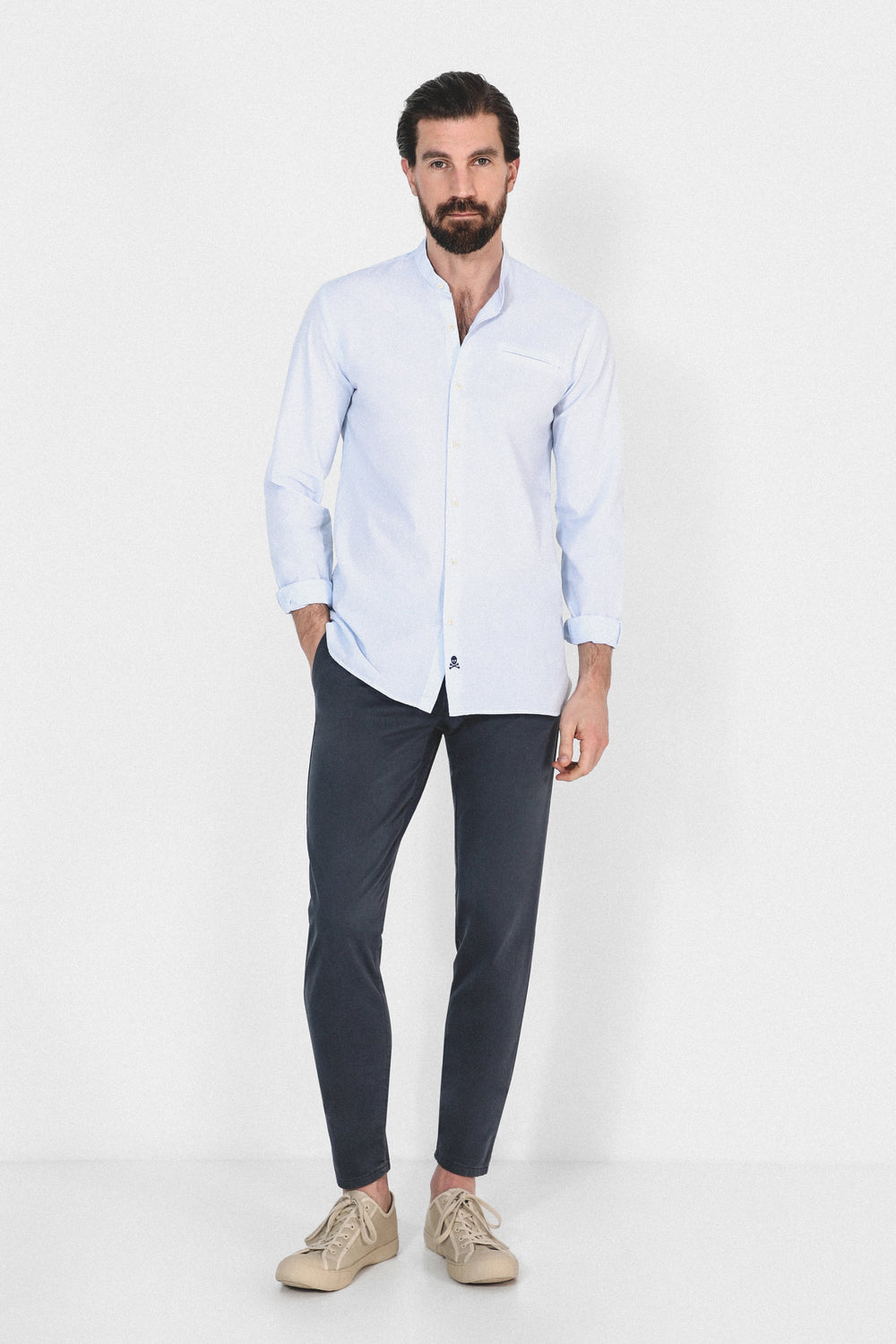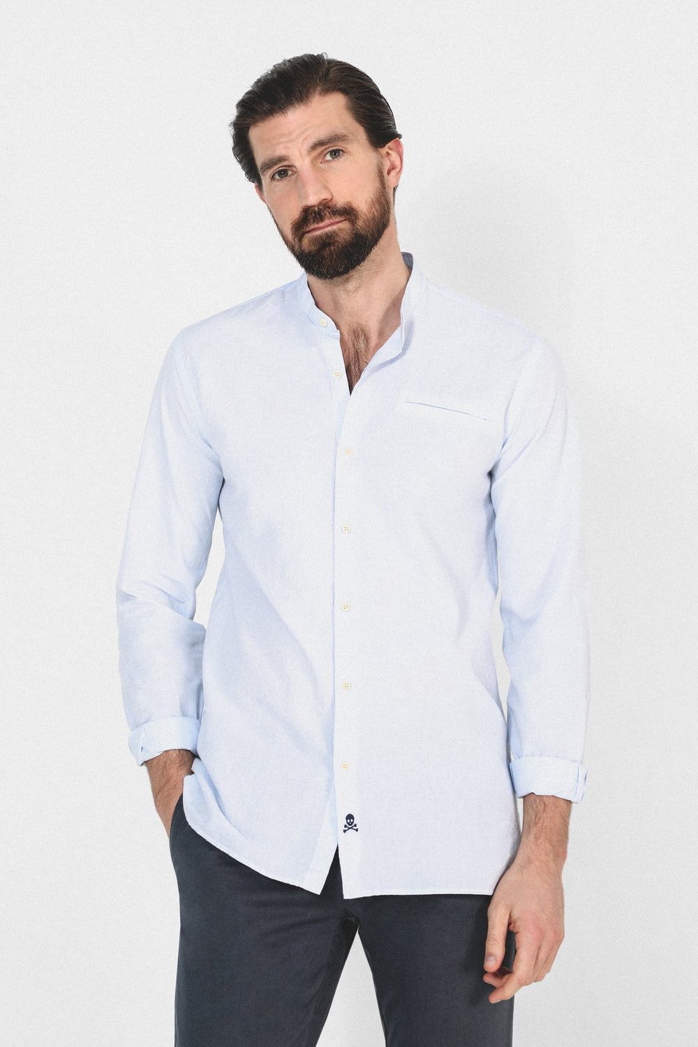 Camisa con fantasía confeccionada en tejido 100% algodón. Corte Regular Fit, cuello mao y cierre con botones. Manga larga terminada en puño y bolsillo insertado en el pecho.