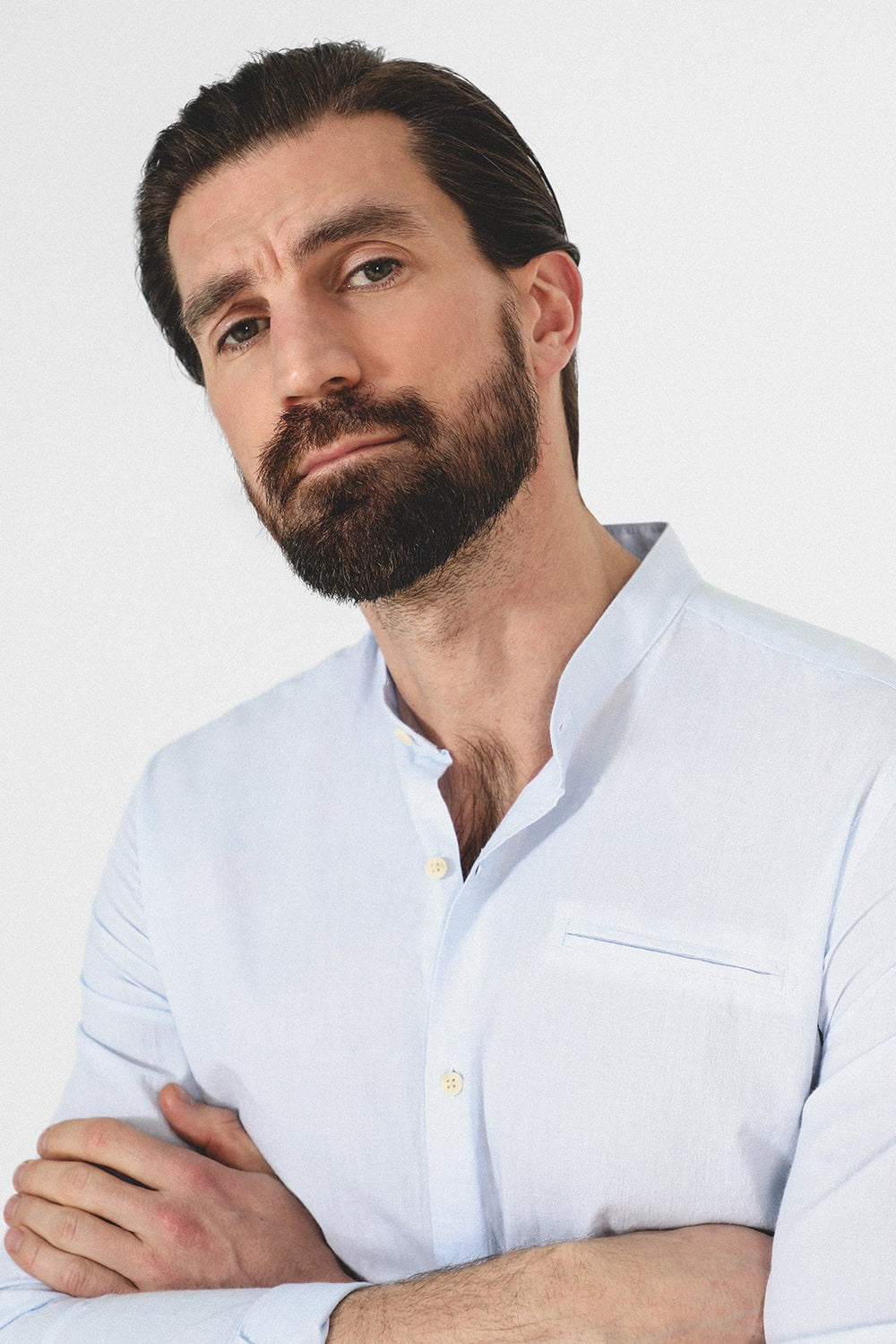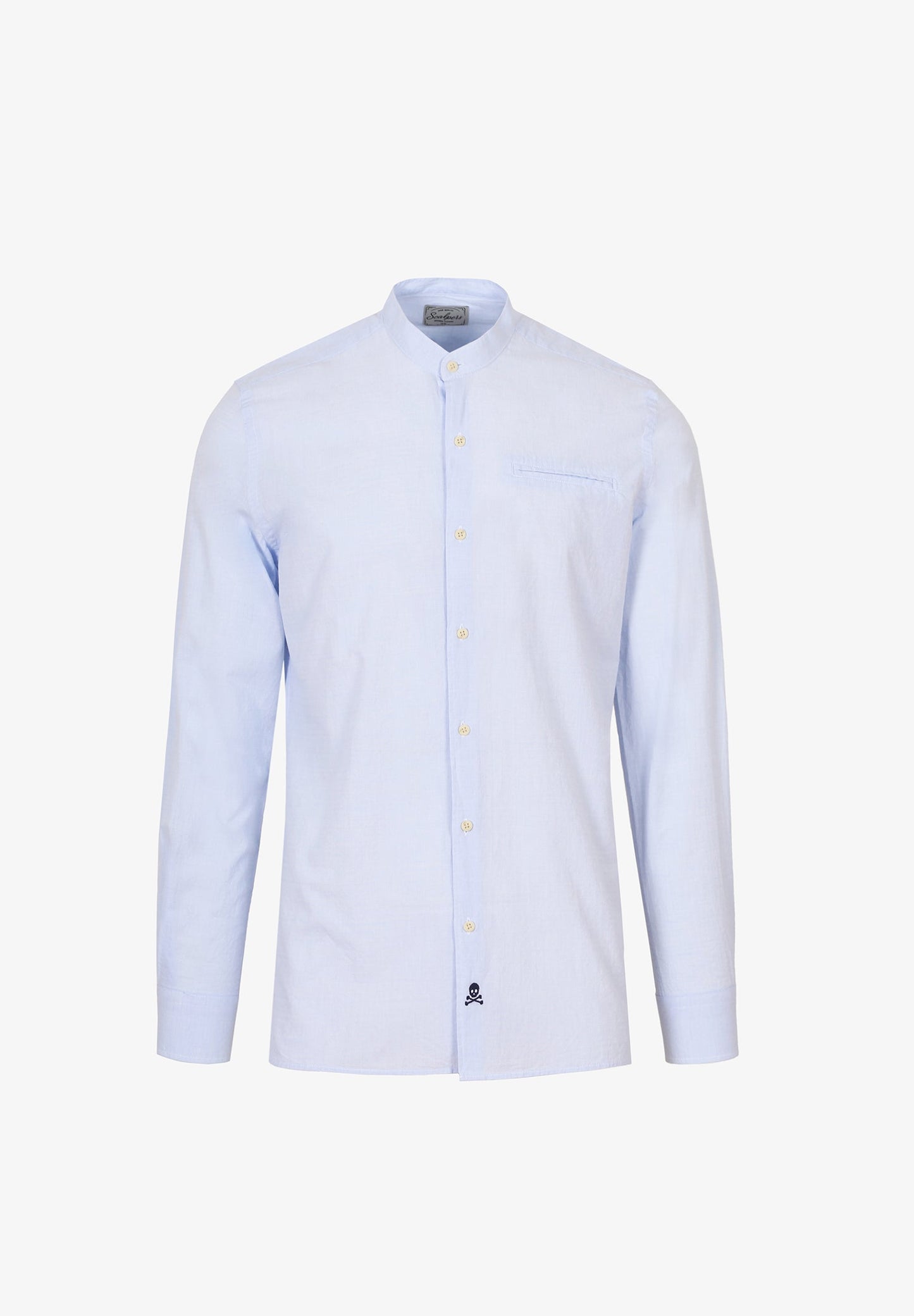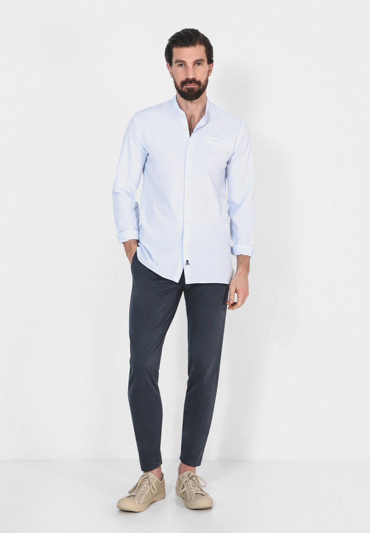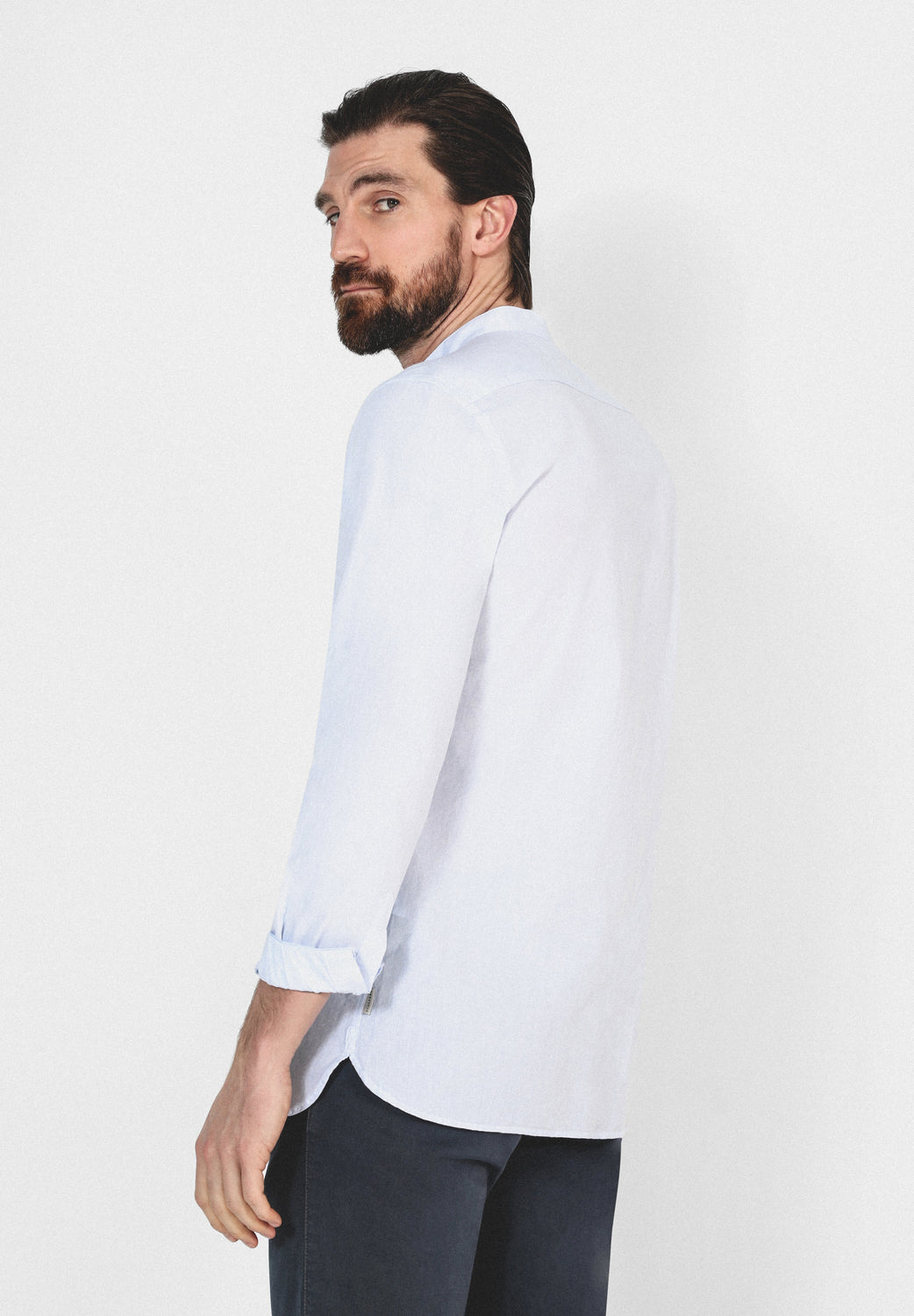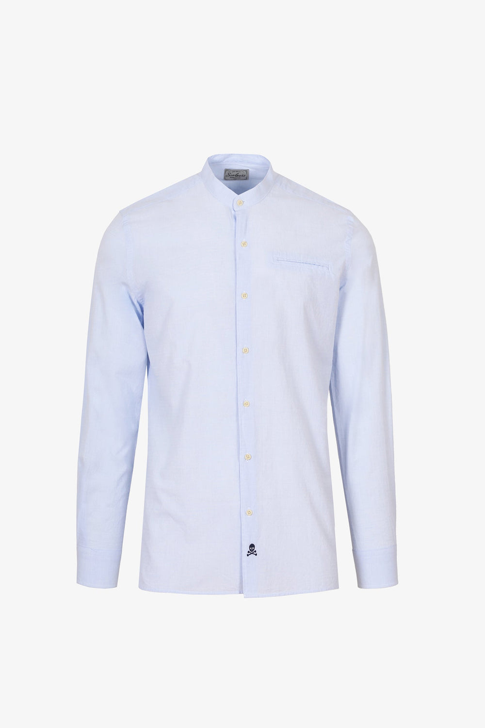 Camisa con fantasía confeccionada en tejido 100% algodón. Corte Regular Fit, cuello mao y cierre con botones. Manga larga terminada en puño y bolsillo insertado en el pecho.