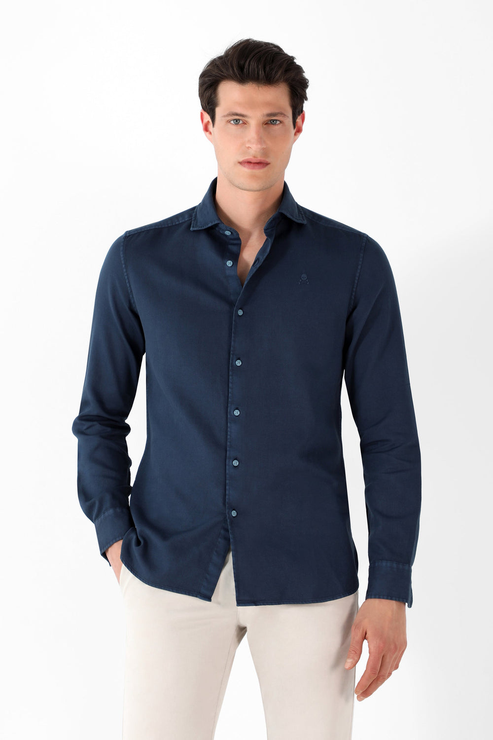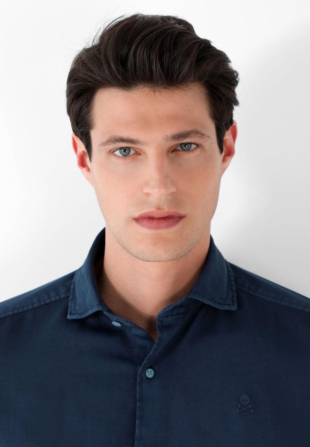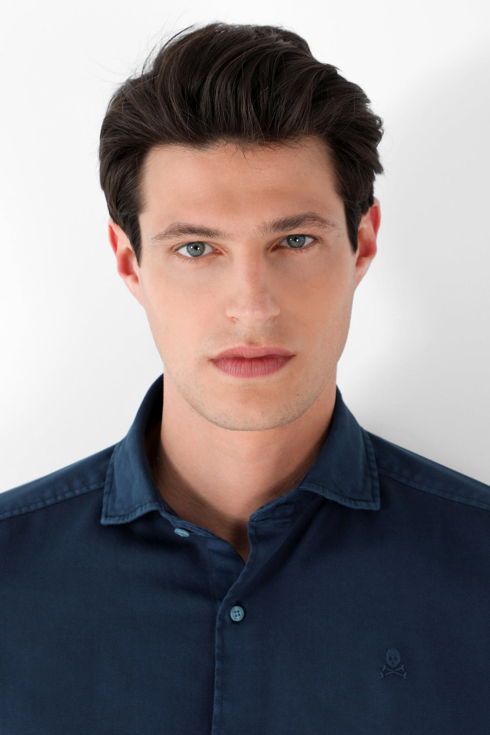 Camisa confeccionada en tejido 100% algodón tipo polo. Corte Regular Fit, cuello cutaway y cierre con botones. Manga larga terminada en puño con botones y detalle de calavera.