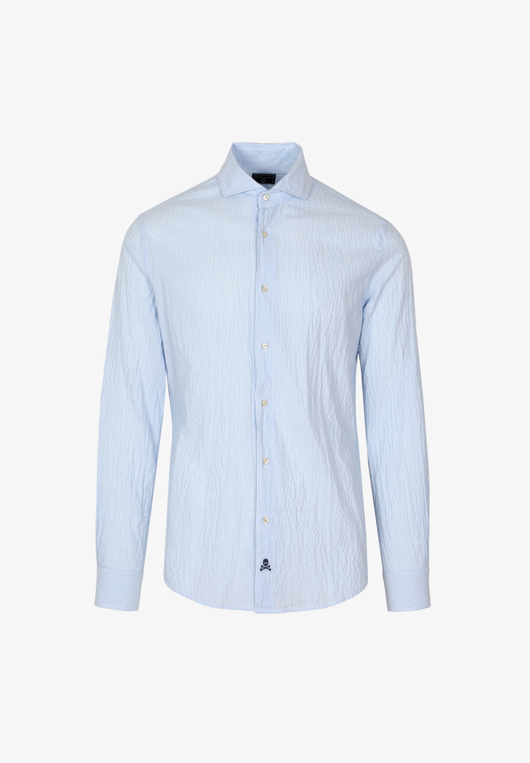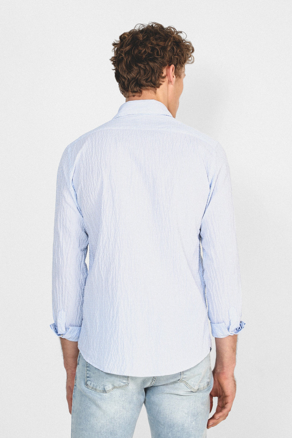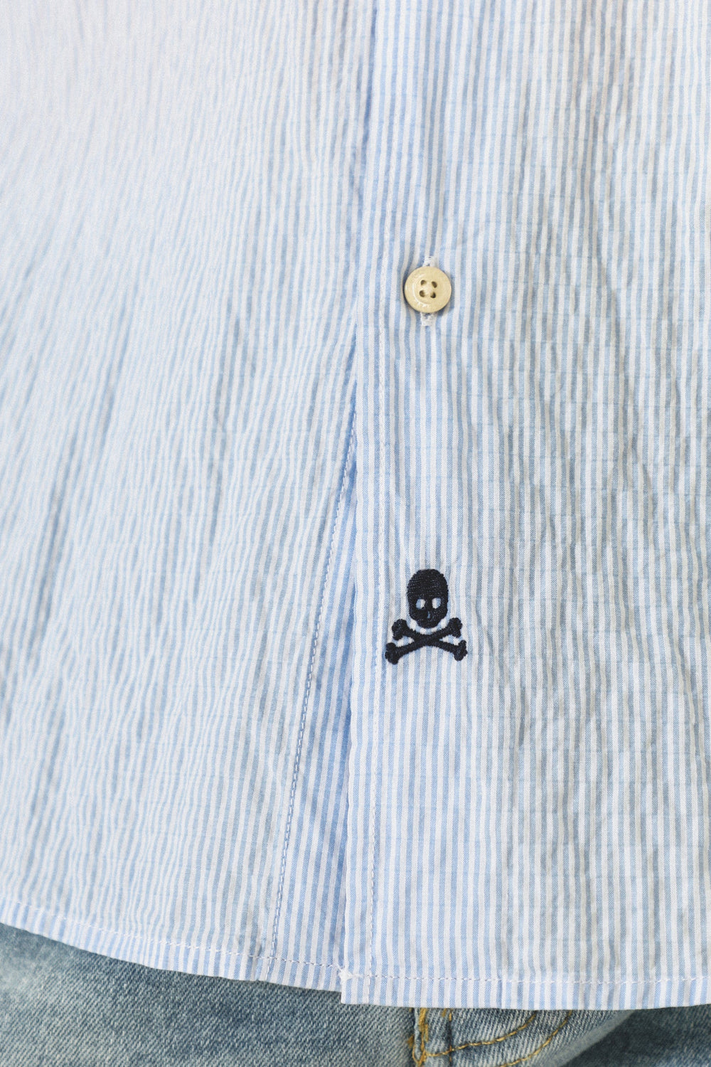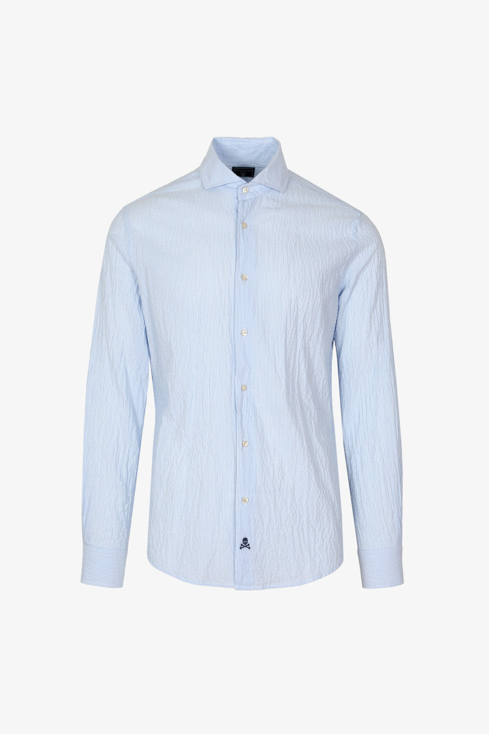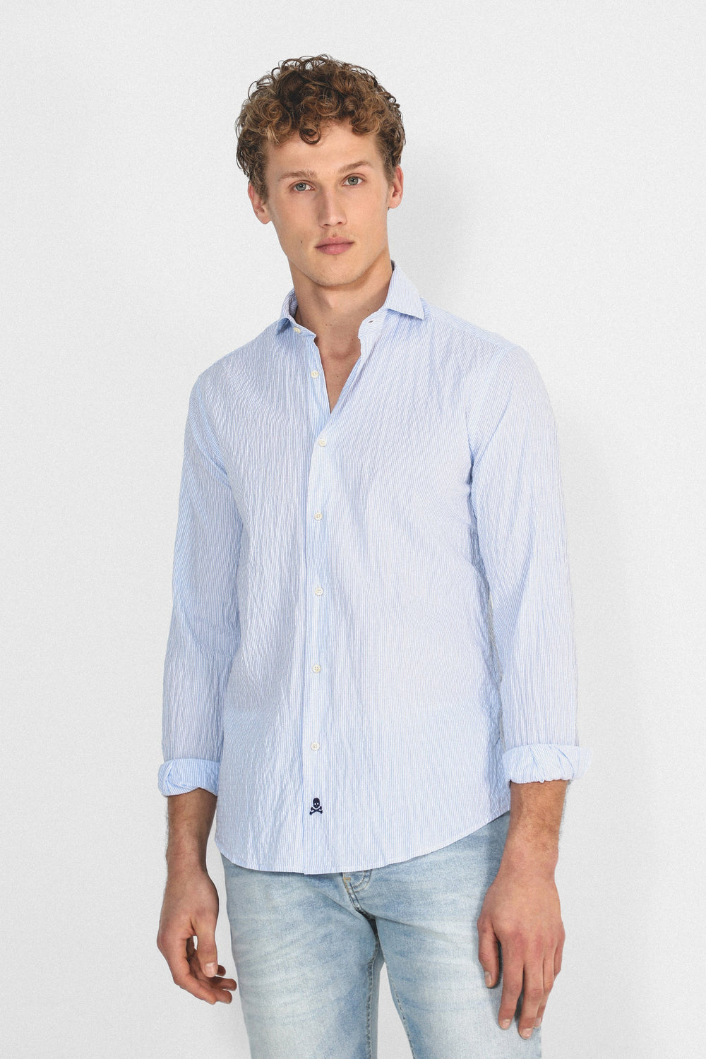 Camisa con estampado de rayas confeccionada en tejido 100% algodón seersucker. Corte Regular Fit, cuello cutaway y cierre con botones. Manga larga terminada en puño con botones y detalle de calavera en el bajo a contraste.