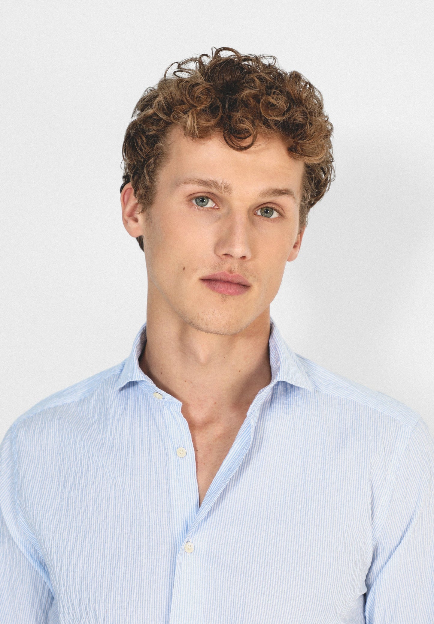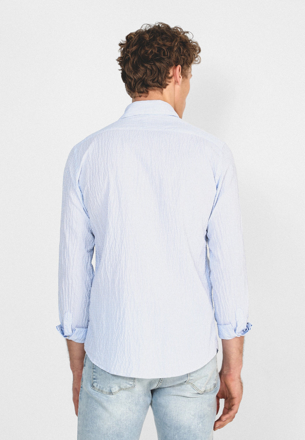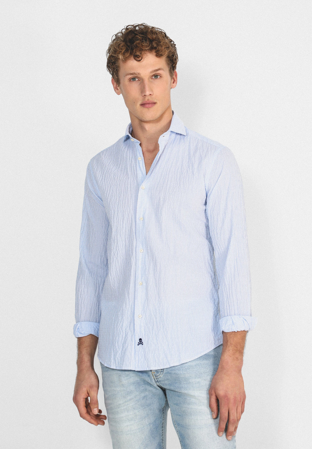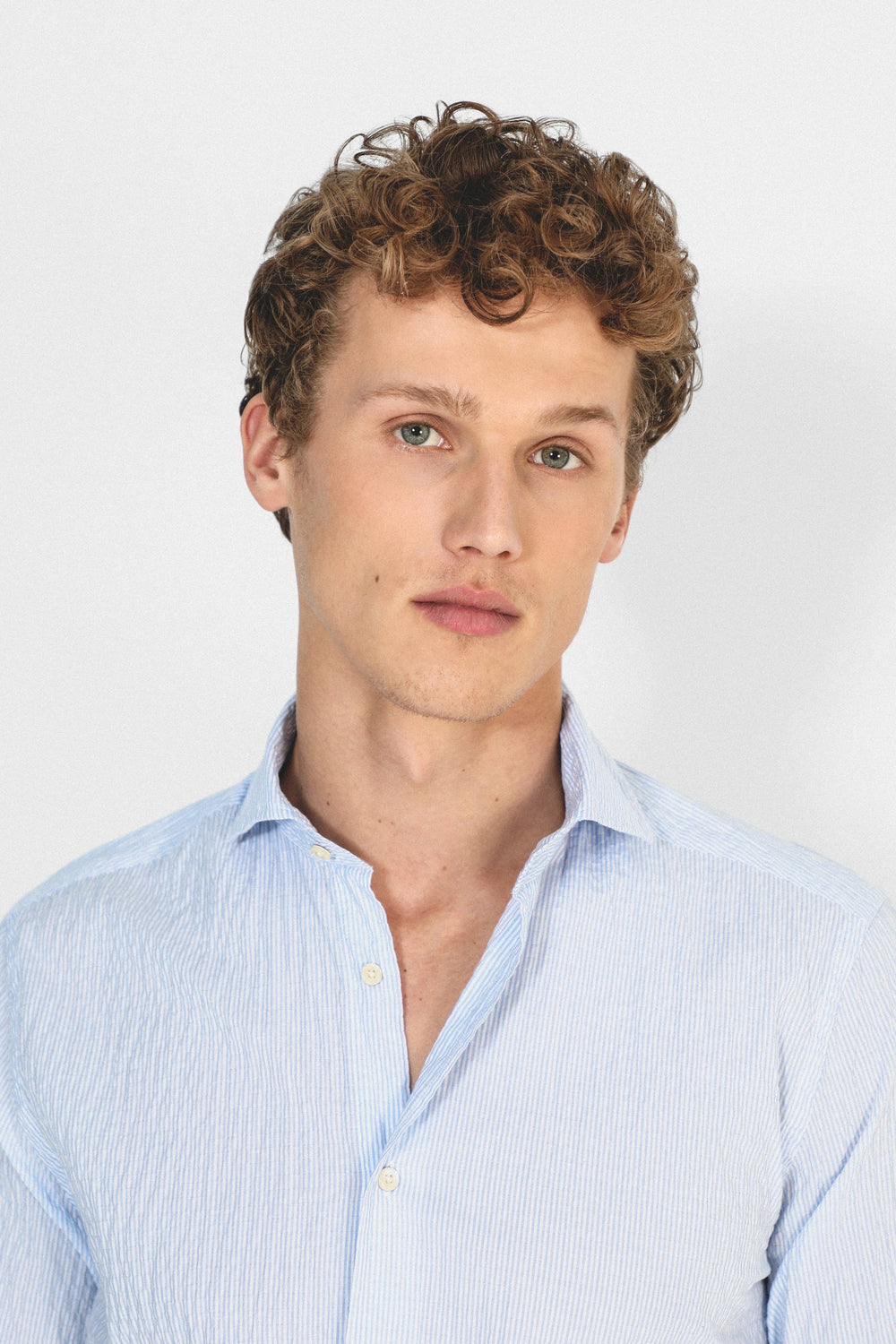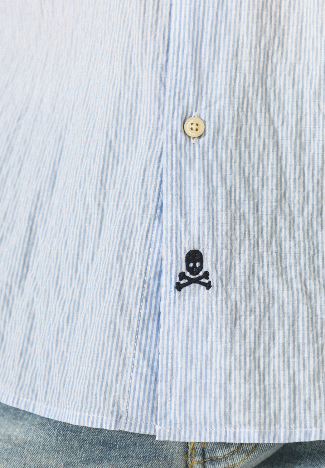Camisa con estampado de rayas confeccionada en tejido 100% algodón seersucker. Corte Regular Fit, cuello cutaway y cierre con botones. Manga larga terminada en puño con botones y detalle de calavera en el bajo a contraste.