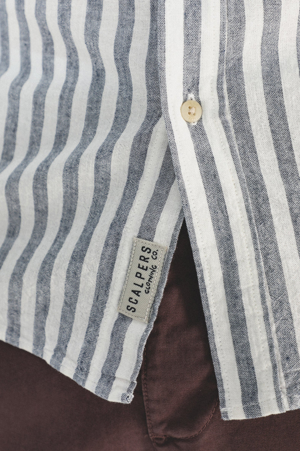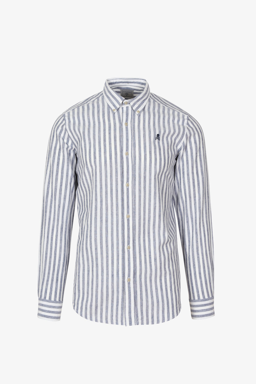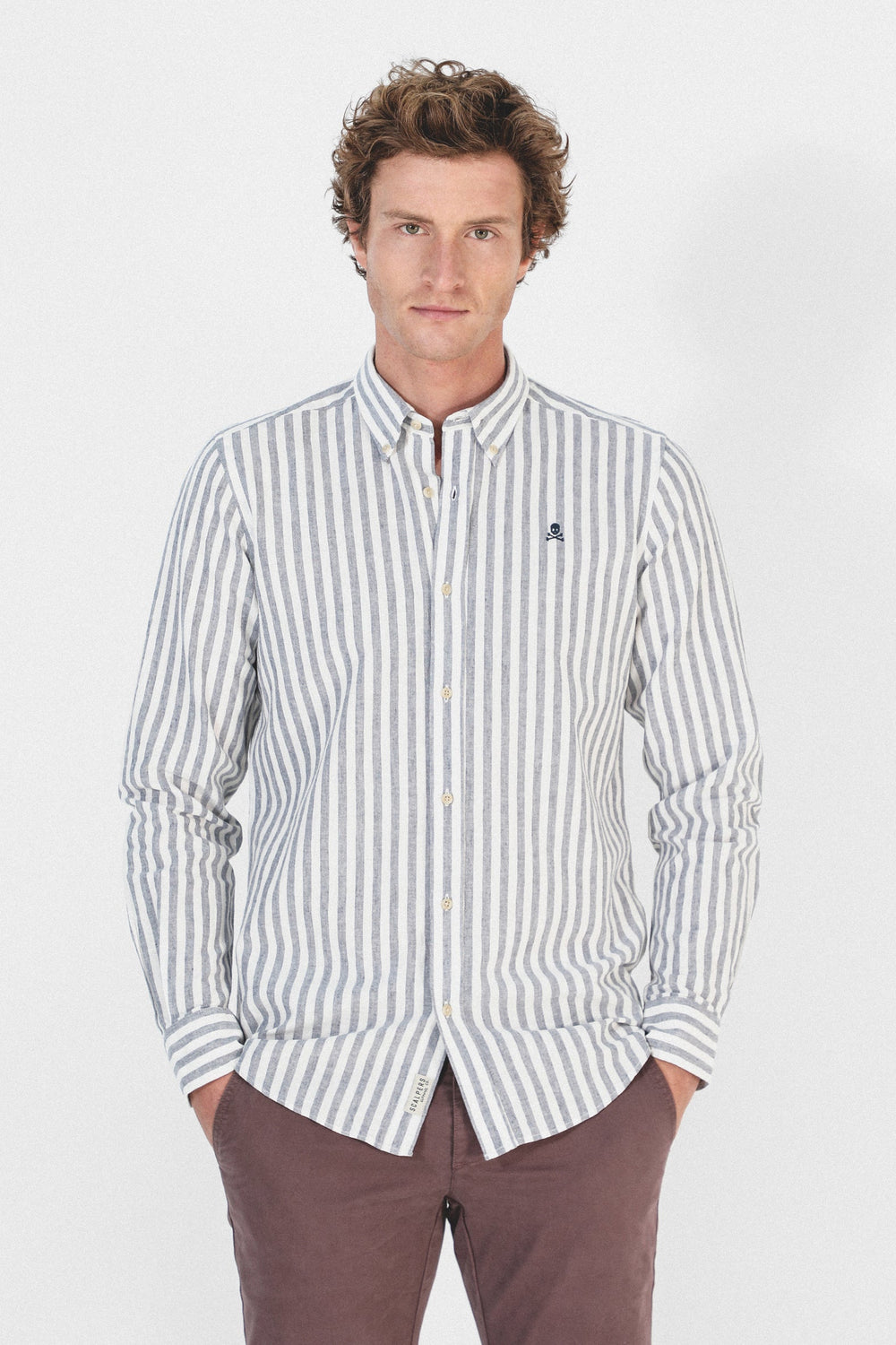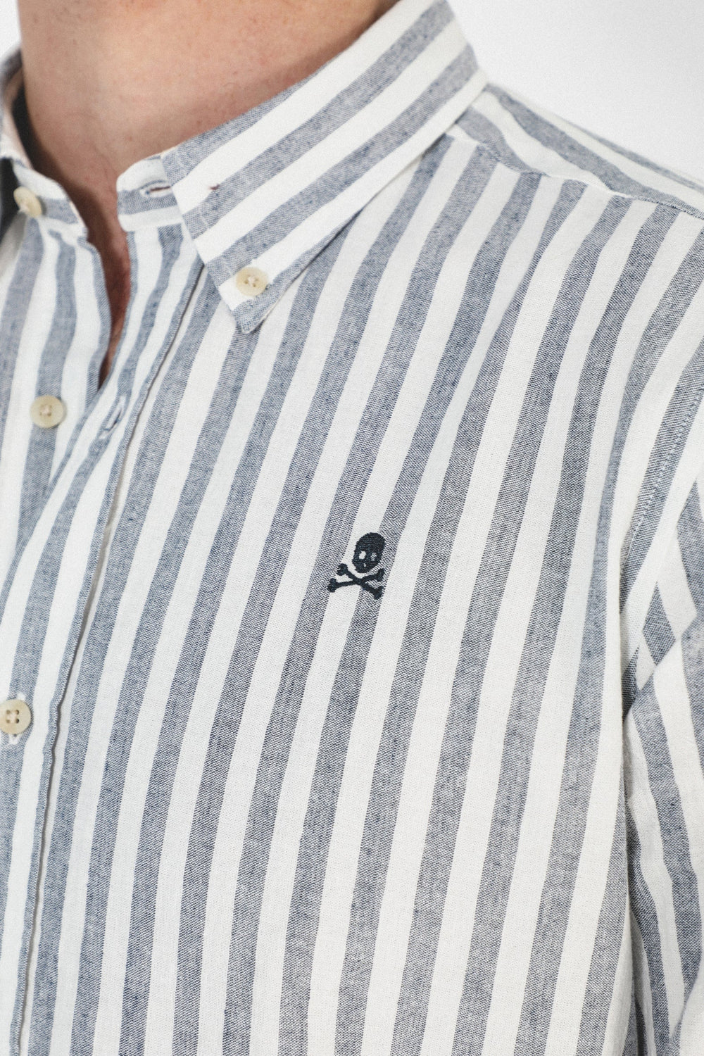 Camisa de rayas confeccionada en tejido mezcla de algodón y lino. Corte Regular Fit, cuello con botones y cierre con botones. Manga larga terminada en puño con botones y detalle de calavera bordada a contraste.