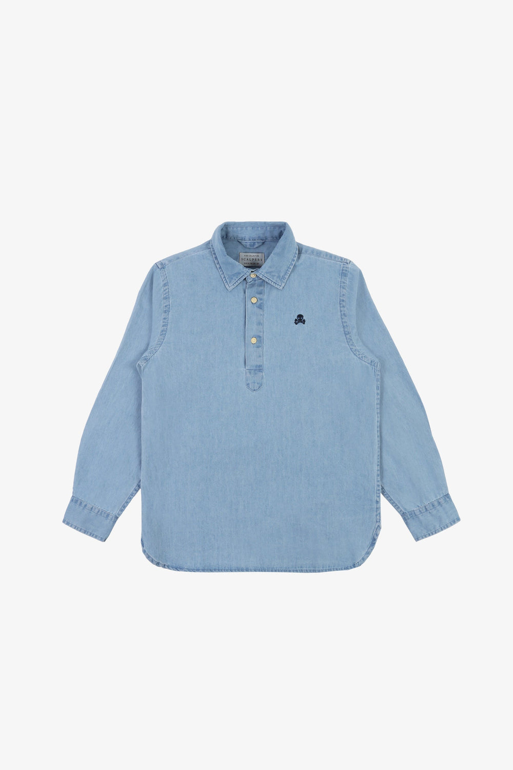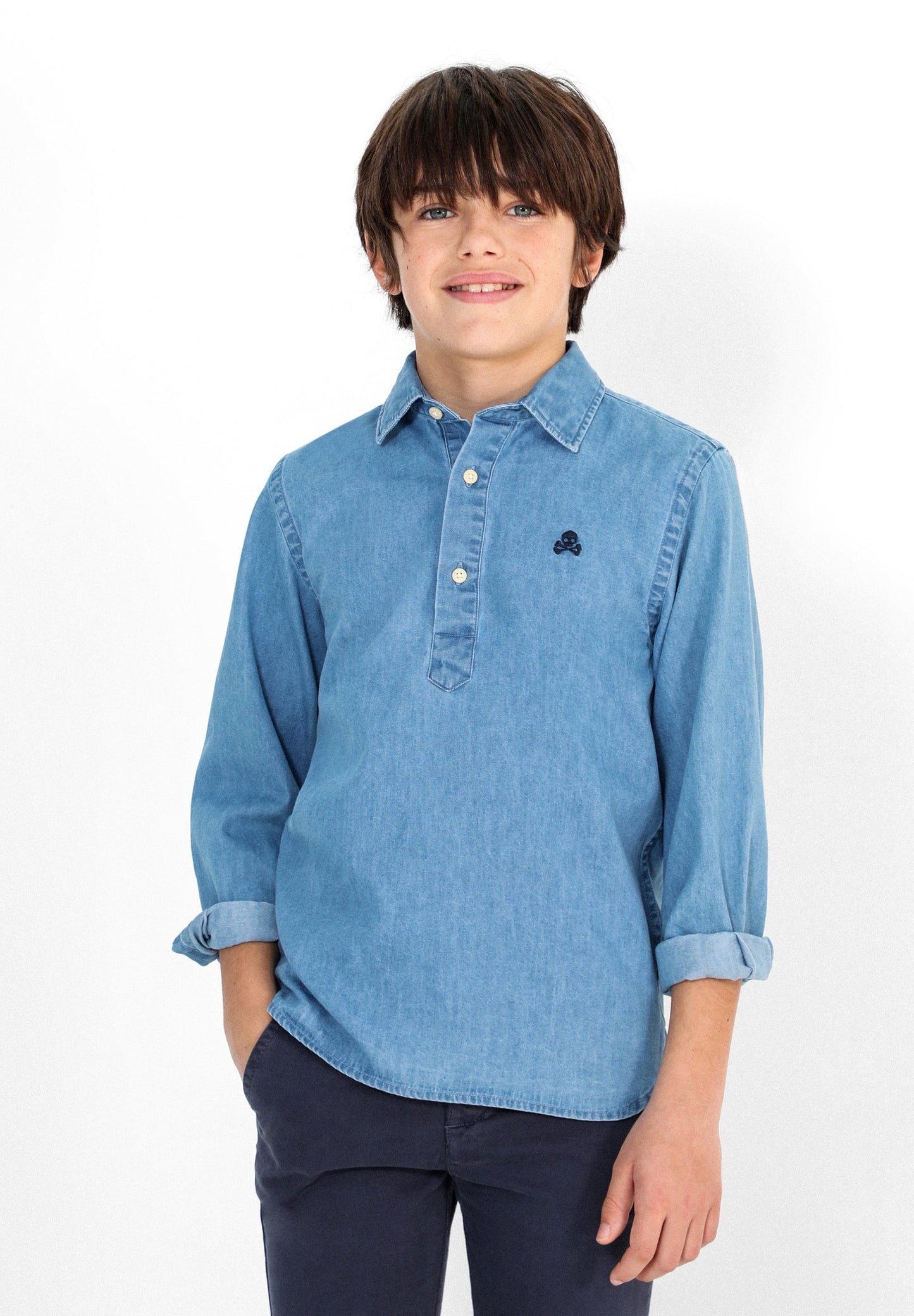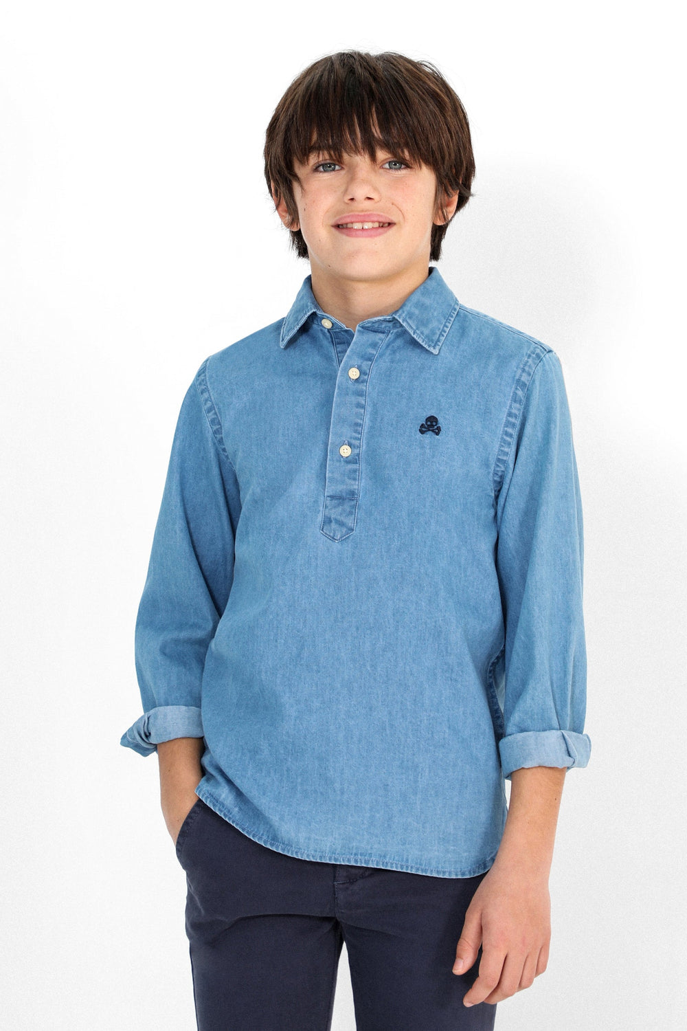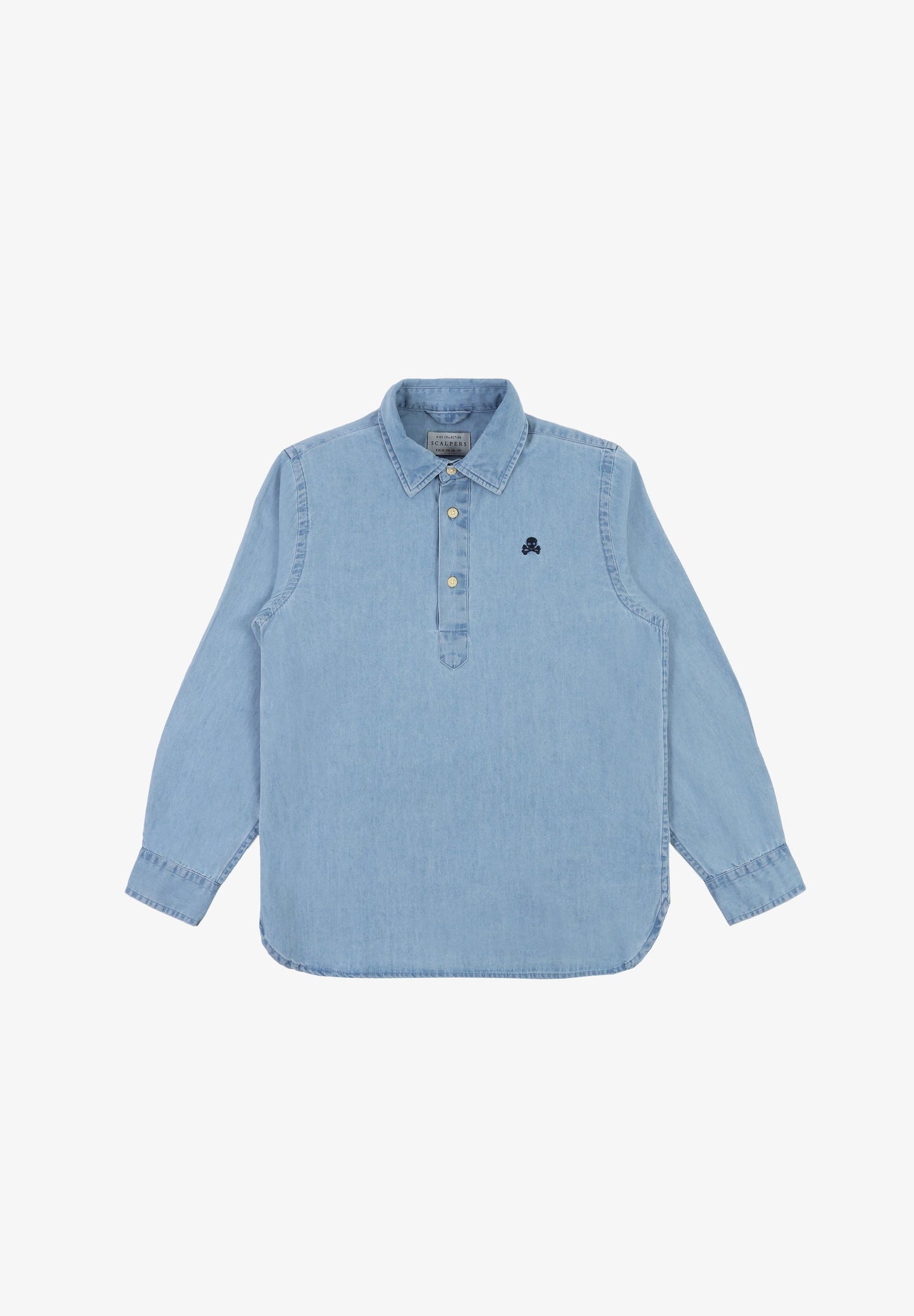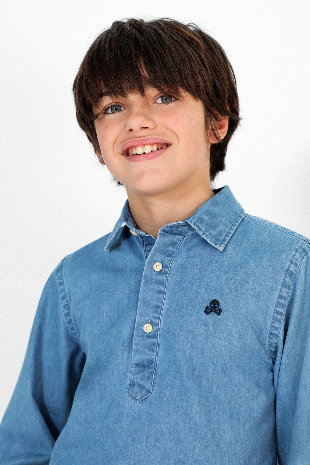 Camisa polera confeccionada en tejido denim. Corte Regular Fit, cuello clásico y cierre con botones. Manga larga terminada en puño con botones y detalle de calavera bordada a contraste.