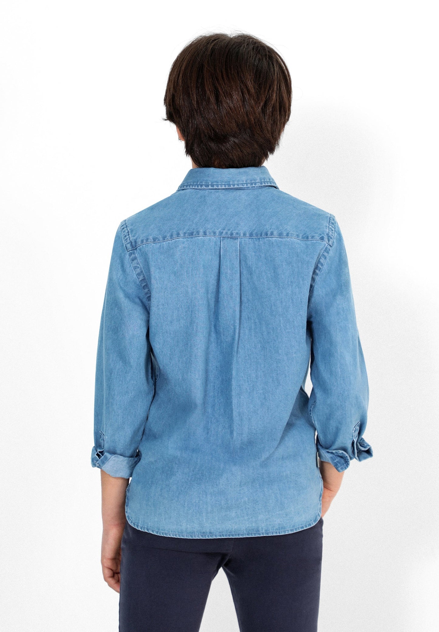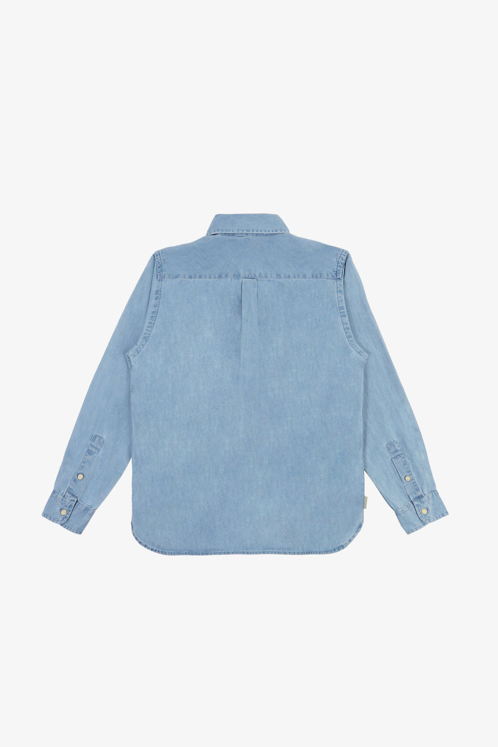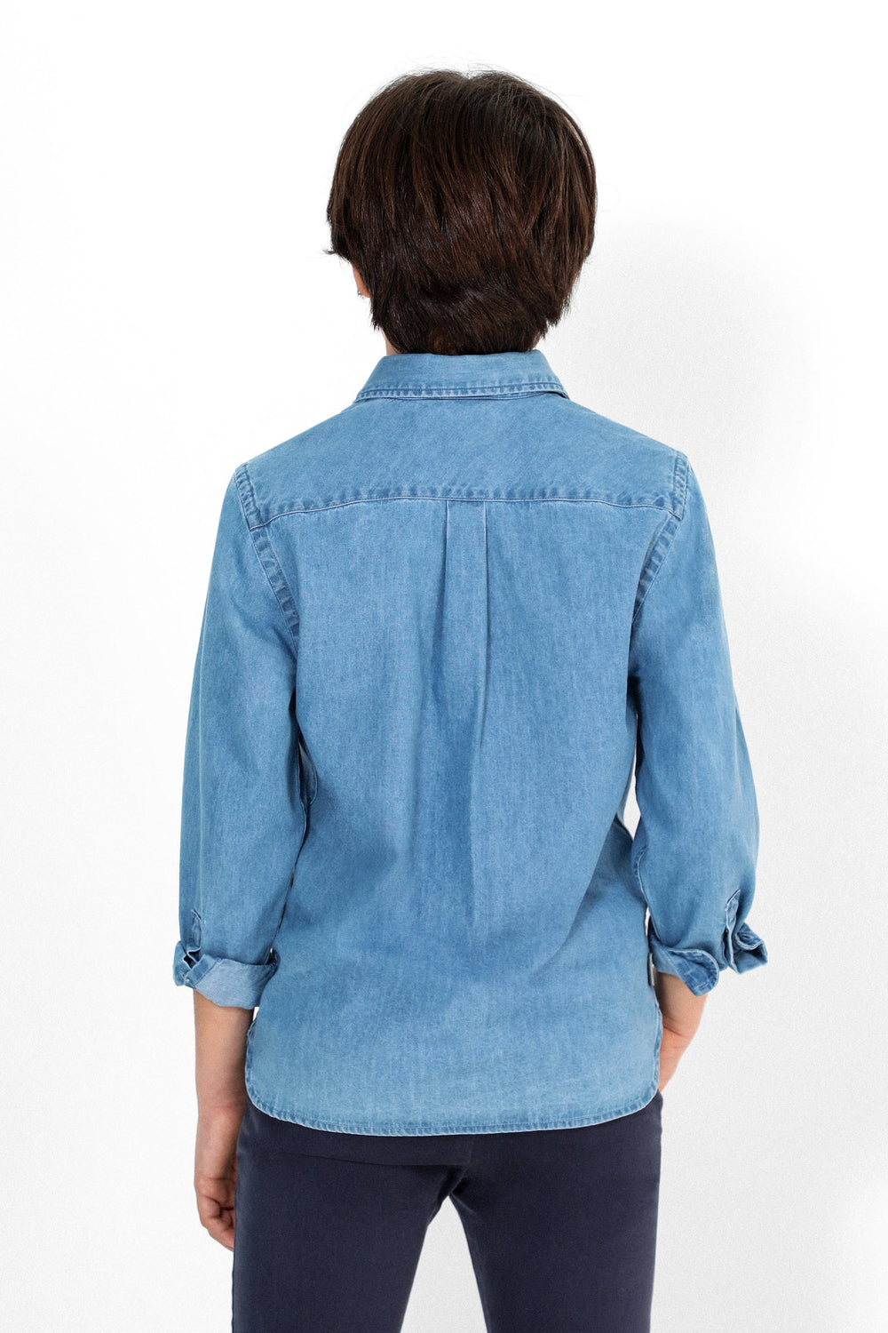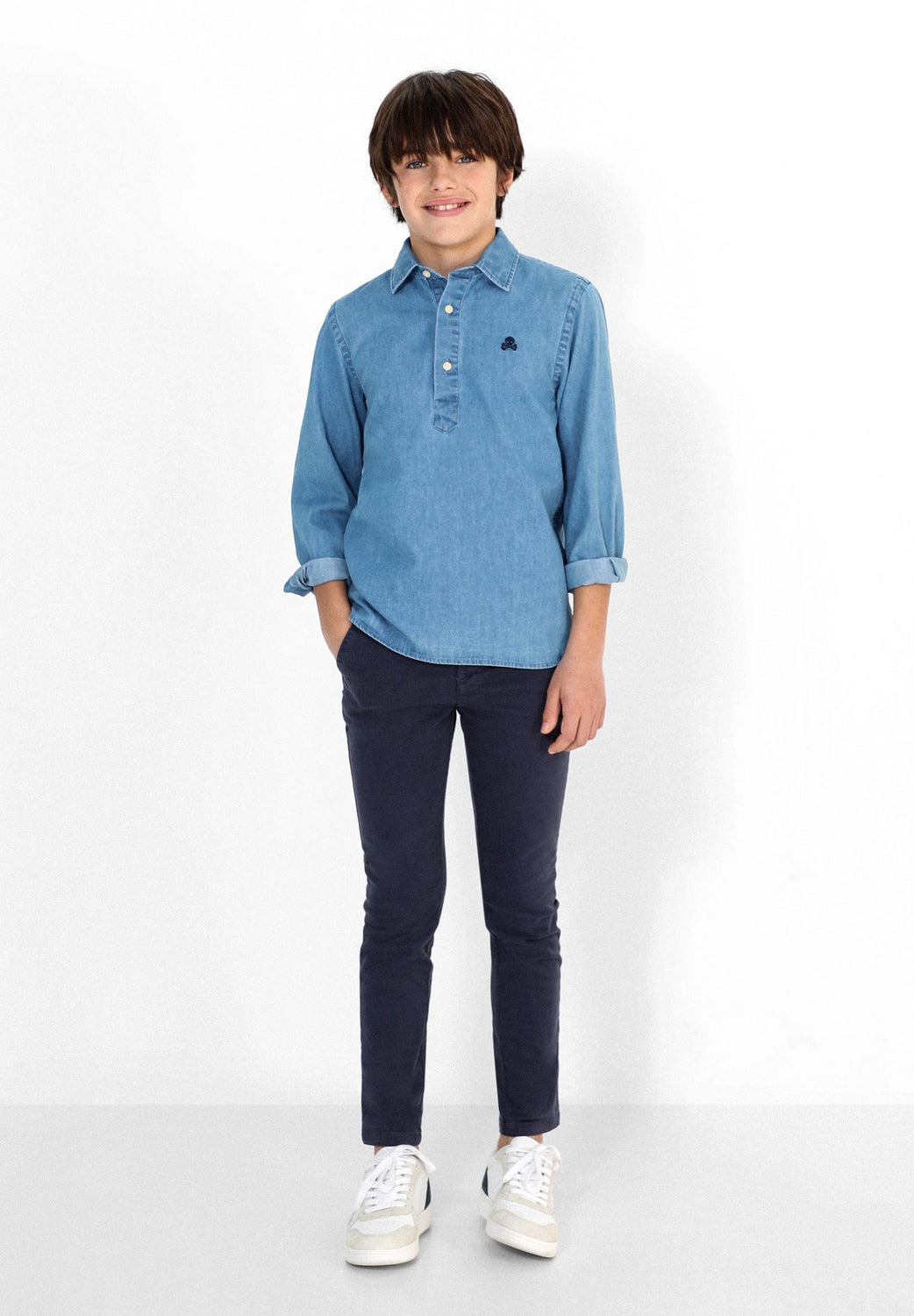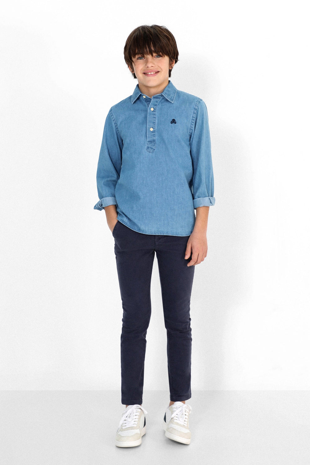 Camisa polera confeccionada en tejido denim. Corte Regular Fit, cuello clásico y cierre con botones. Manga larga terminada en puño con botones y detalle de calavera bordada a contraste.