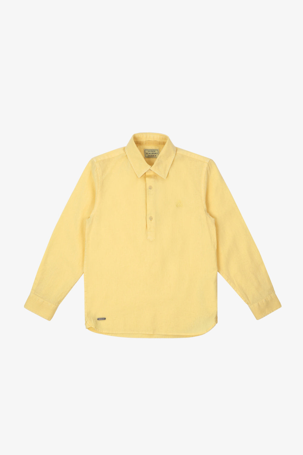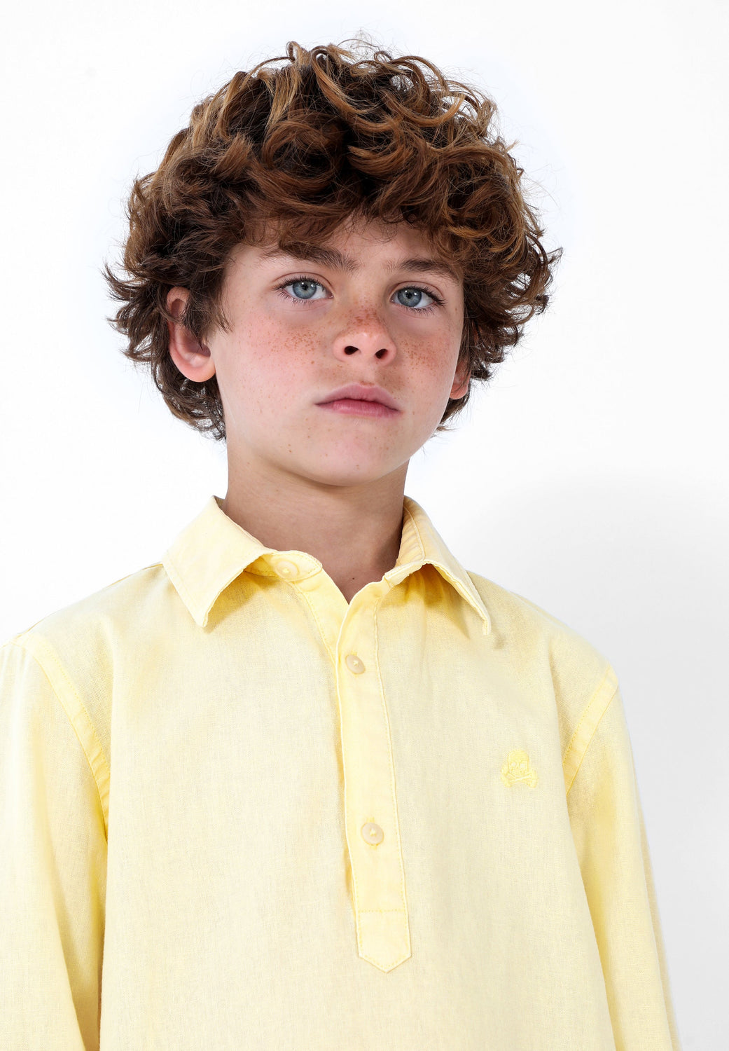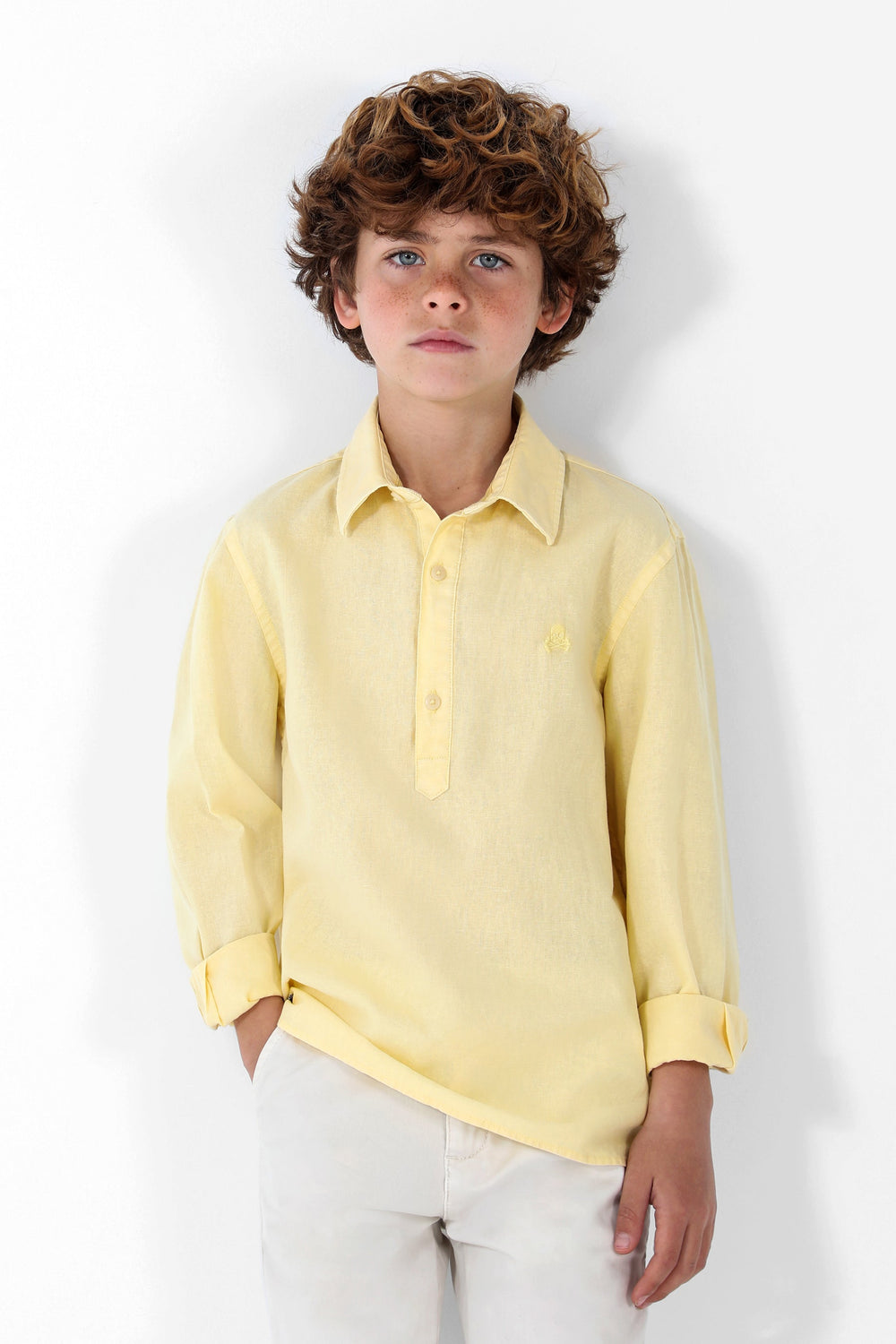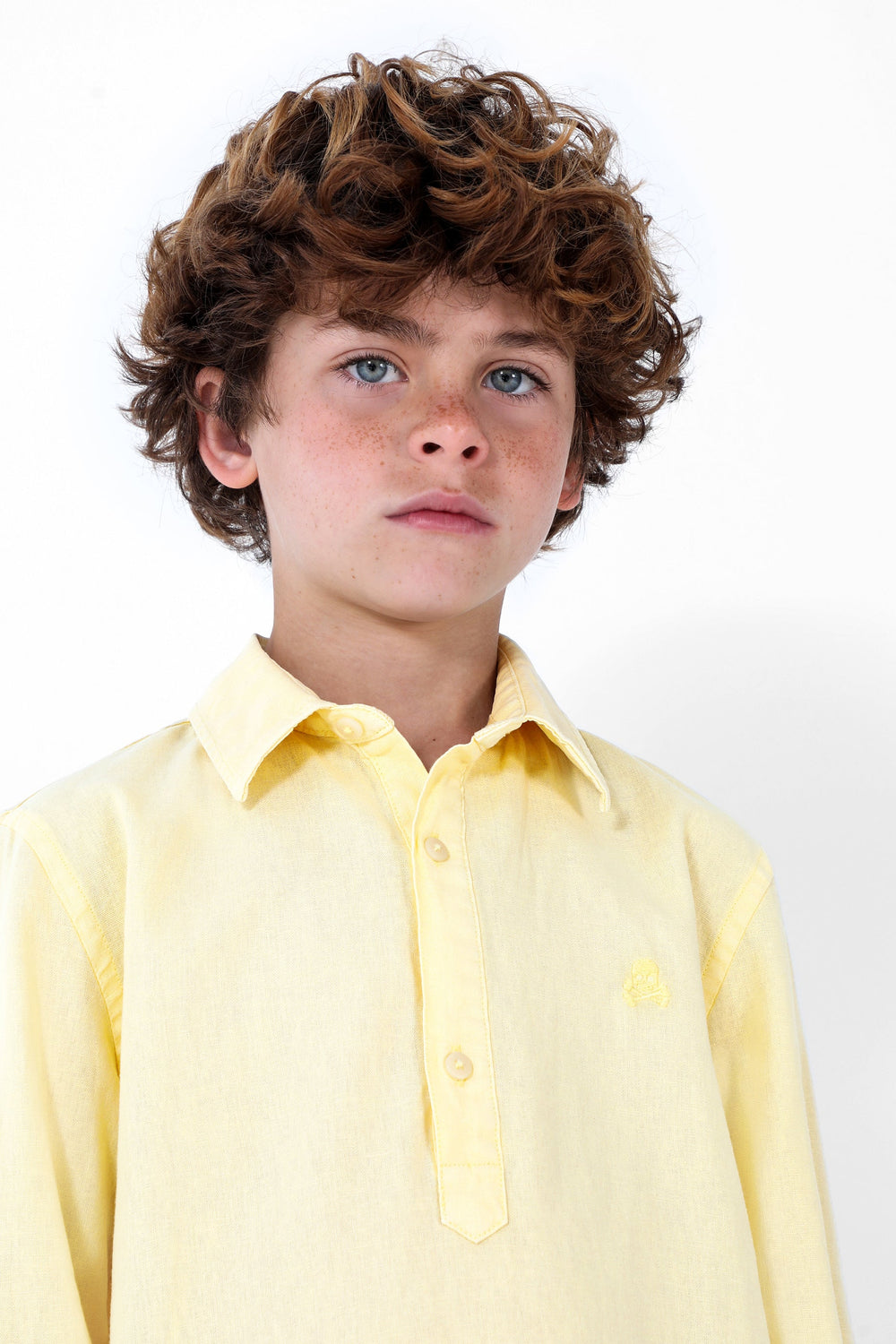 Camisa polera confeccionada en tejido mezcla de algodón orgánico y lino. Corte Regular Fit, cuello clásico y cierre con botones. Manga larga terminada en puño y detalle de calavera bordada a tono.