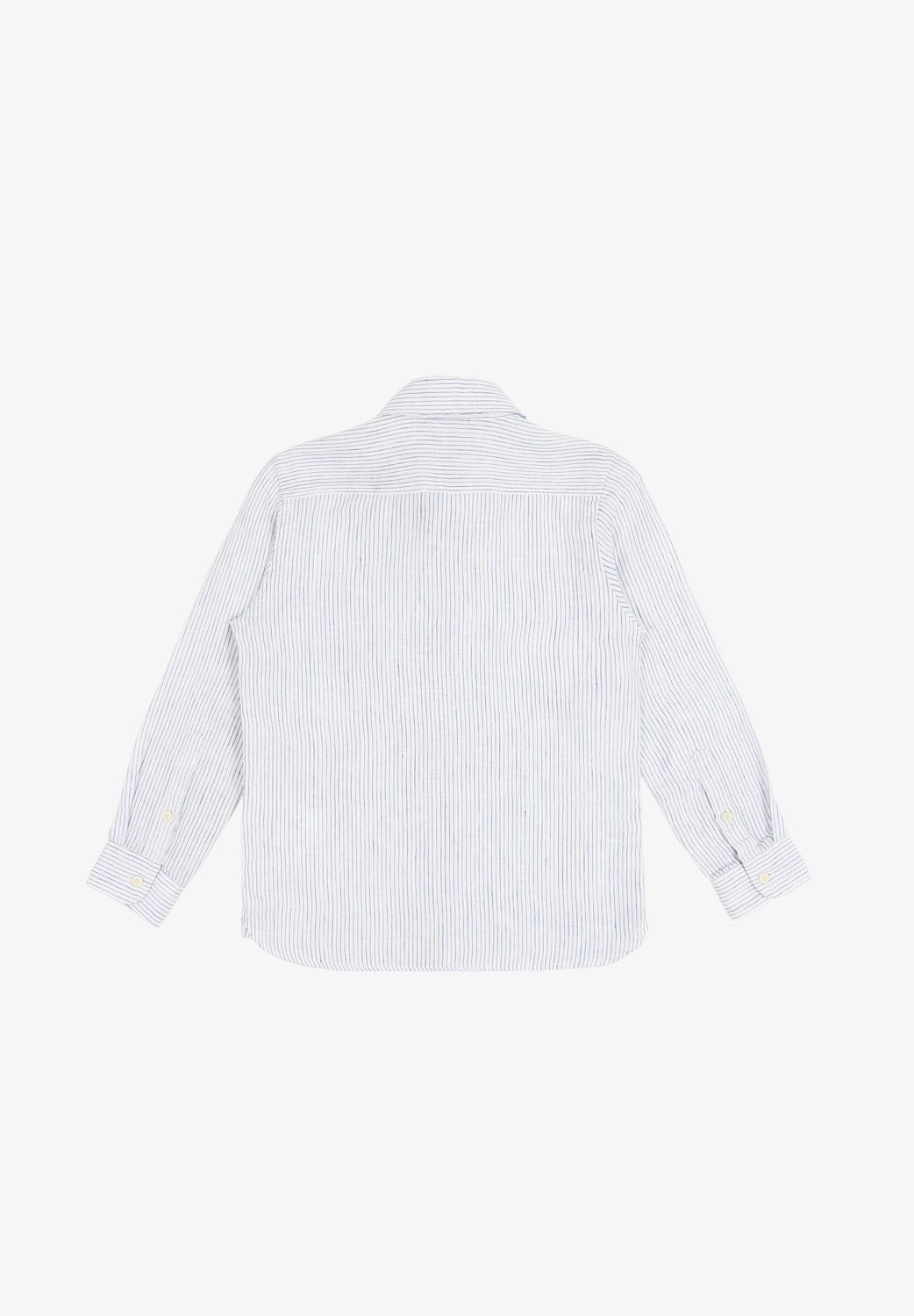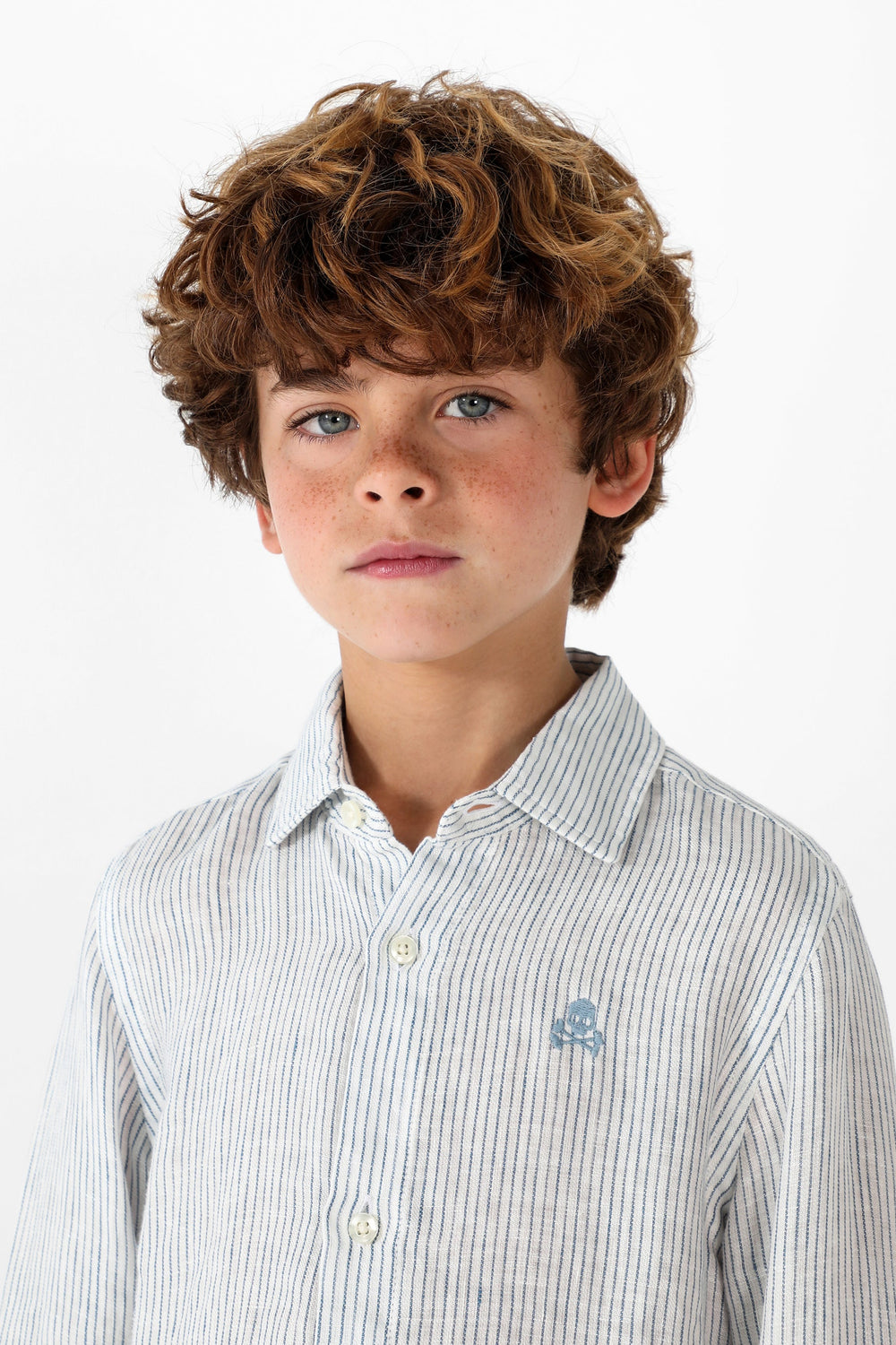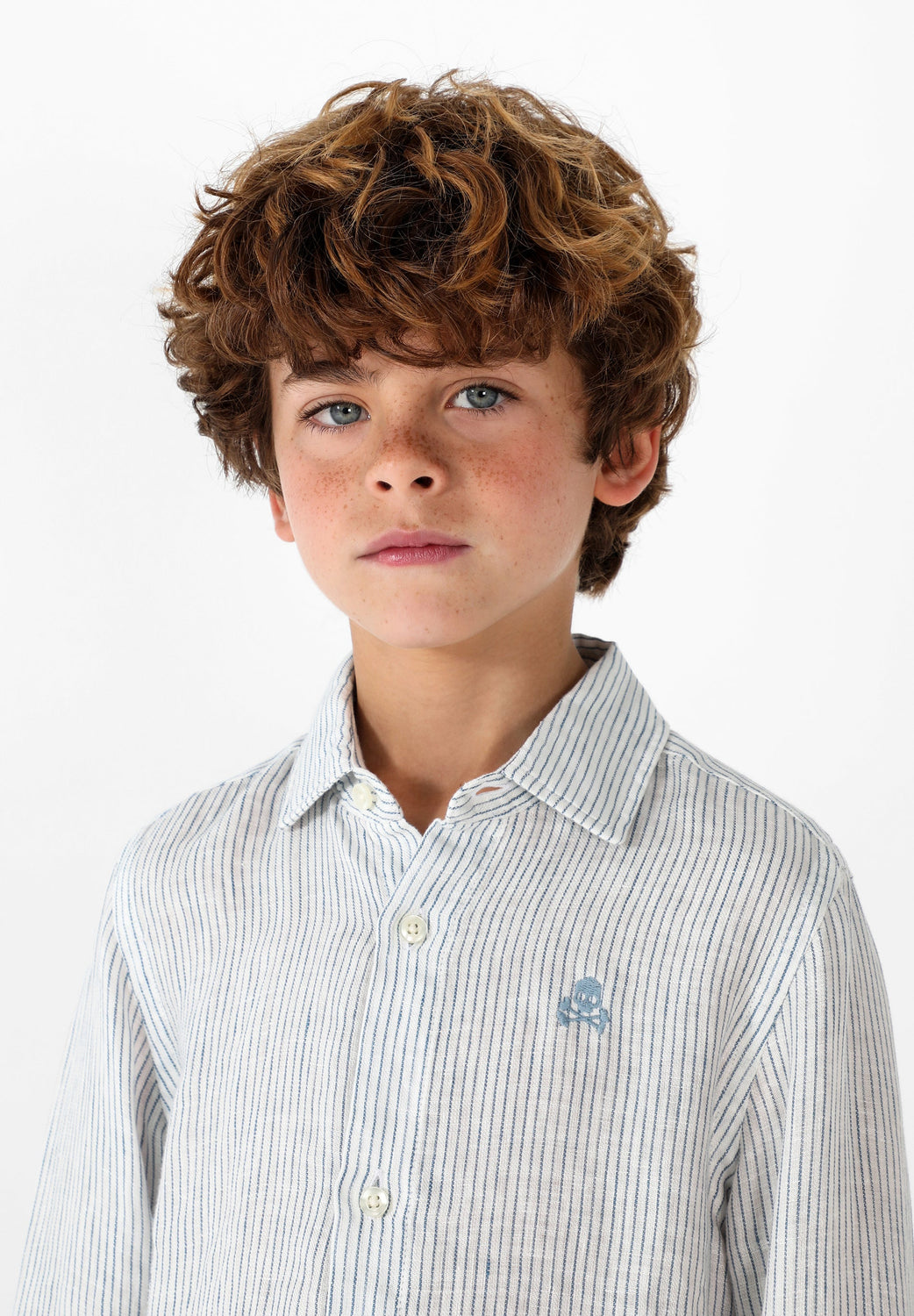 Camisa confeccionada en tejido 100% lino. Corte Regular Fit, cuello cutaway y cierre con botones. Manga larga terminada en puño con botones y detalle de calavera bordada a contraste.