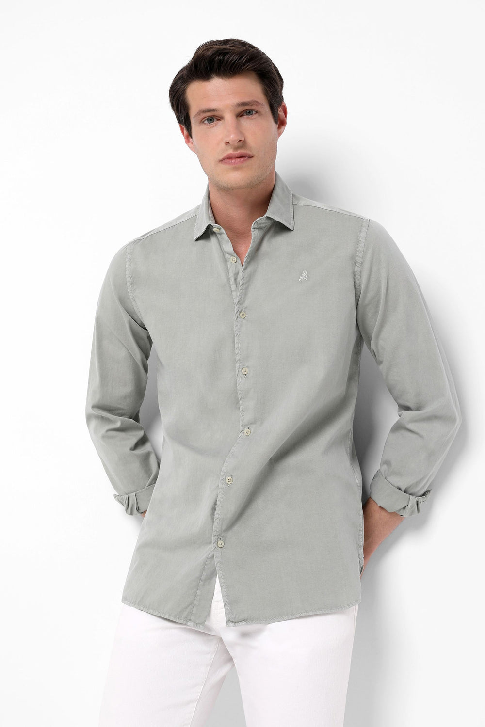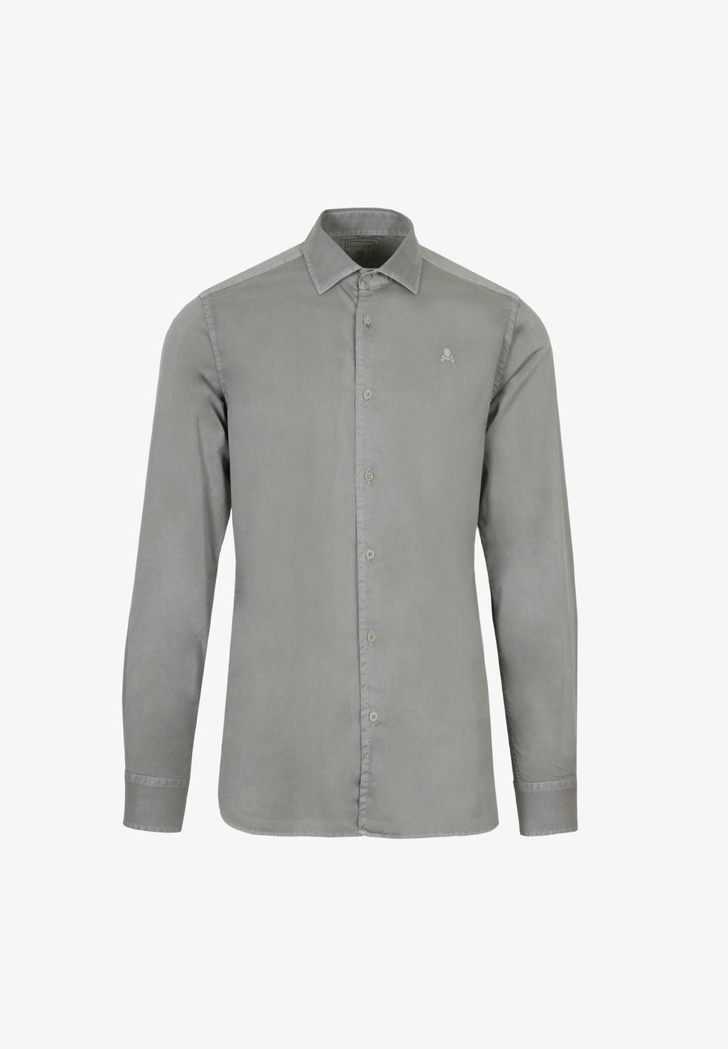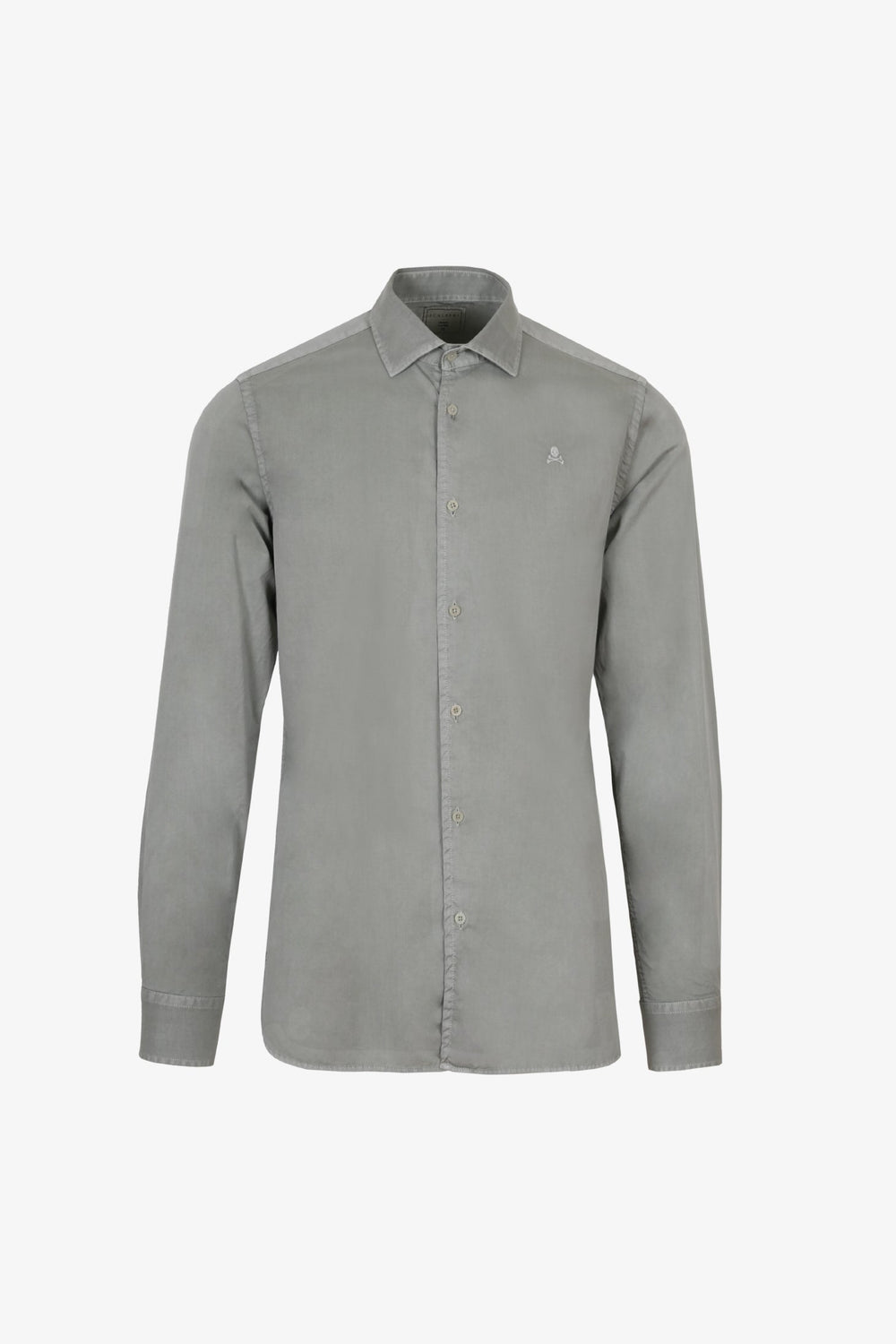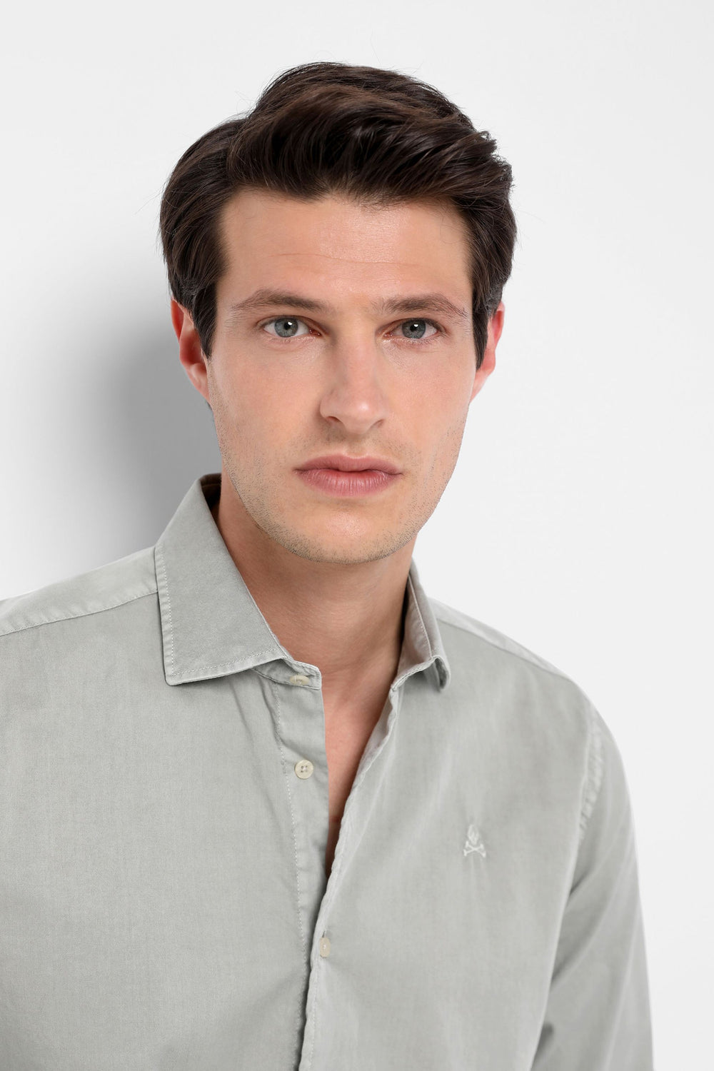 Camisa confeccionada en tejido 100% algodón. Corte Regular Fit, cuello italiano y cierre con botones sin tapeta. Manga larga terminada en puño simple. Detalle de calavera bordada en el pecho.