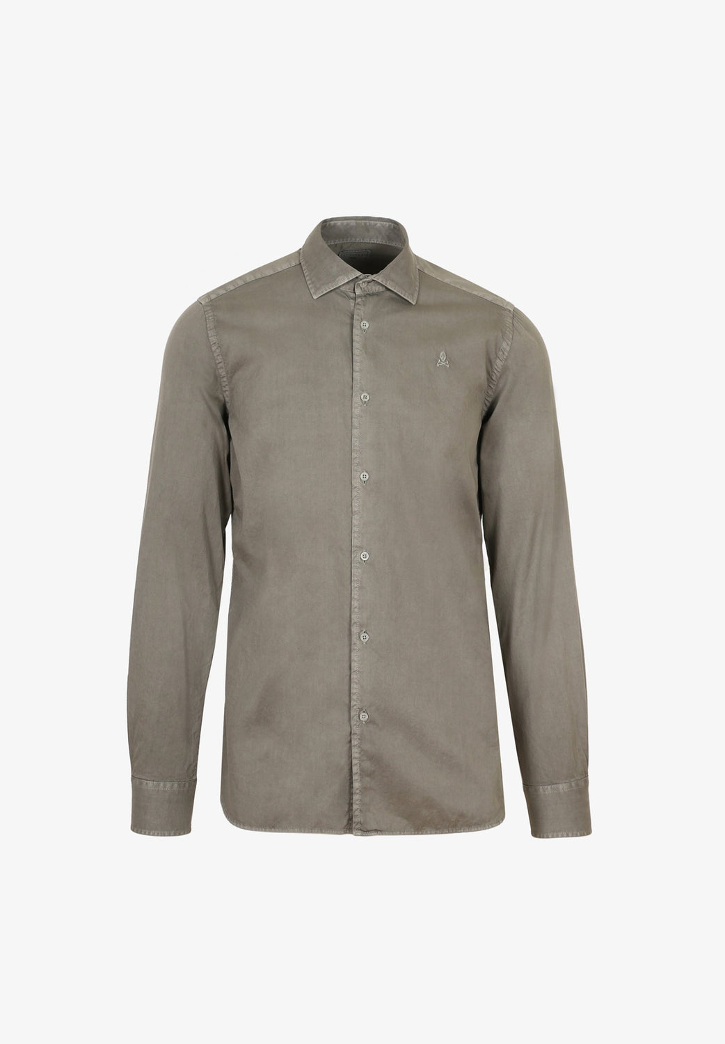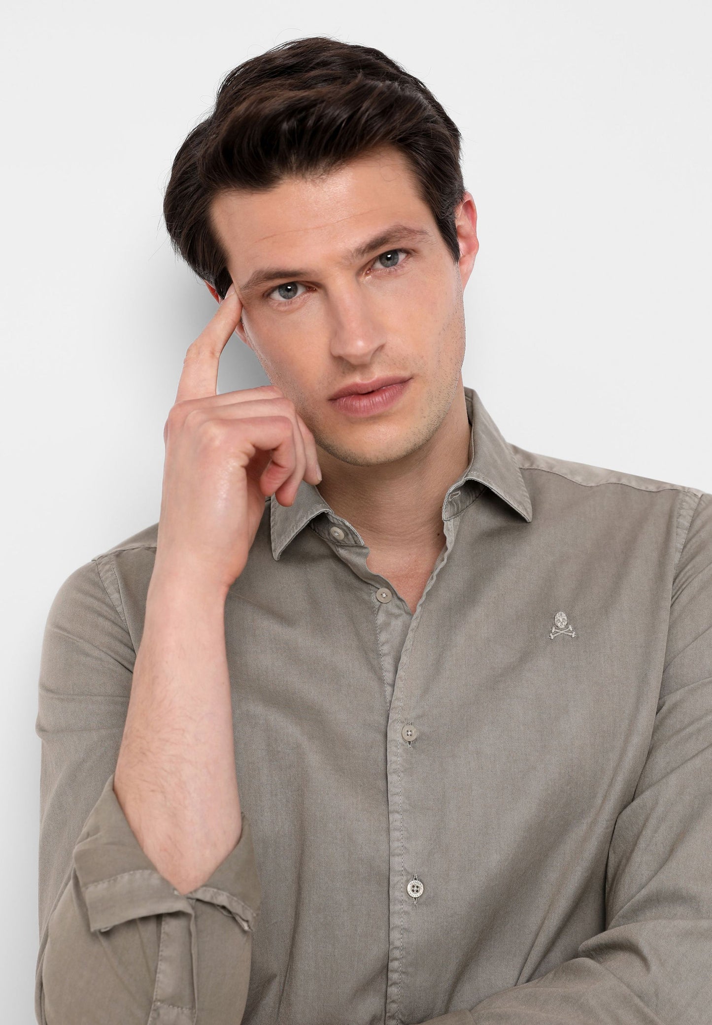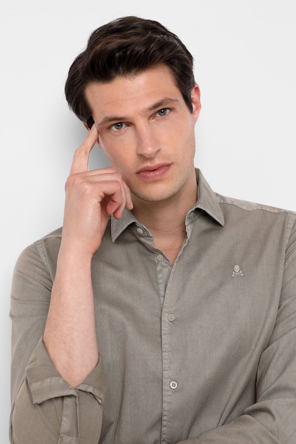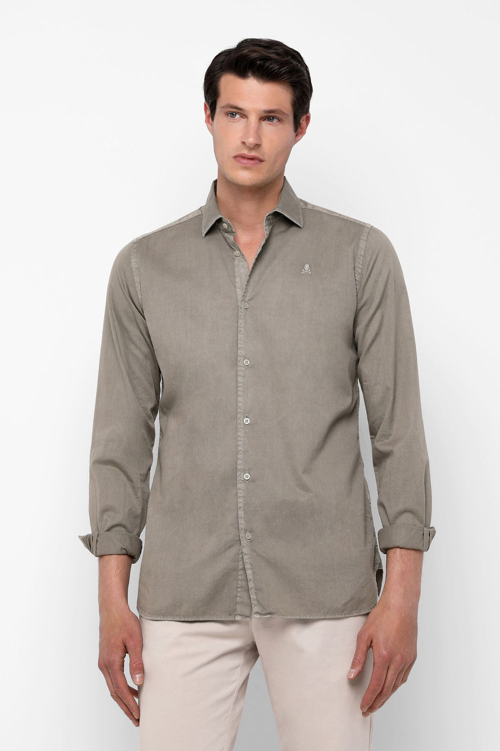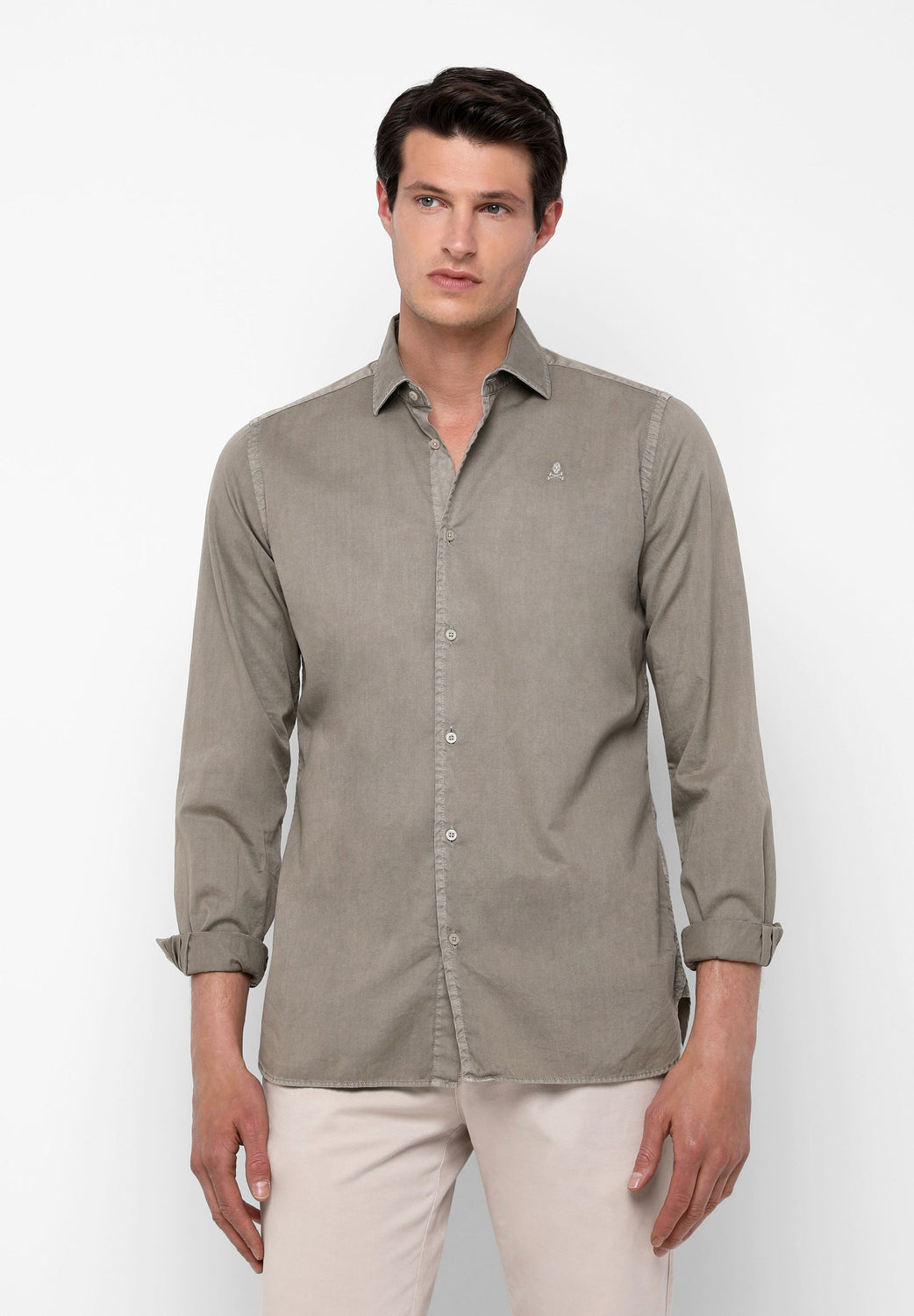 Camisa confeccionada en tejido 100% algodón. Corte Regular Fit, cuello italiano y cierre con botones sin tapeta. Manga larga terminada en puño simple. Detalle de calavera bordada en el pecho.