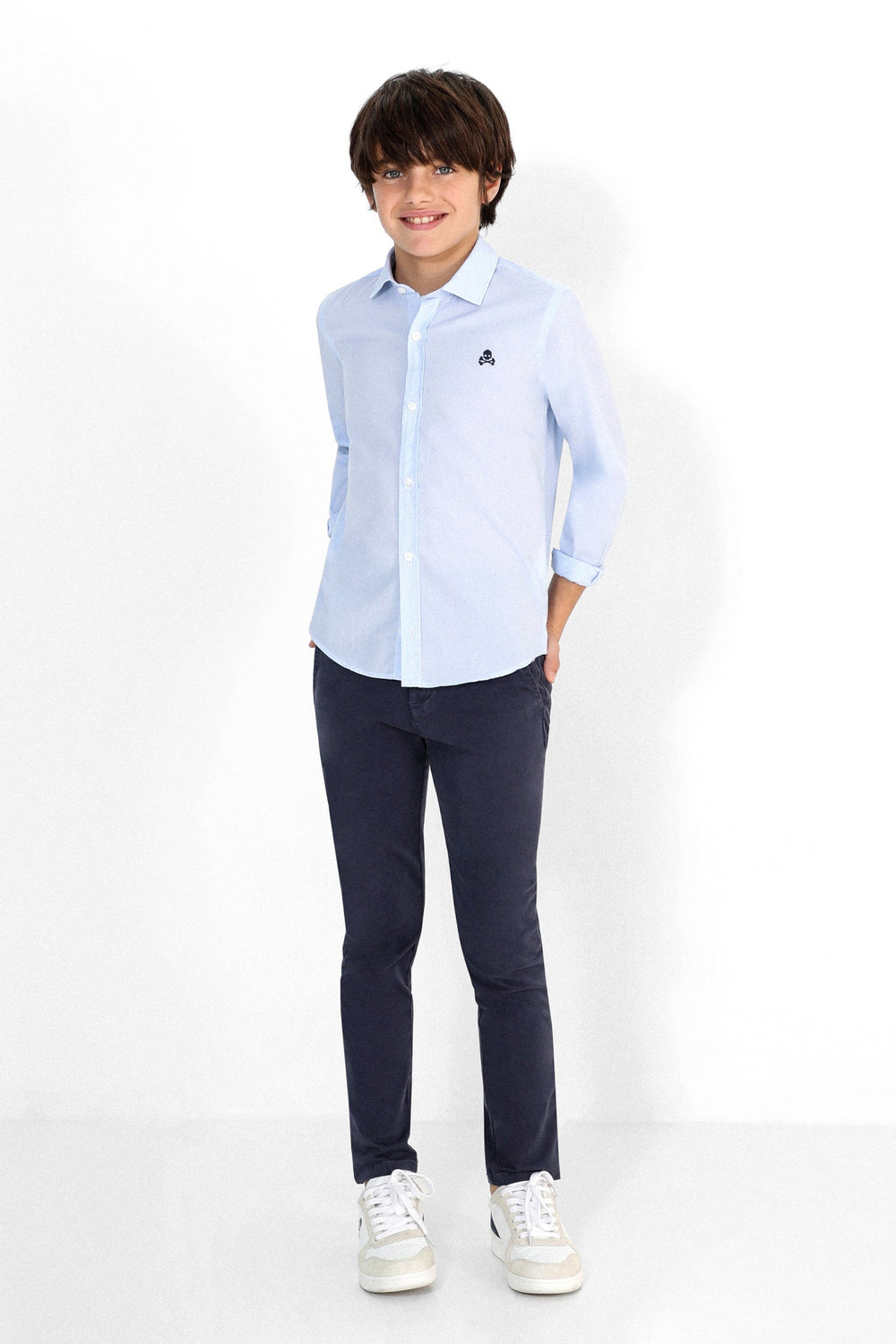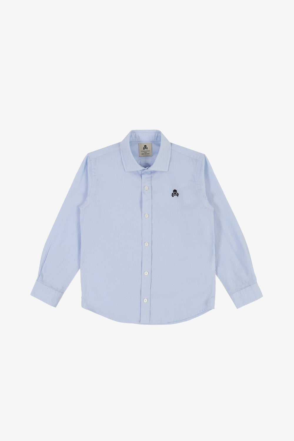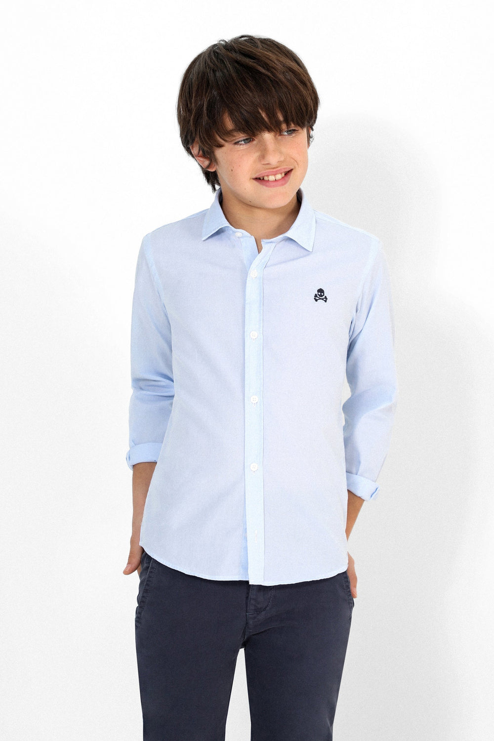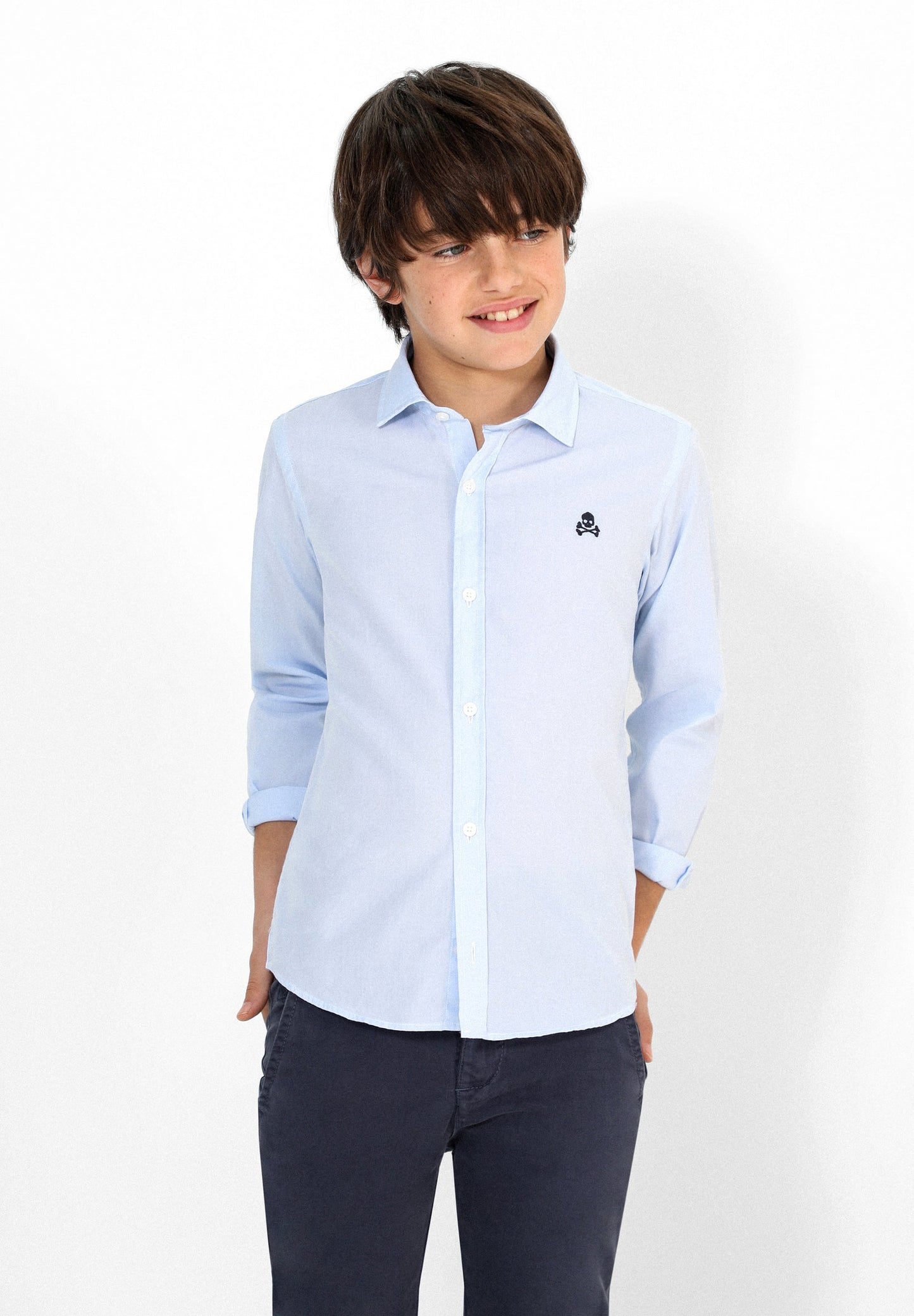 Camisa confeccionada en tejido 100% algodón orgánico. Corte Regular Fit, cuello cutaway y cierre con botones. Manga larga terminada en puño con botones y detalle de calavera a contraste.