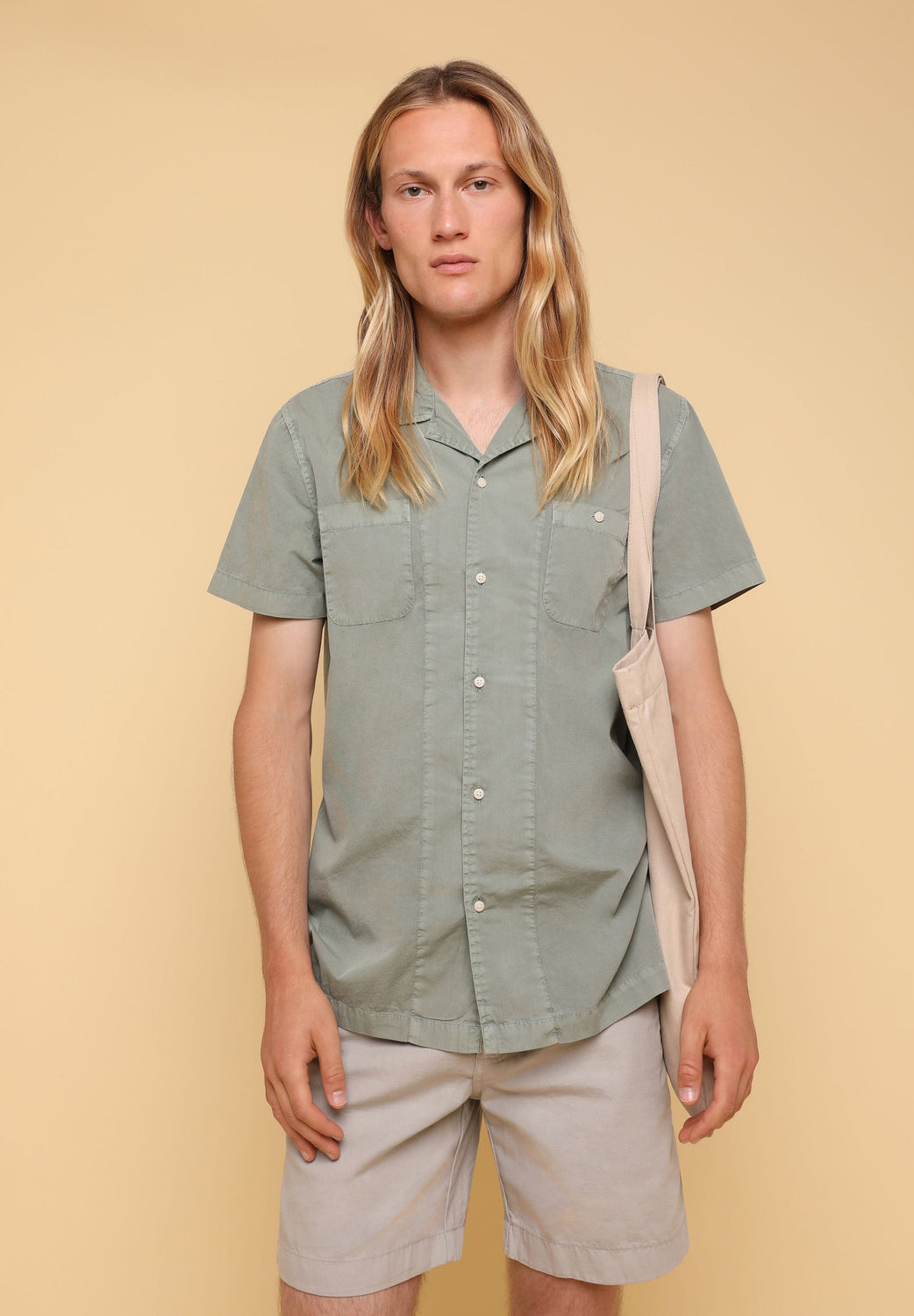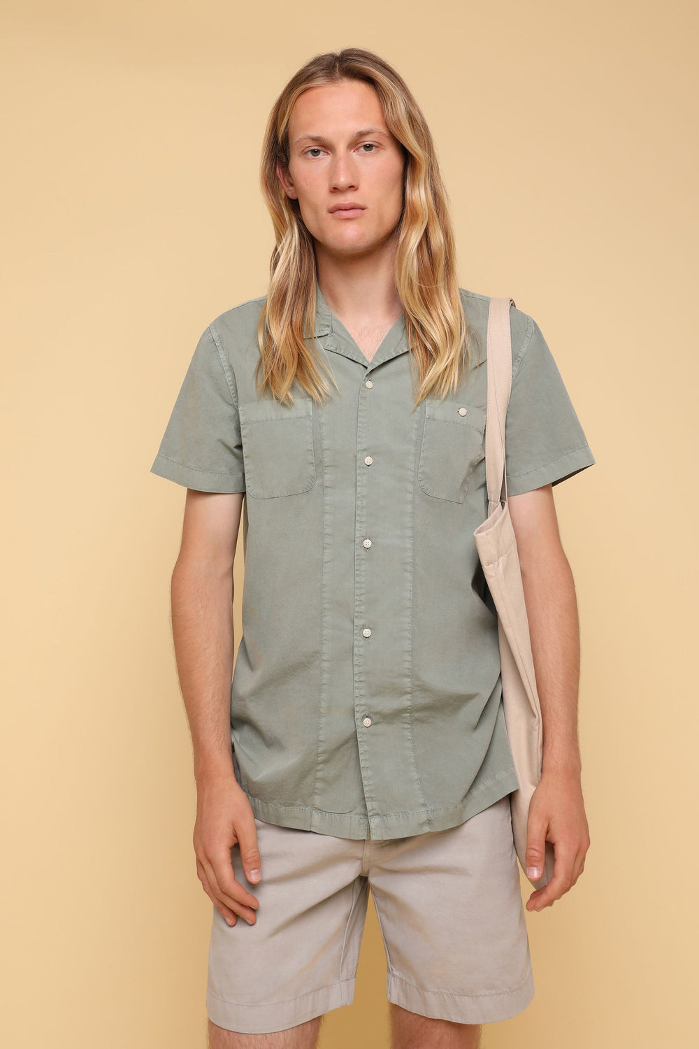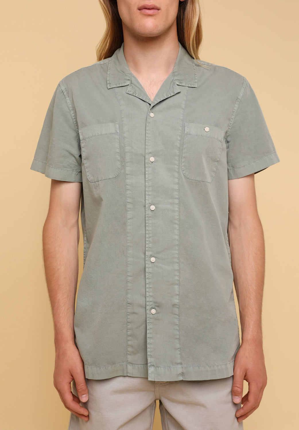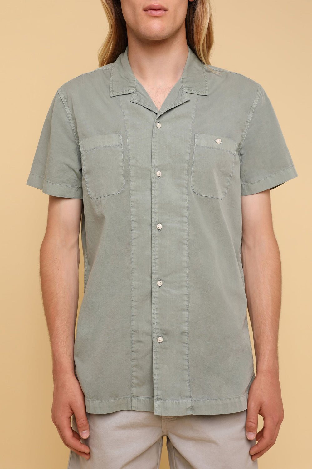 Camisa confeccionada en tejido 100% algodón lavado. Corte Regular Fit, cuello pijamero y cierre con botones. Manga corta y detalle de bolsillos en pecho.