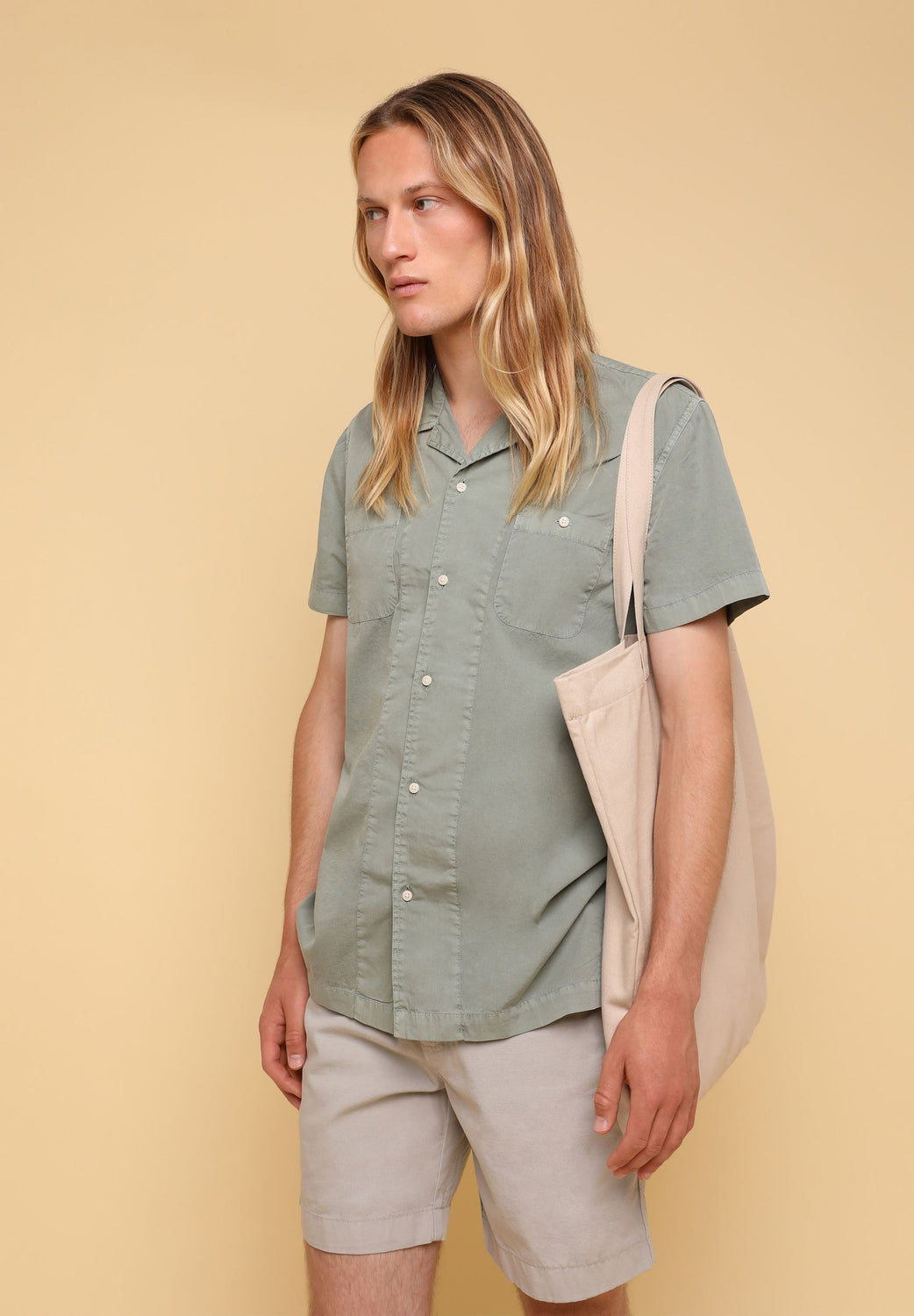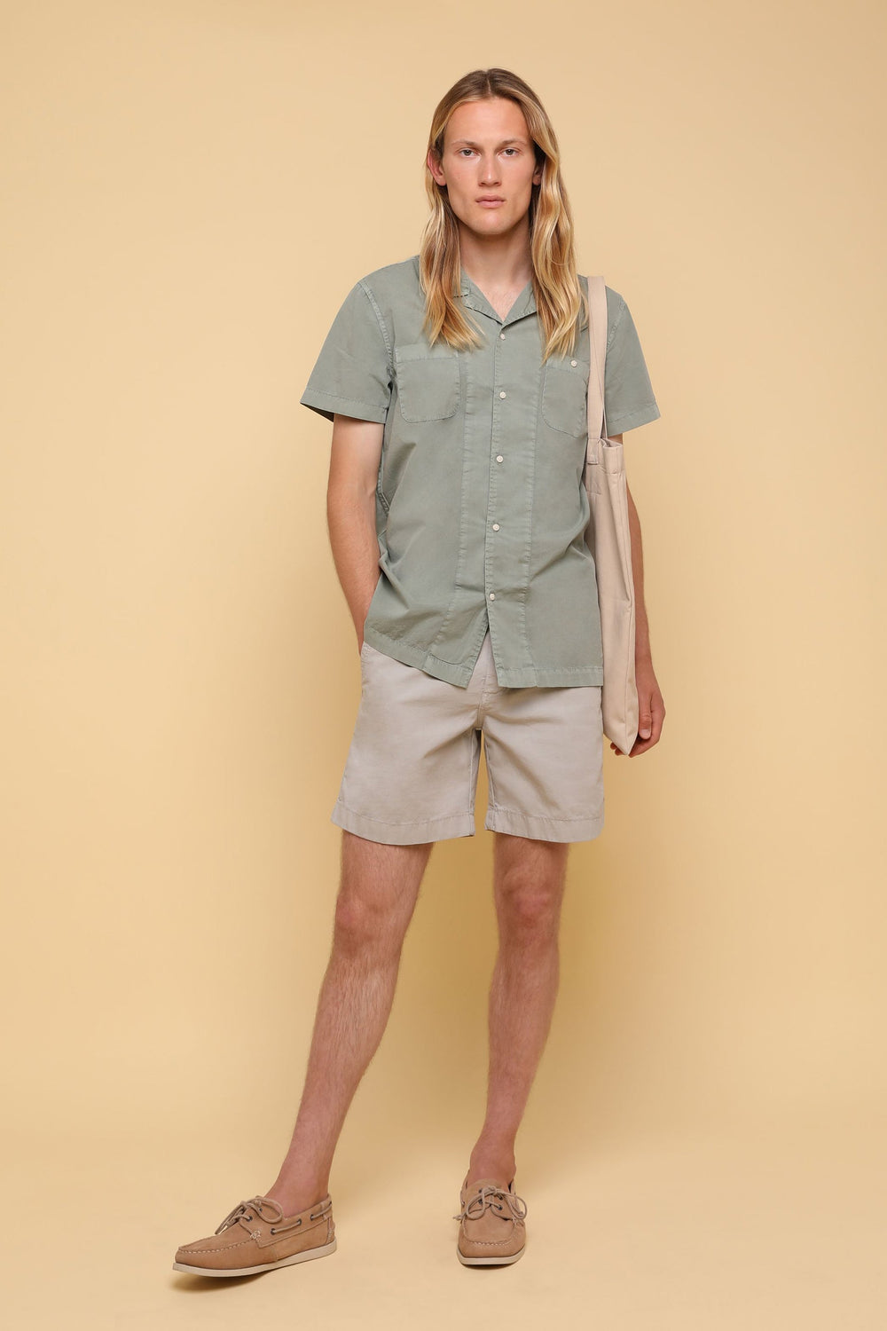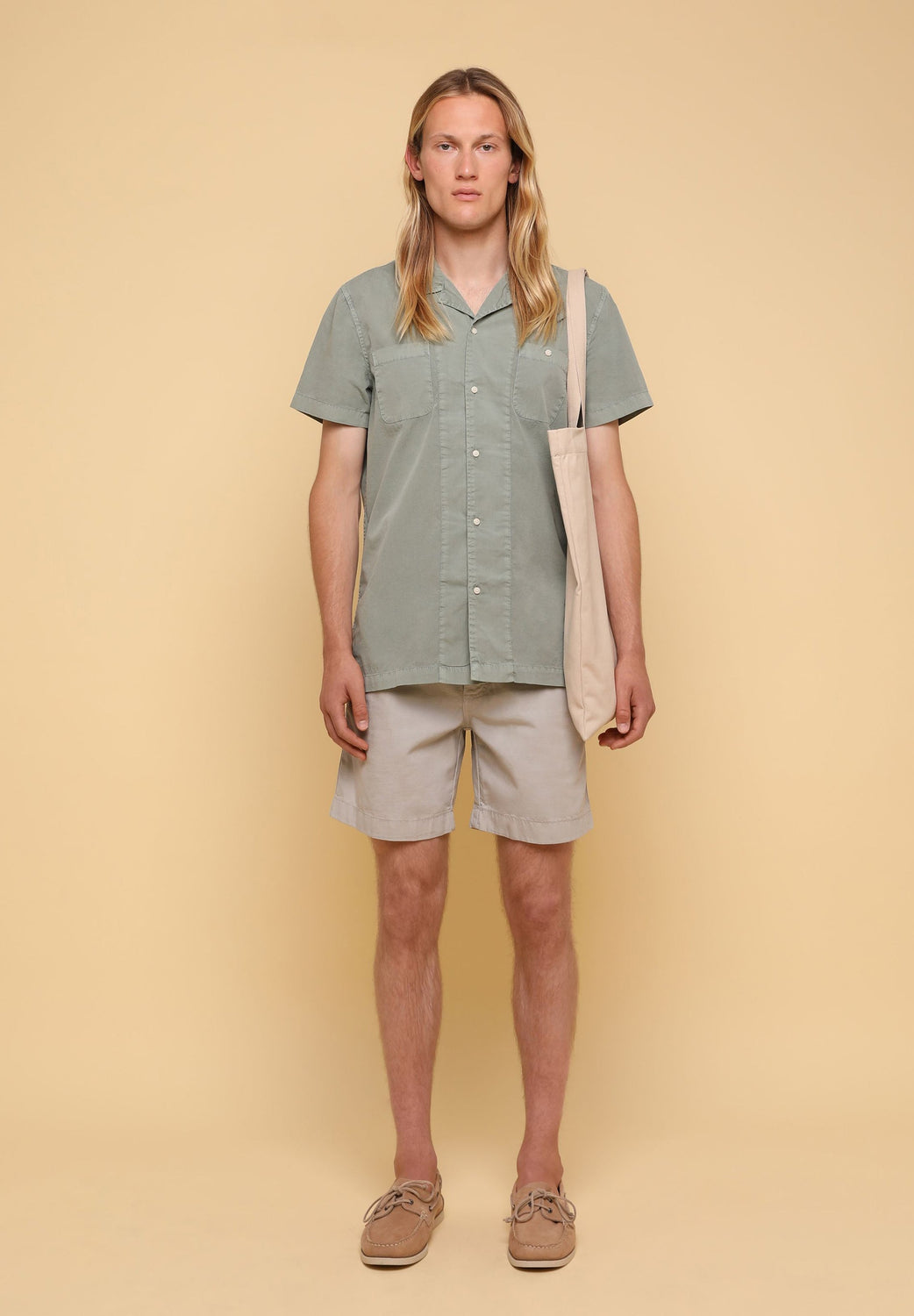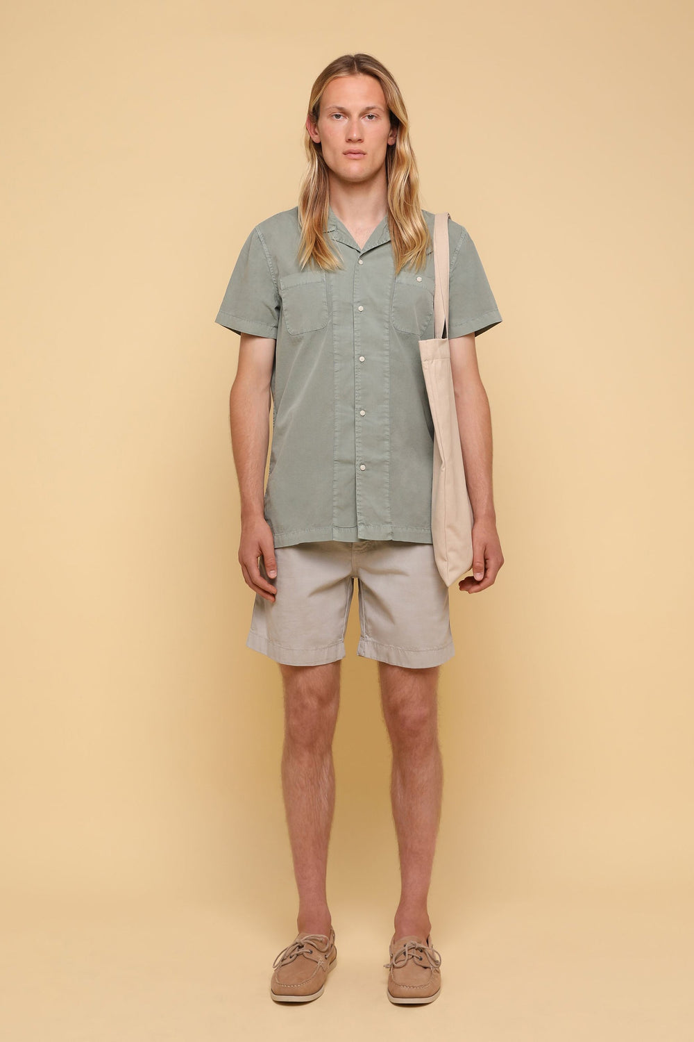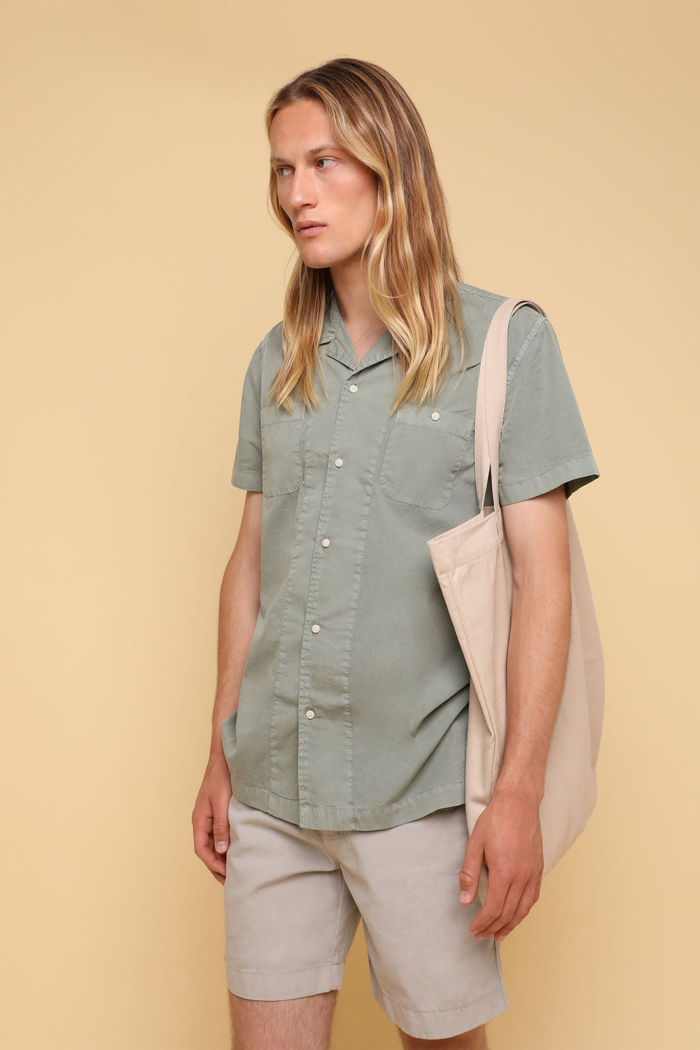 Camisa confeccionada en tejido 100% algodón lavado. Corte Regular Fit, cuello pijamero y cierre con botones. Manga corta y detalle de bolsillos en pecho.
