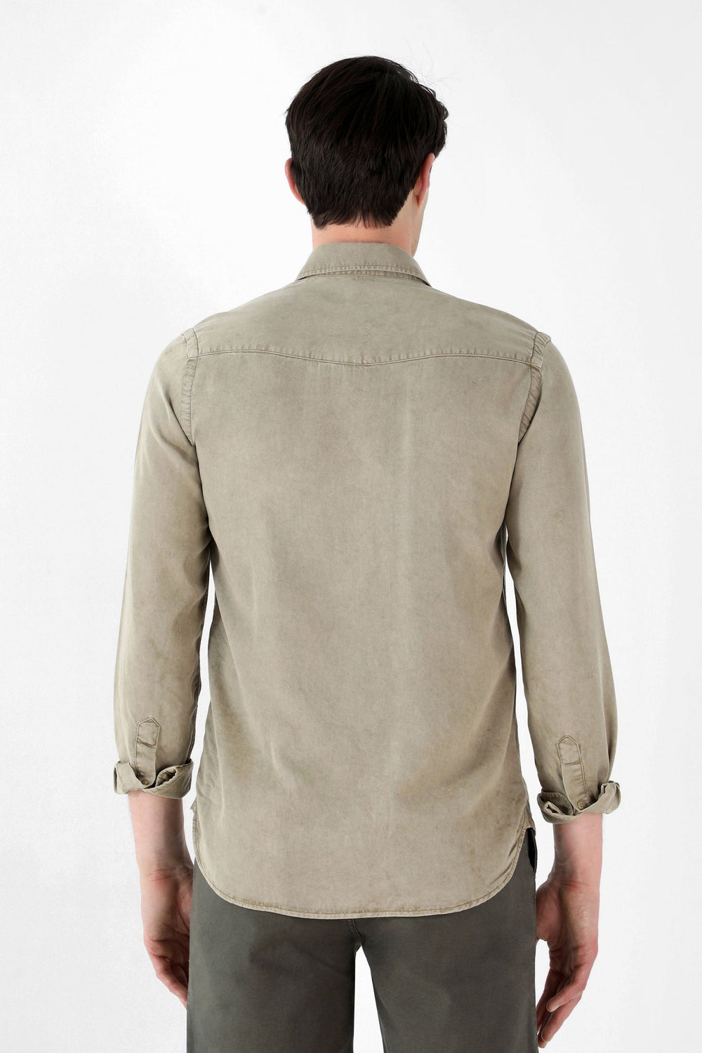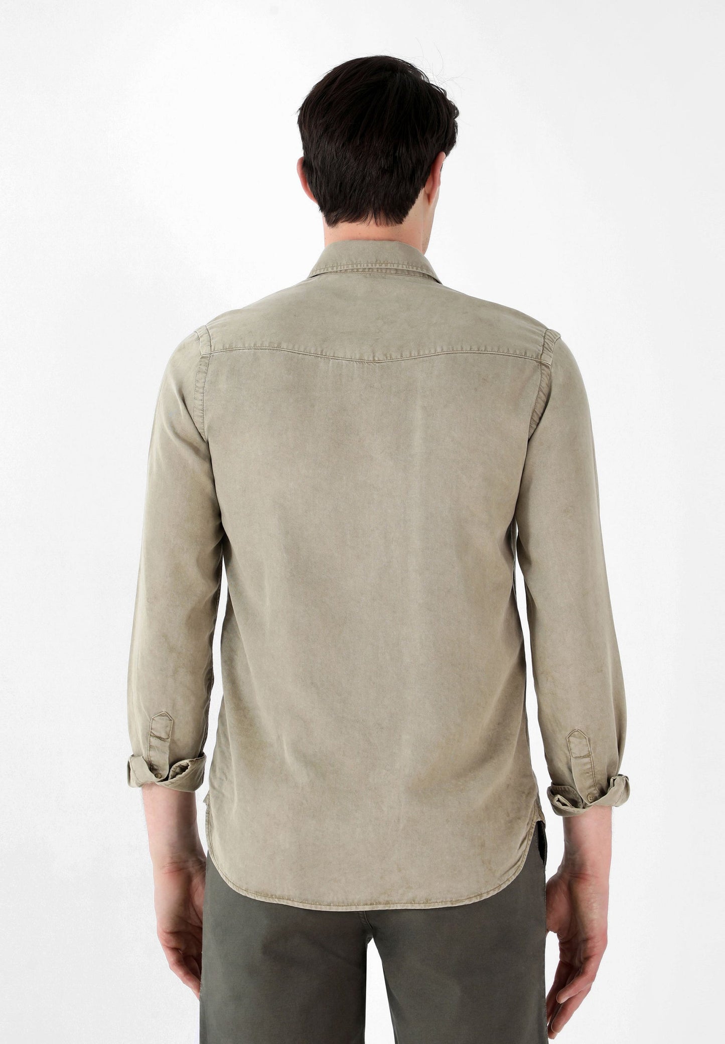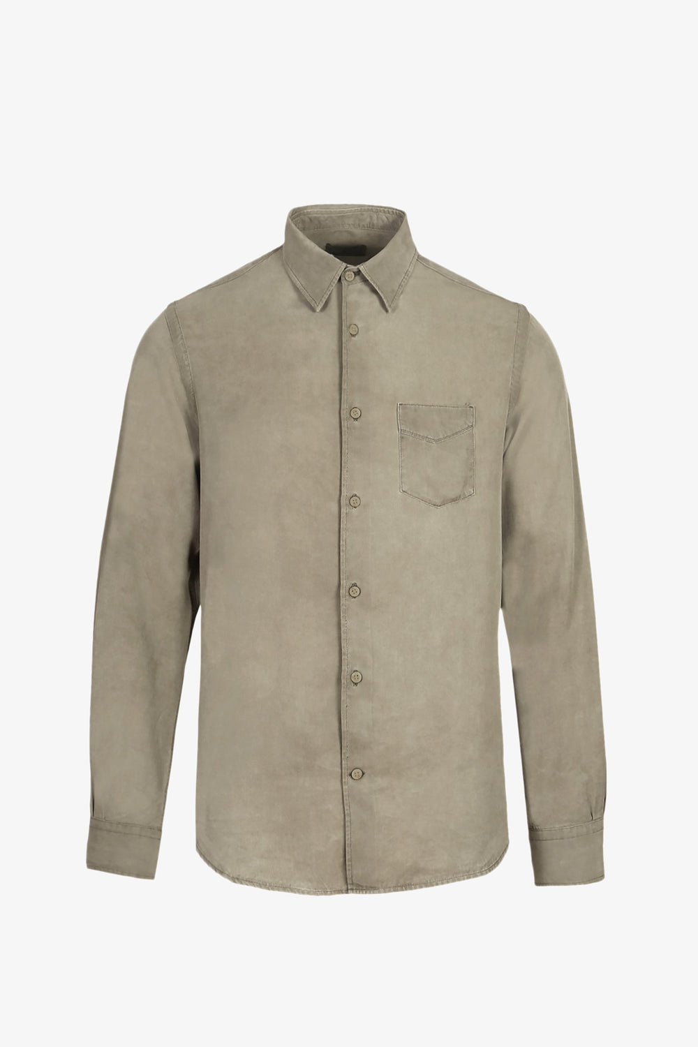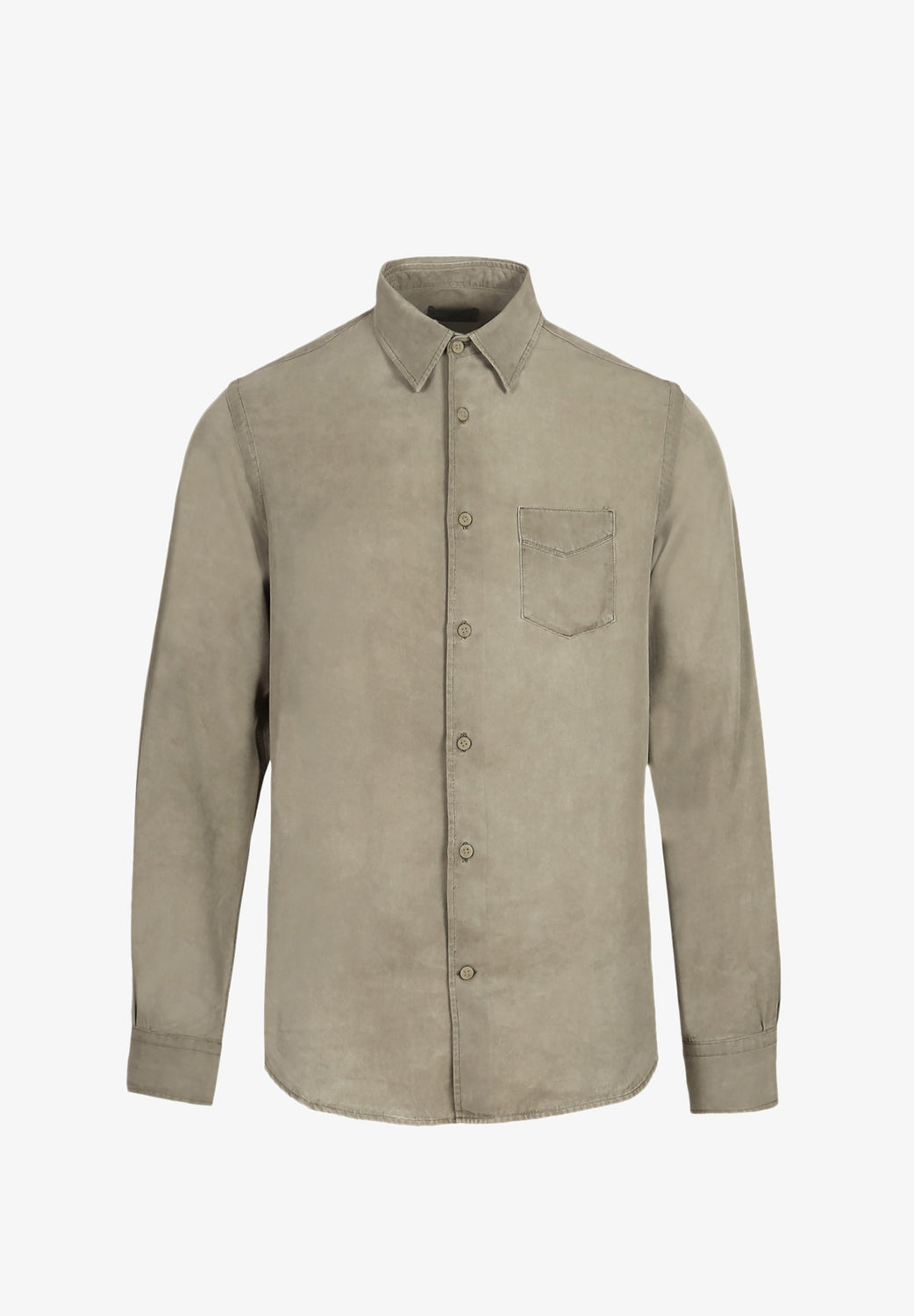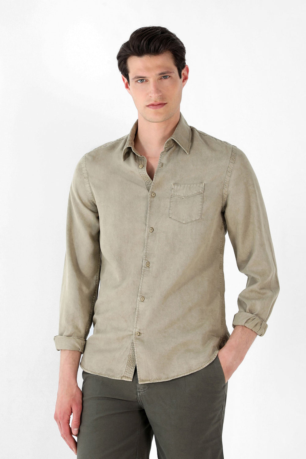 Camisa confeccionada en tejido 100% tencel. Corte Regular Fit, cuello clásico y cierre con botones. Manga larga terminada en puño con botones y bolsillo en el pecho.