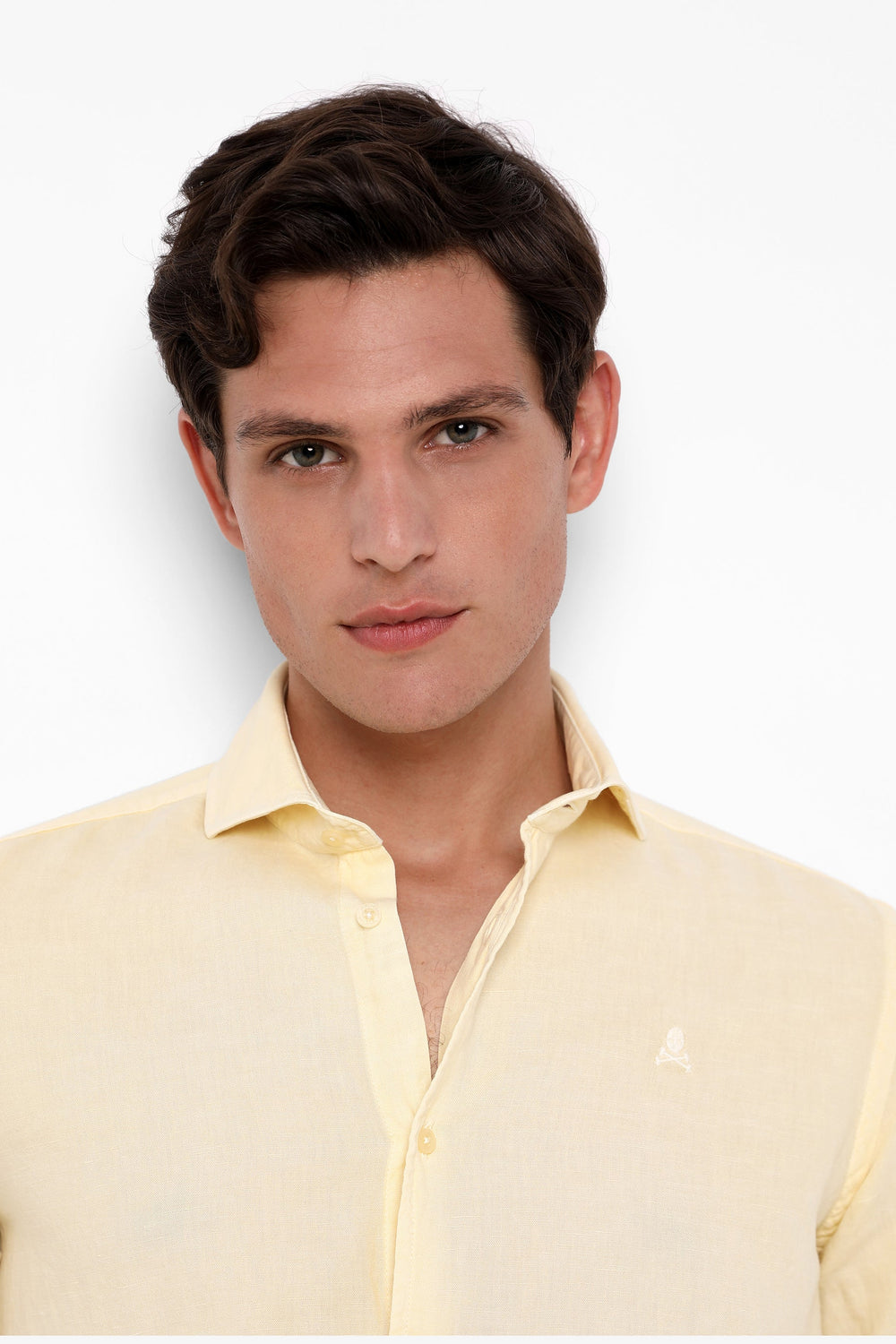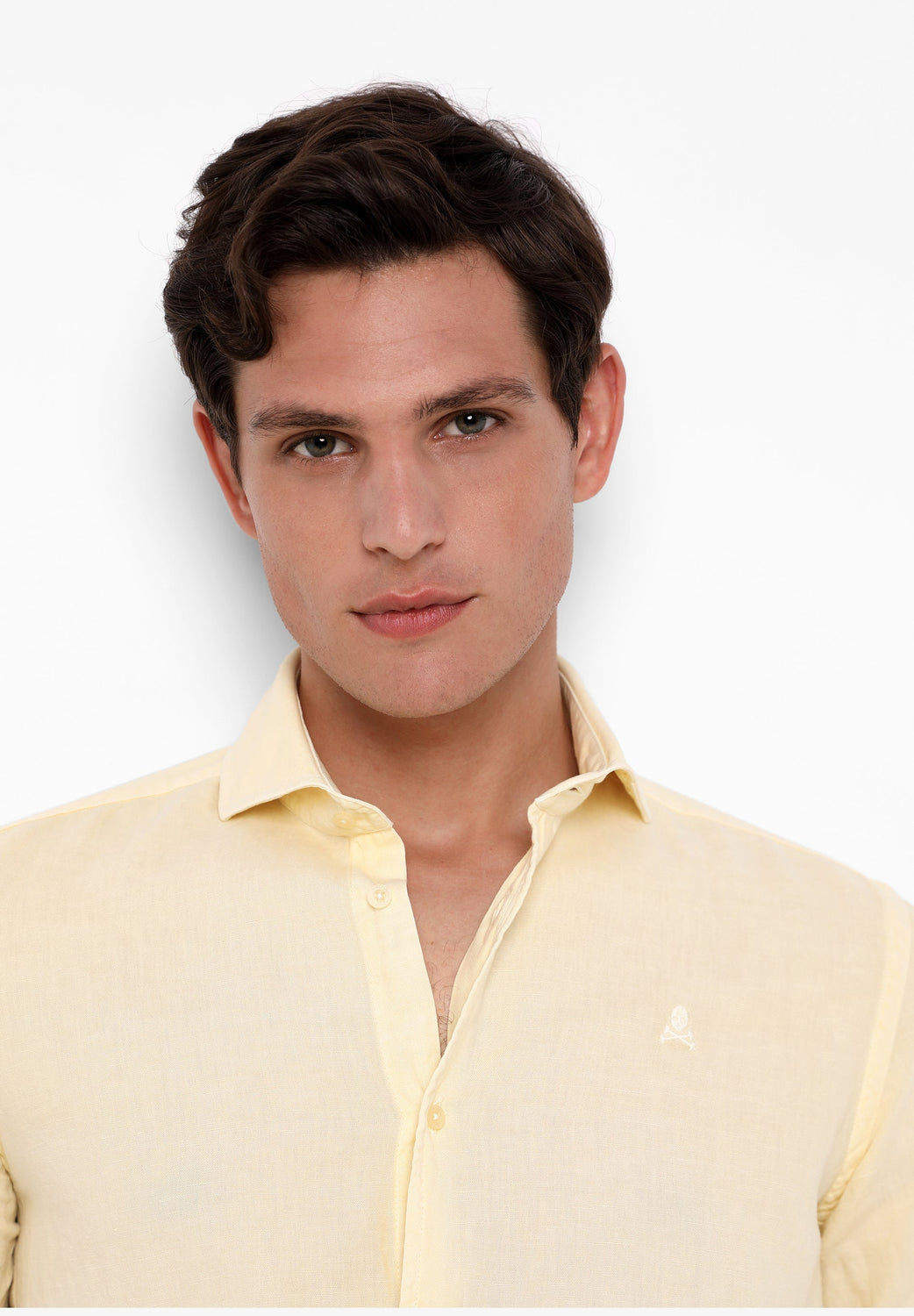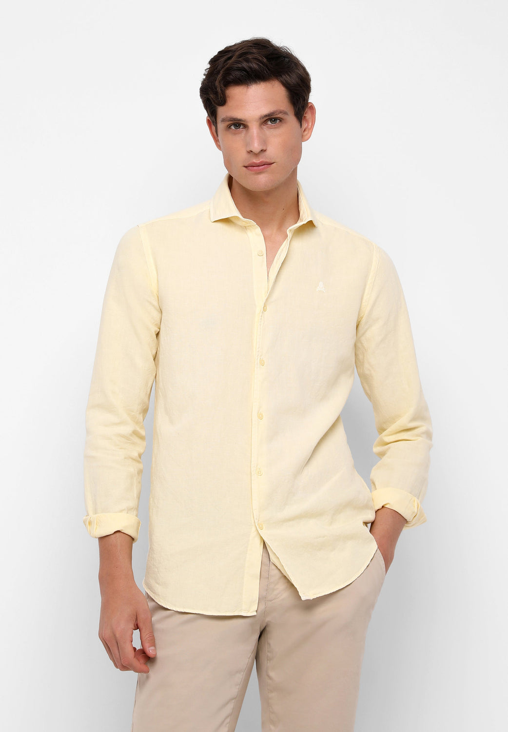 Camisa confeccionada en tejido mezcla de algodón y lino. Corte Regular Fit, cuello cutaway y cierre con botones. Manga larga terminada en puño con botones y detalle de calavera a tono.