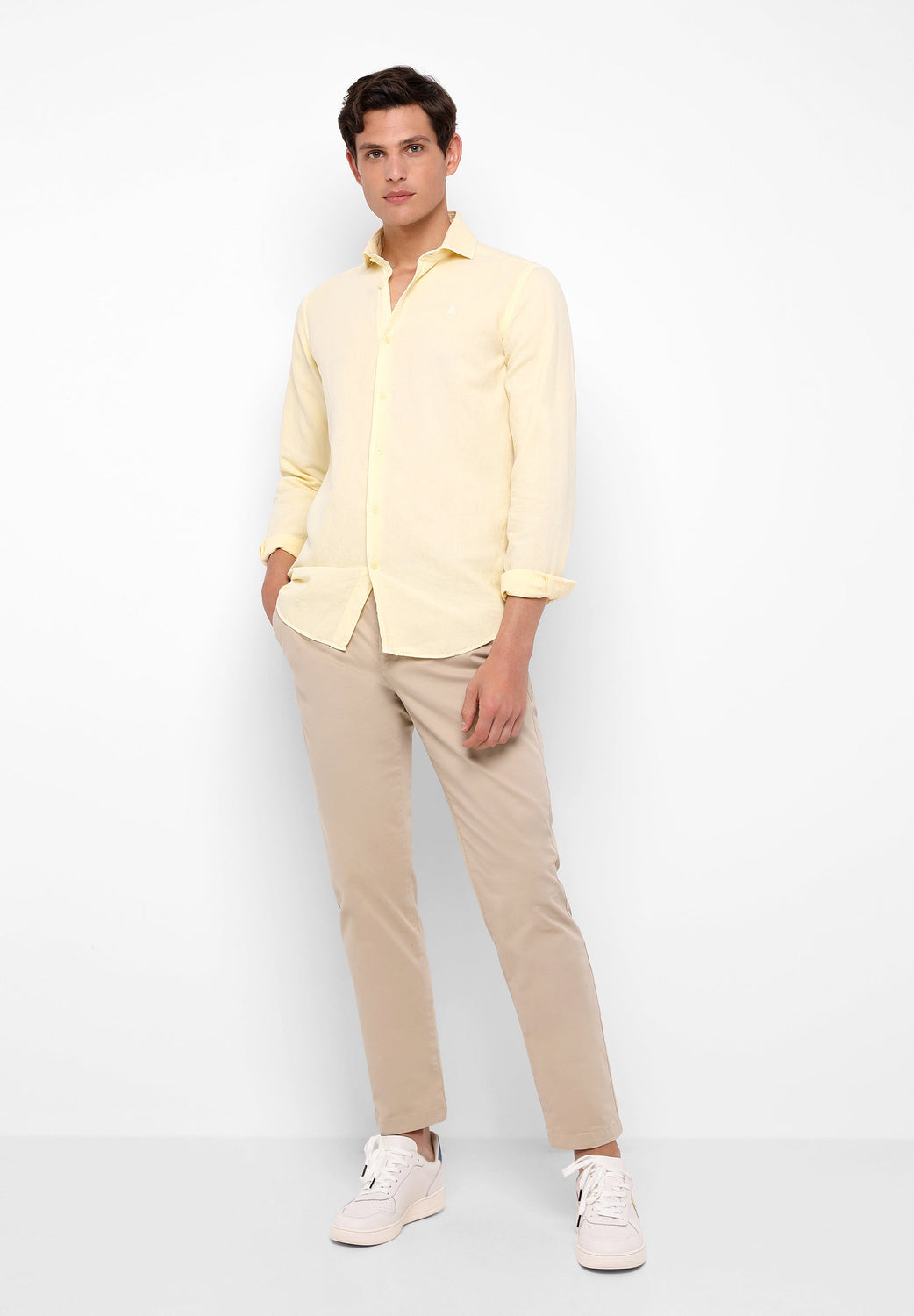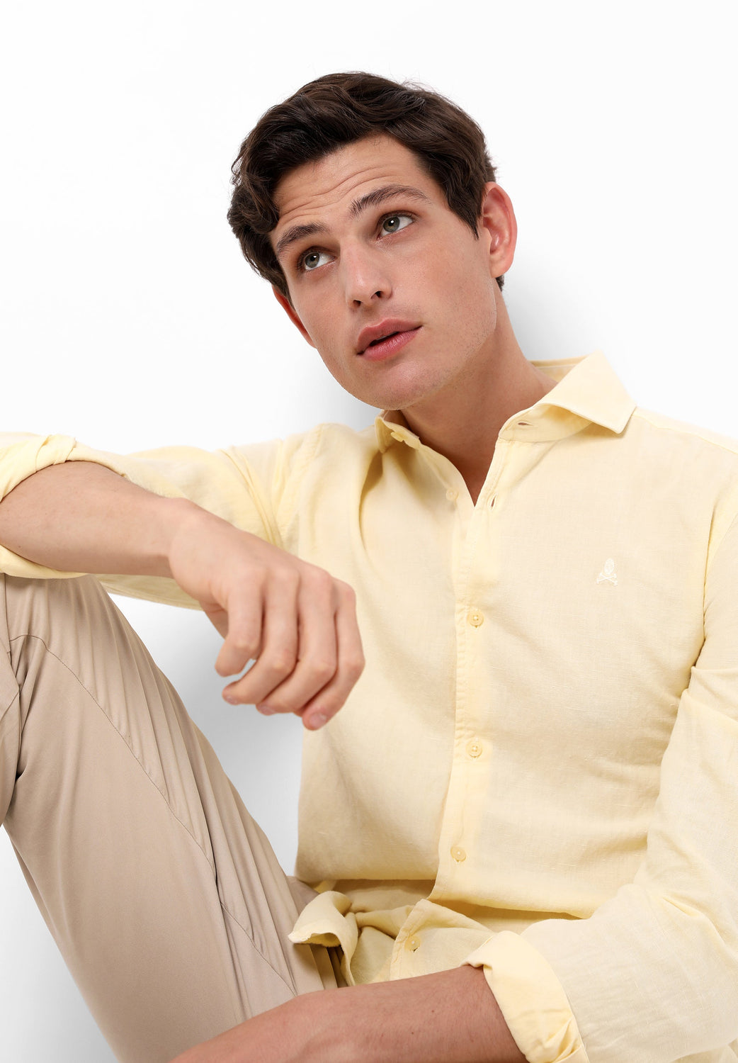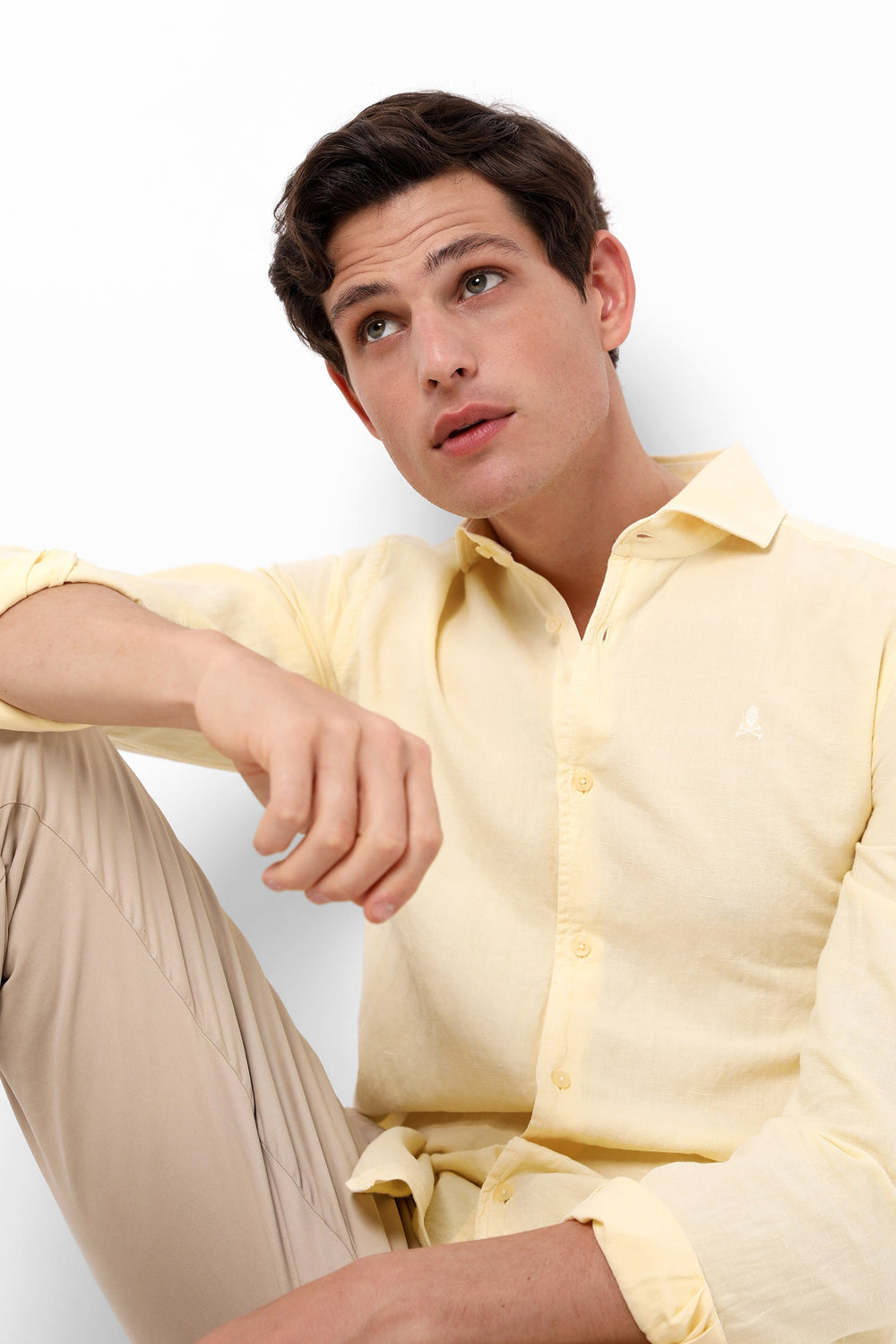 Camisa confeccionada en tejido mezcla de algodón y lino. Corte Regular Fit, cuello cutaway y cierre con botones. Manga larga terminada en puño con botones y detalle de calavera a tono.