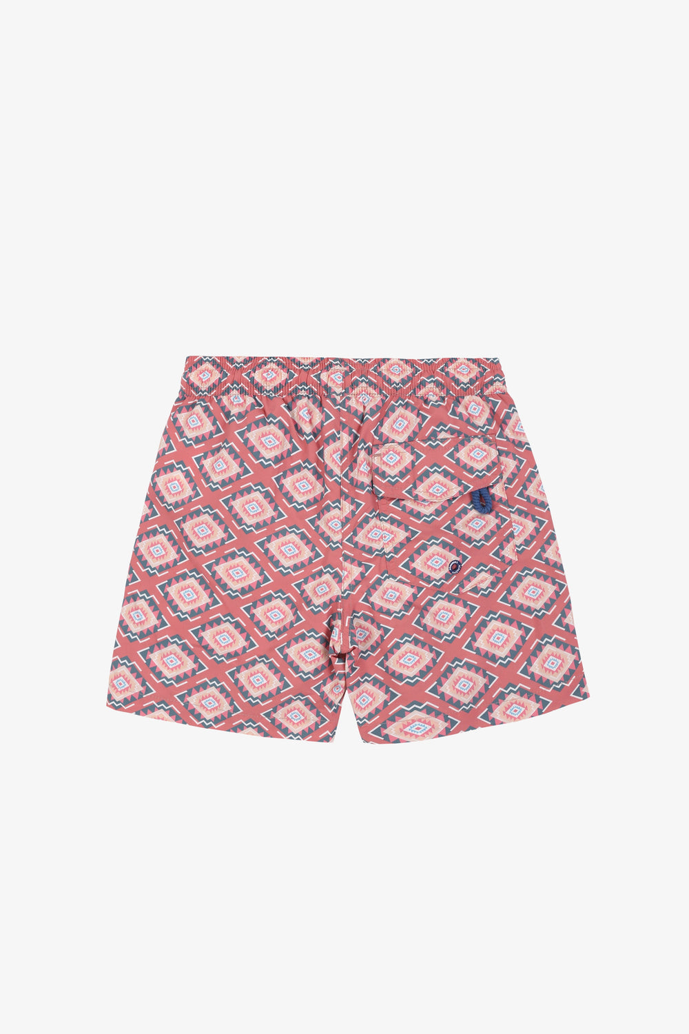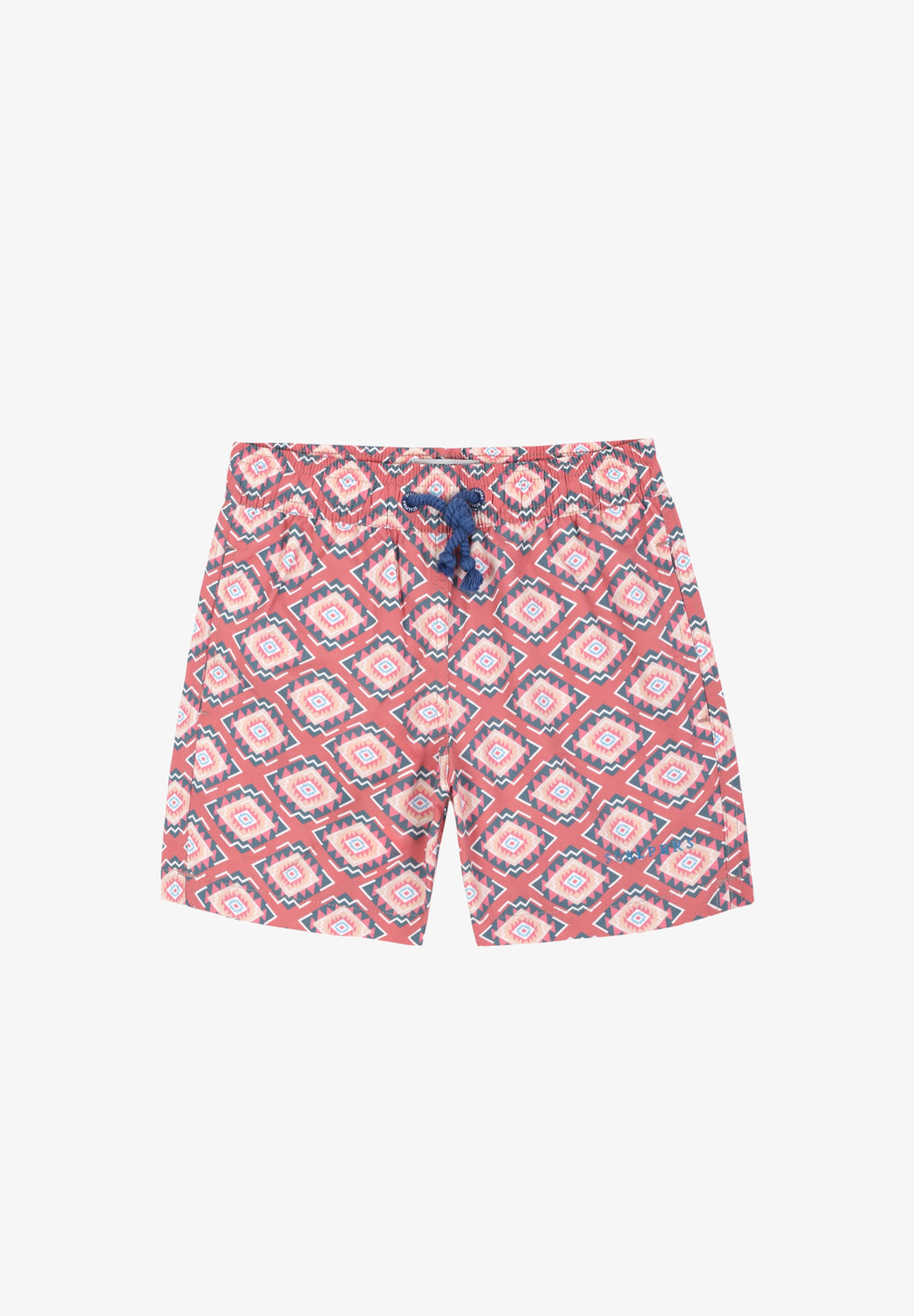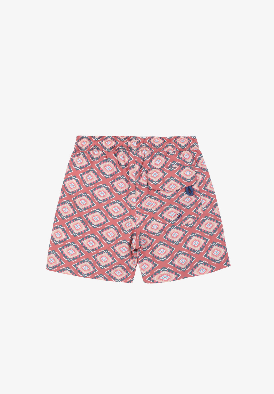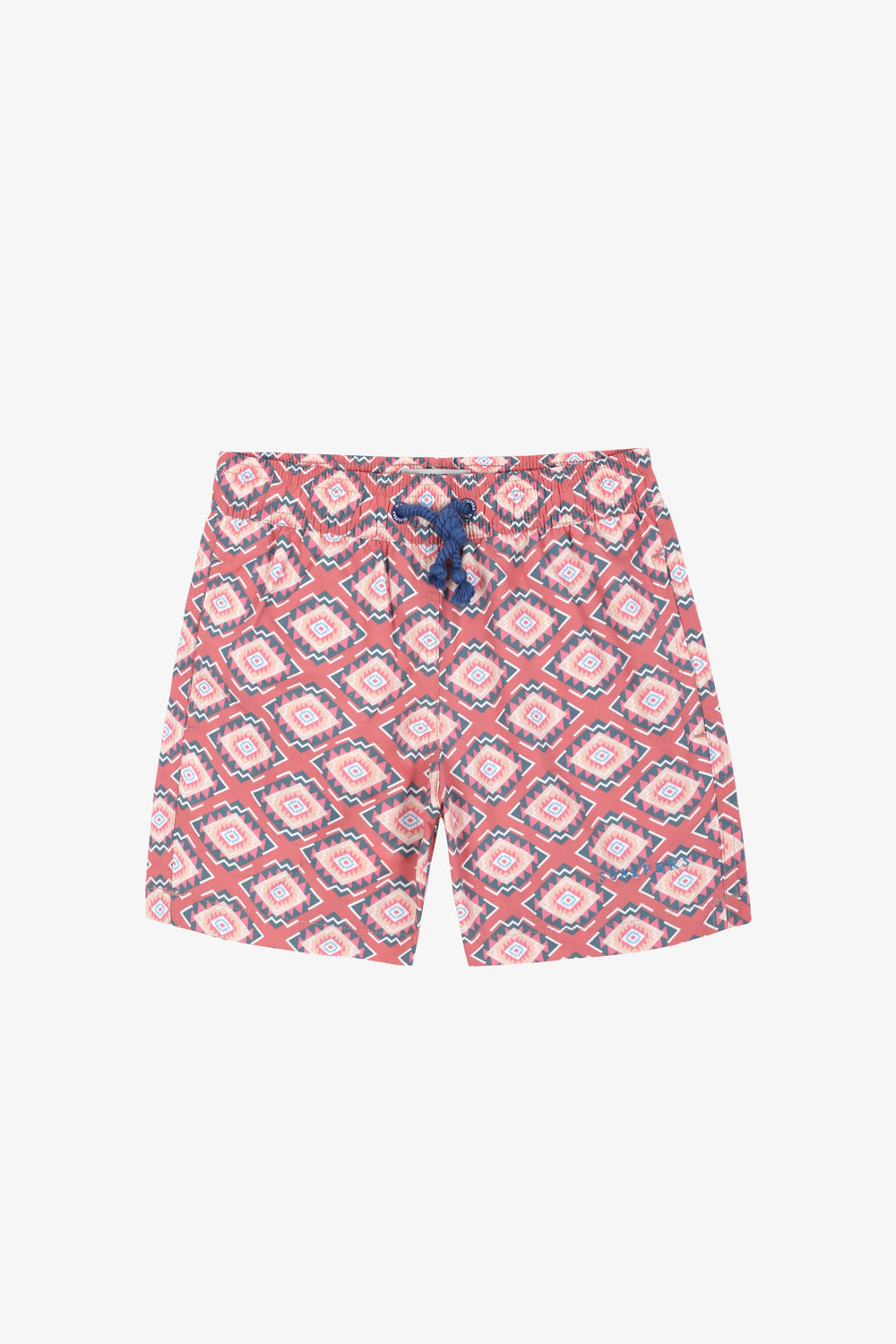 Bañador con estampado de ikat confeccionado en tejido de poliéster. Corte Regular Fit, cierre con cordón y detalle de calavera engomada en el bajo.