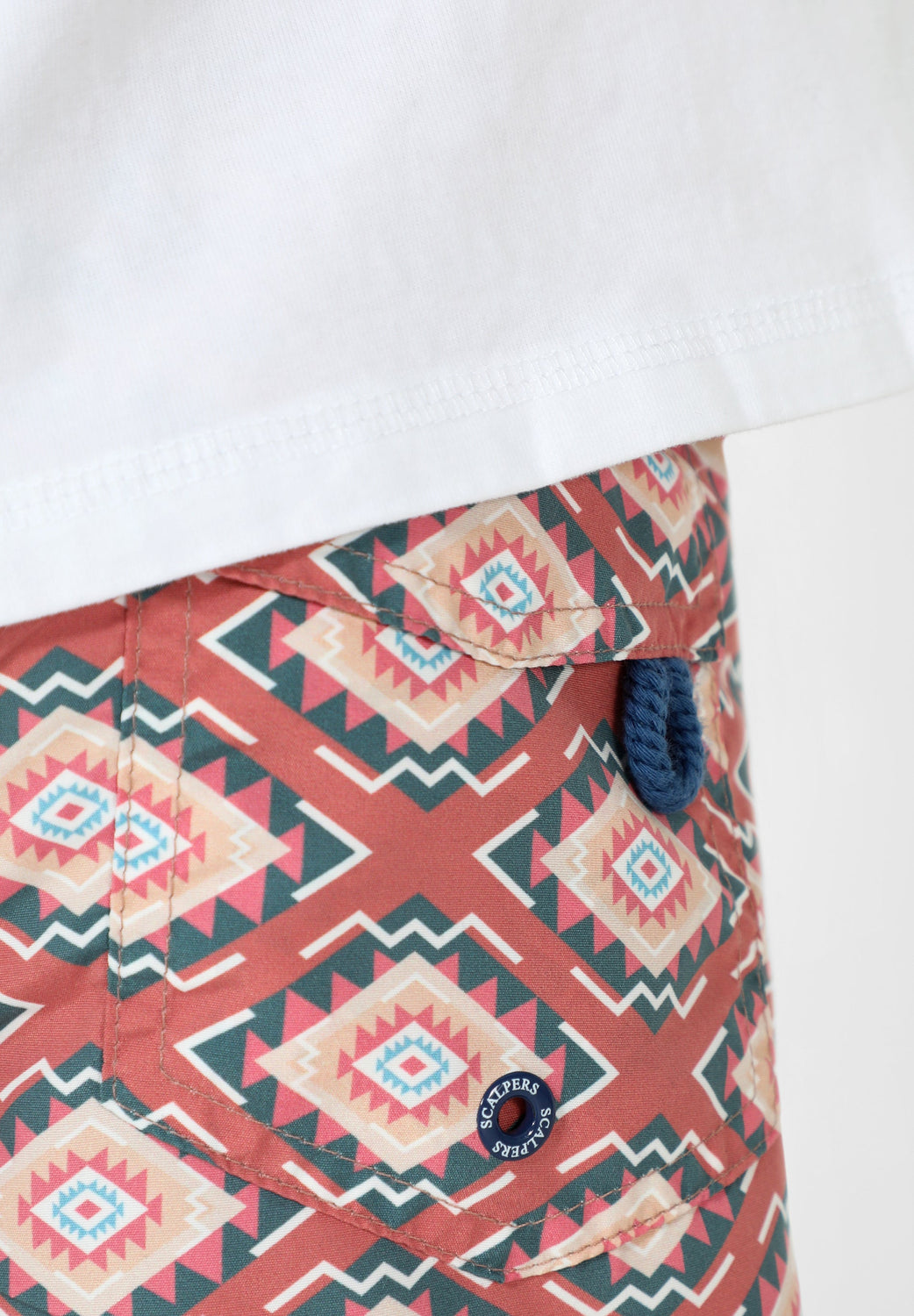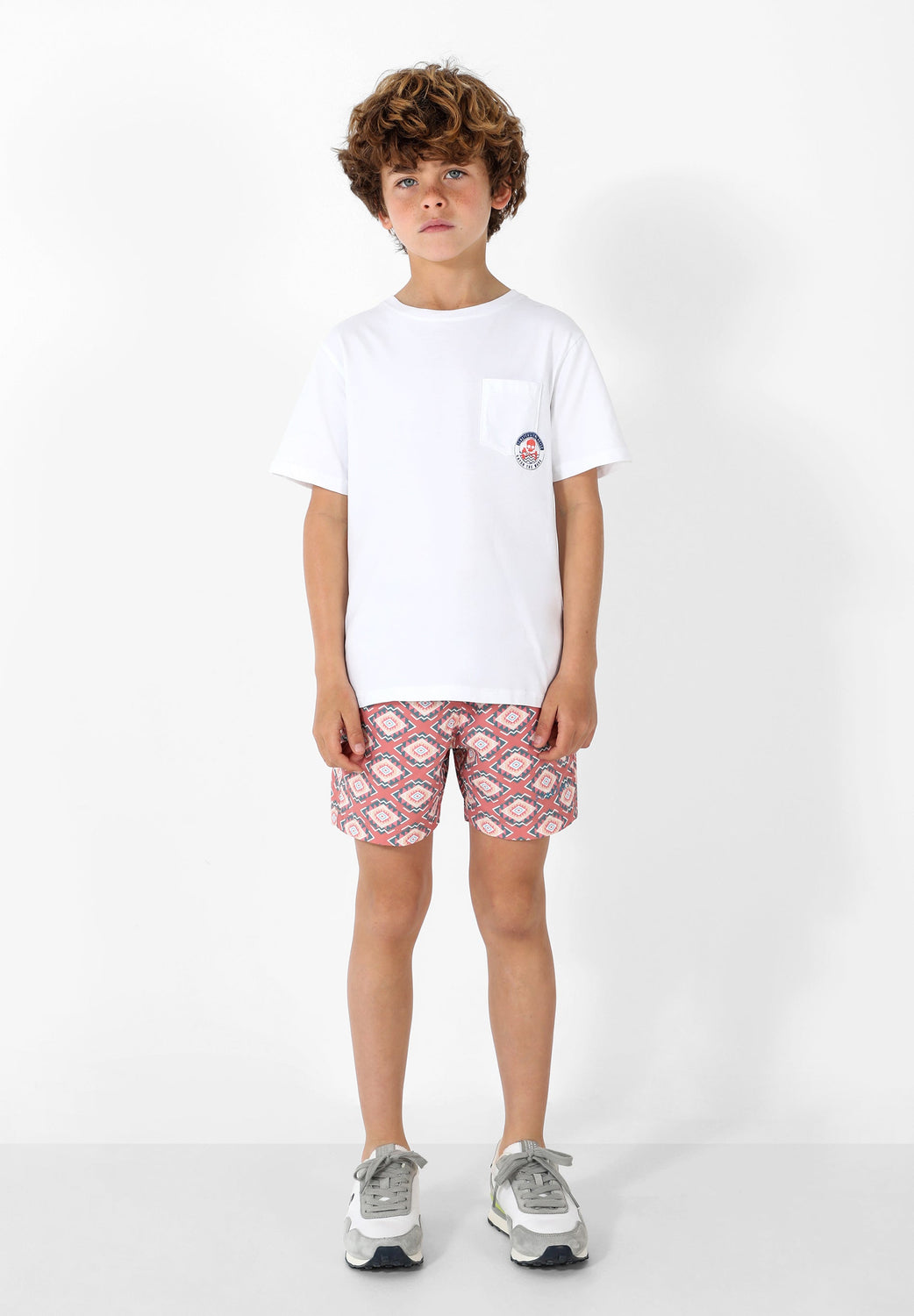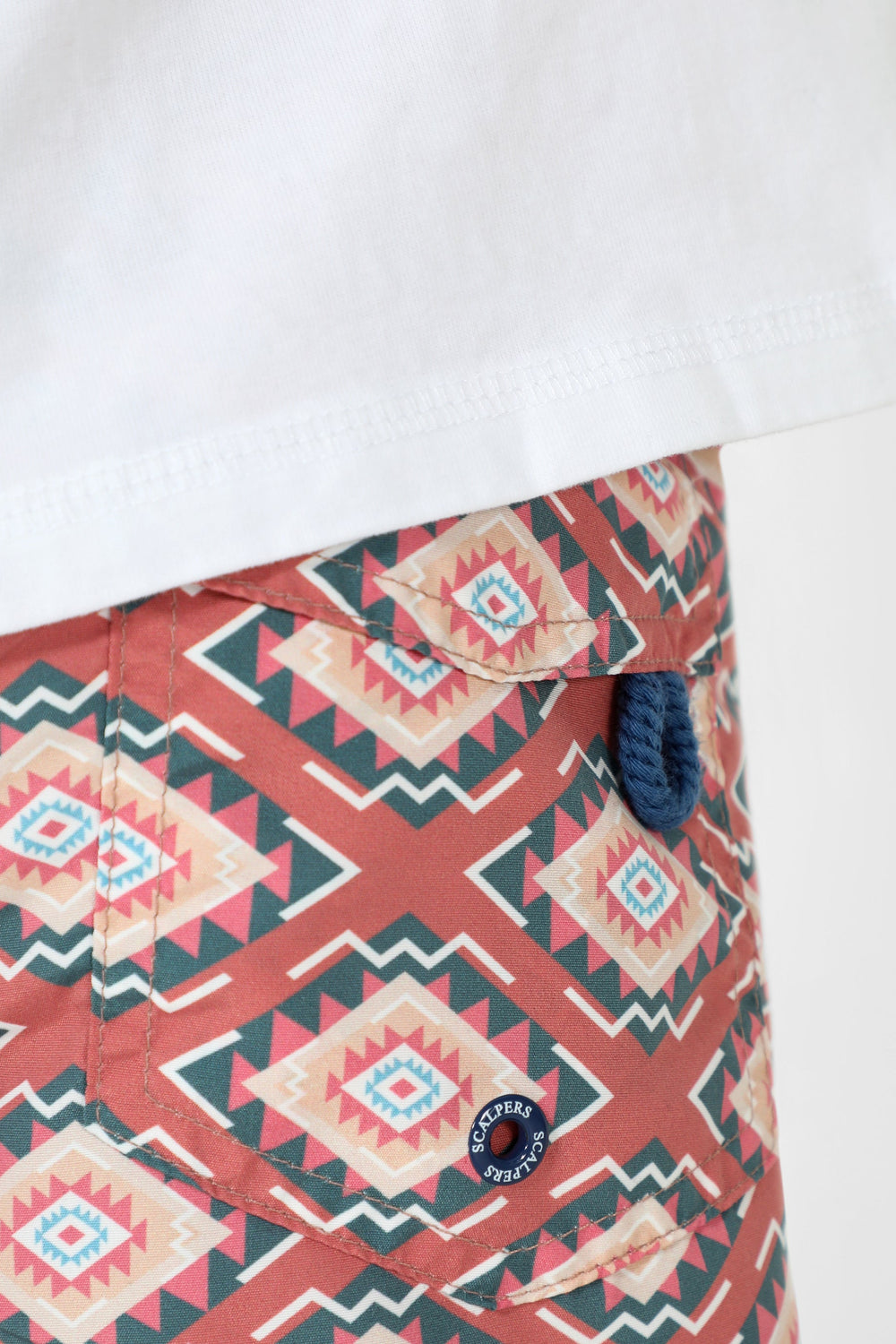Bañador con estampado de ikat confeccionado en tejido de poliéster. Corte Regular Fit, cierre con cordón y detalle de calavera engomada en el bajo.