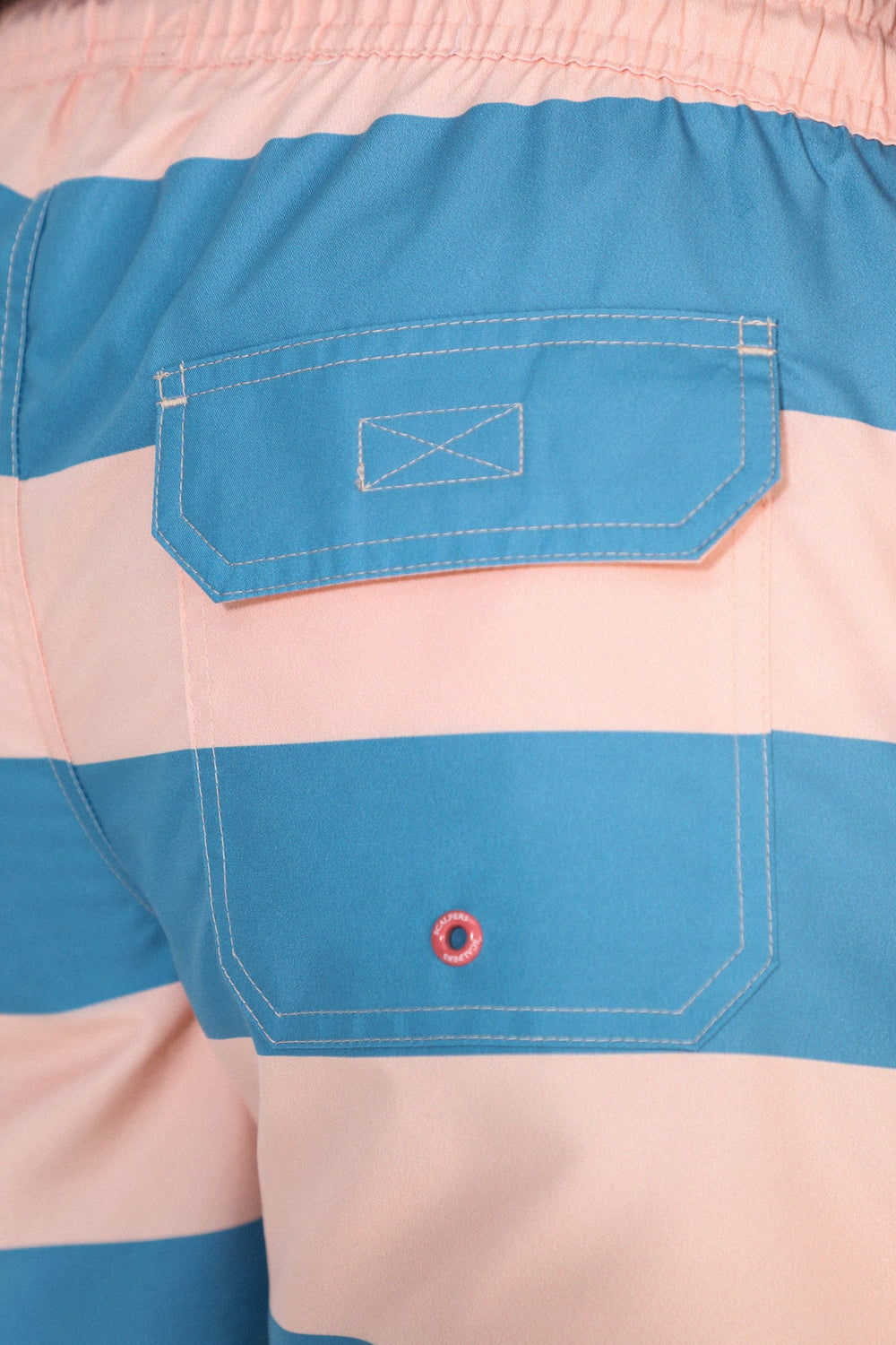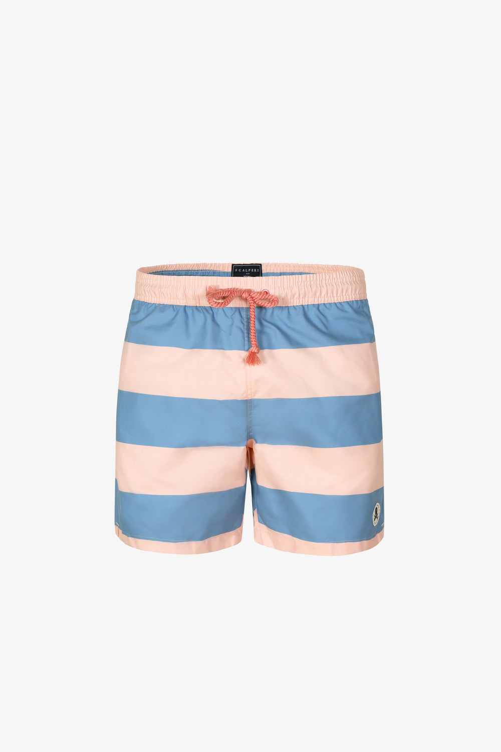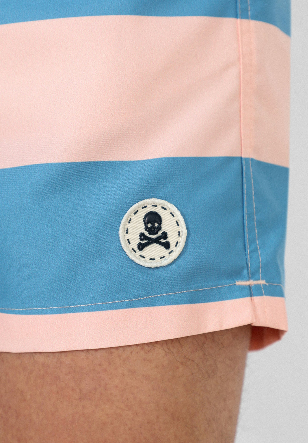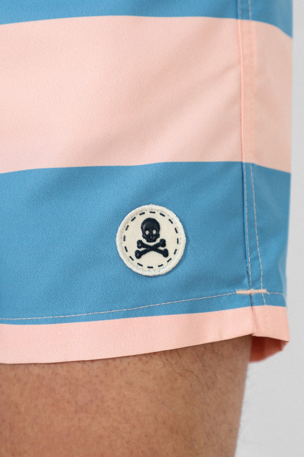 Bañador con estampado de rayas. Corte Regular Fit, cierre con cordón y cintura elástica. Bolsillos laterales y trasero y detalle de parche de calavera.
