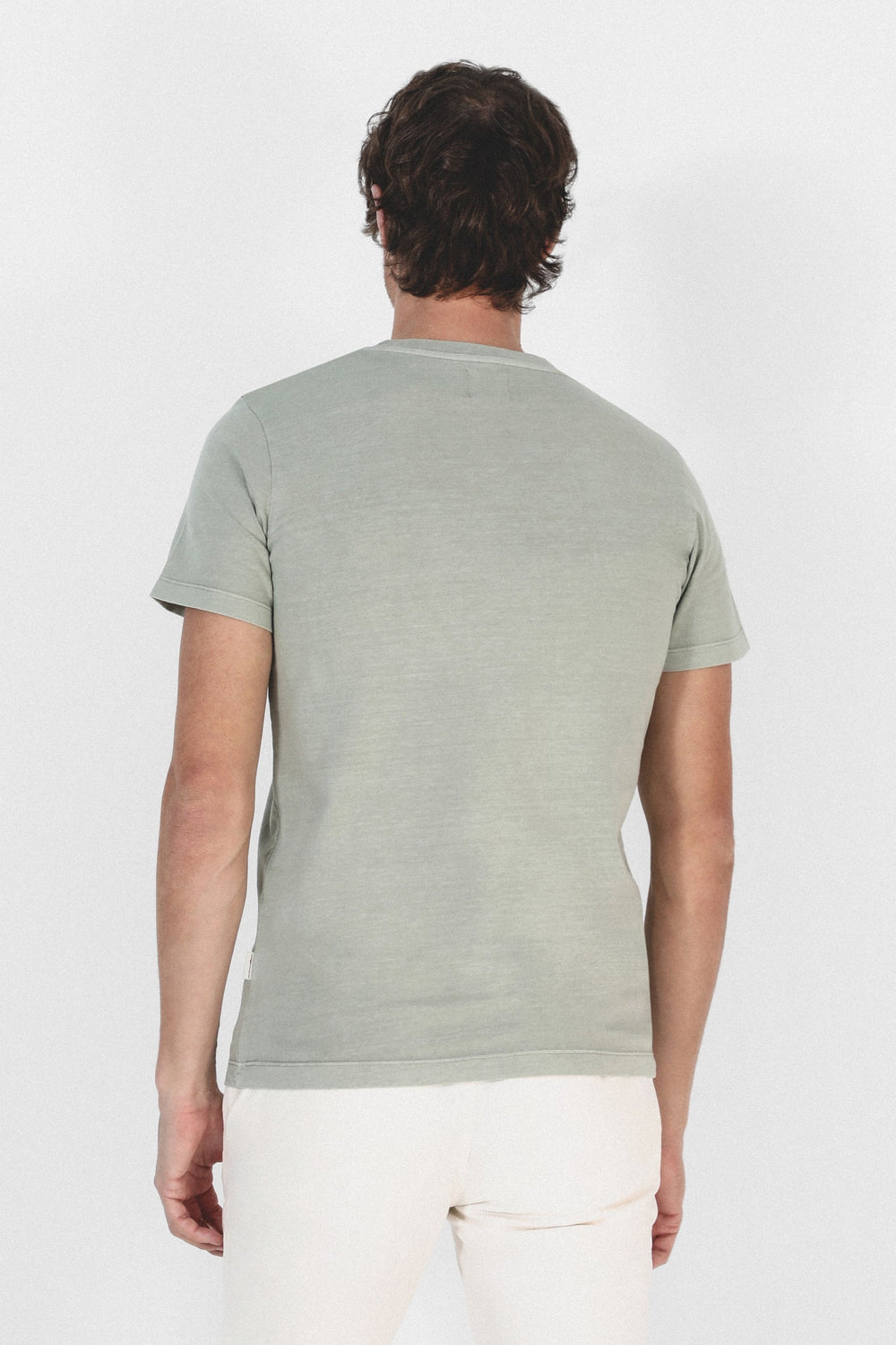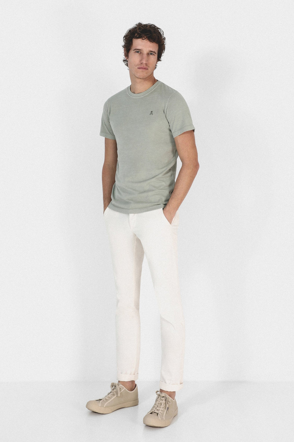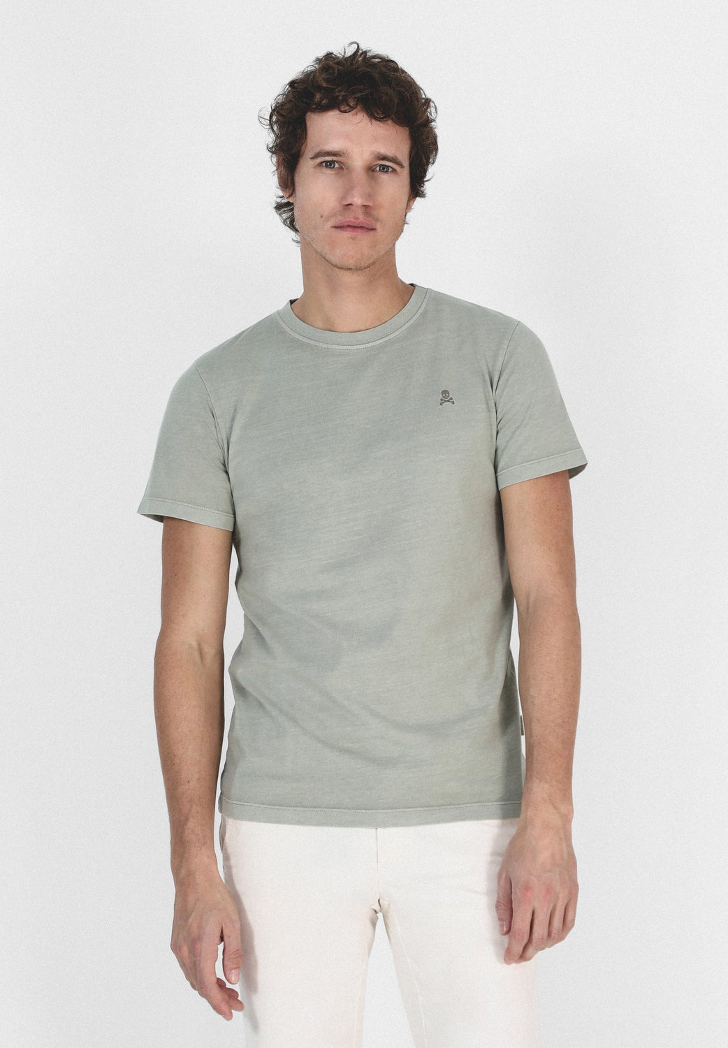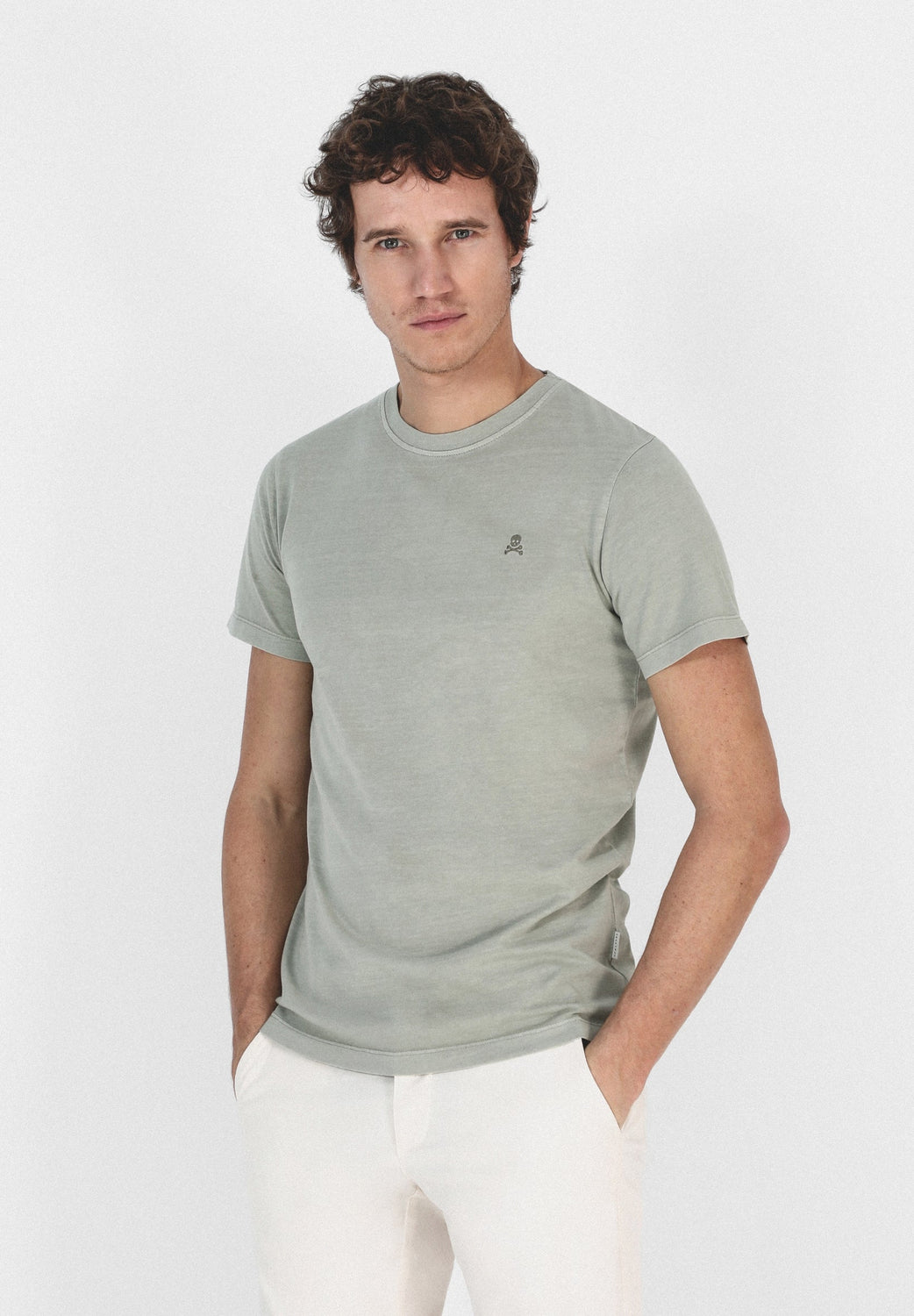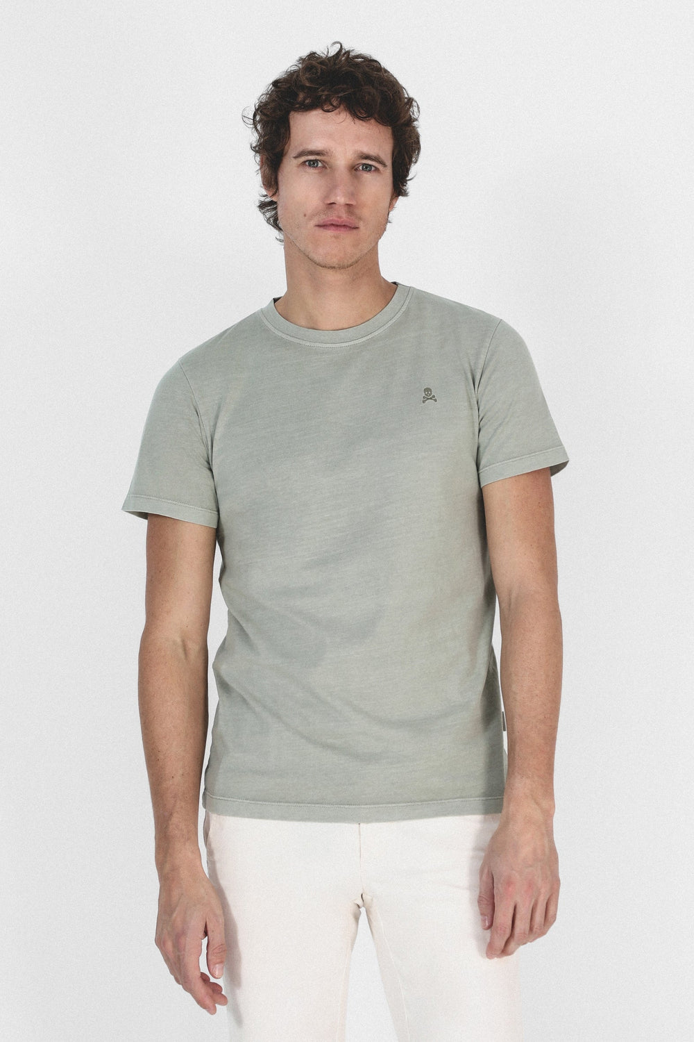 Camiseta básica confeccionada en tejido 100% algodón garment dyed. Corte Regular Fit, cuello redondo y manga corta. Detalle de calavera bordada a tono en el pecho.